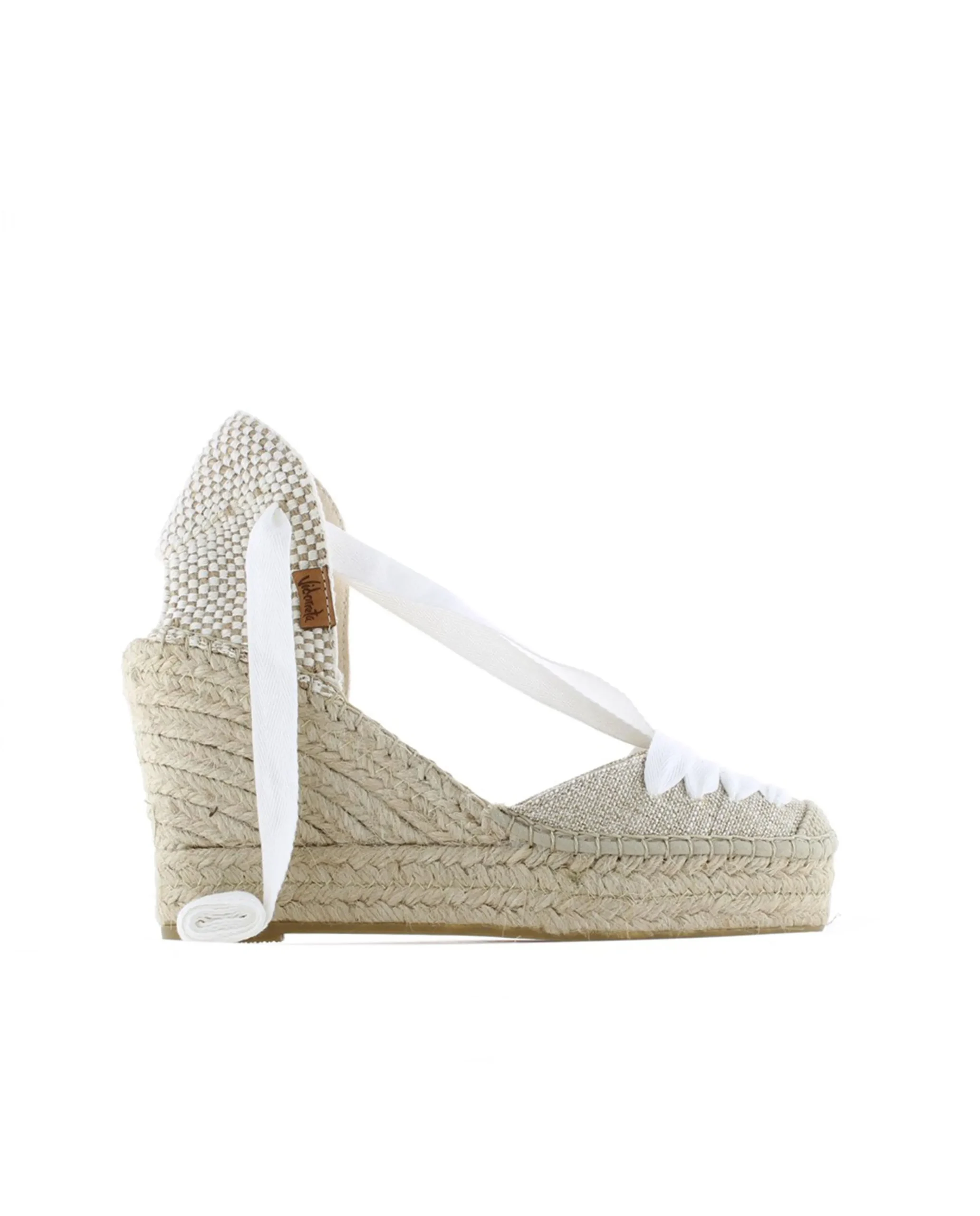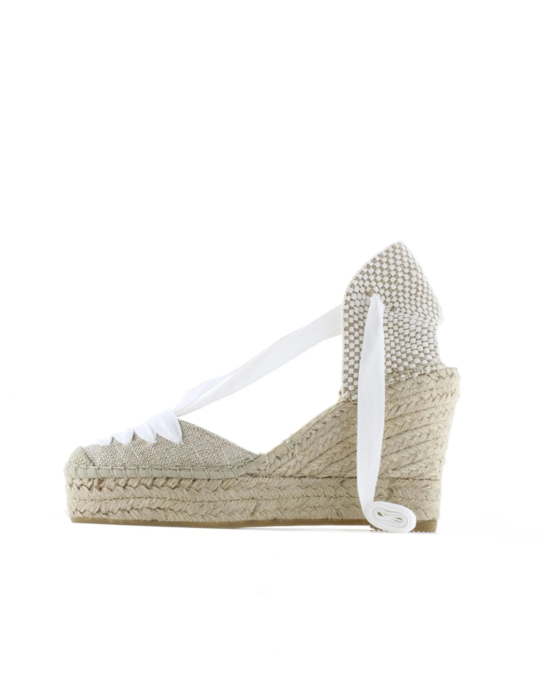 Valenciana de cuña de yute natural de 9,5 cm en lino color blanco. Plantilla de microfibra transpirable y antibacteriana.
