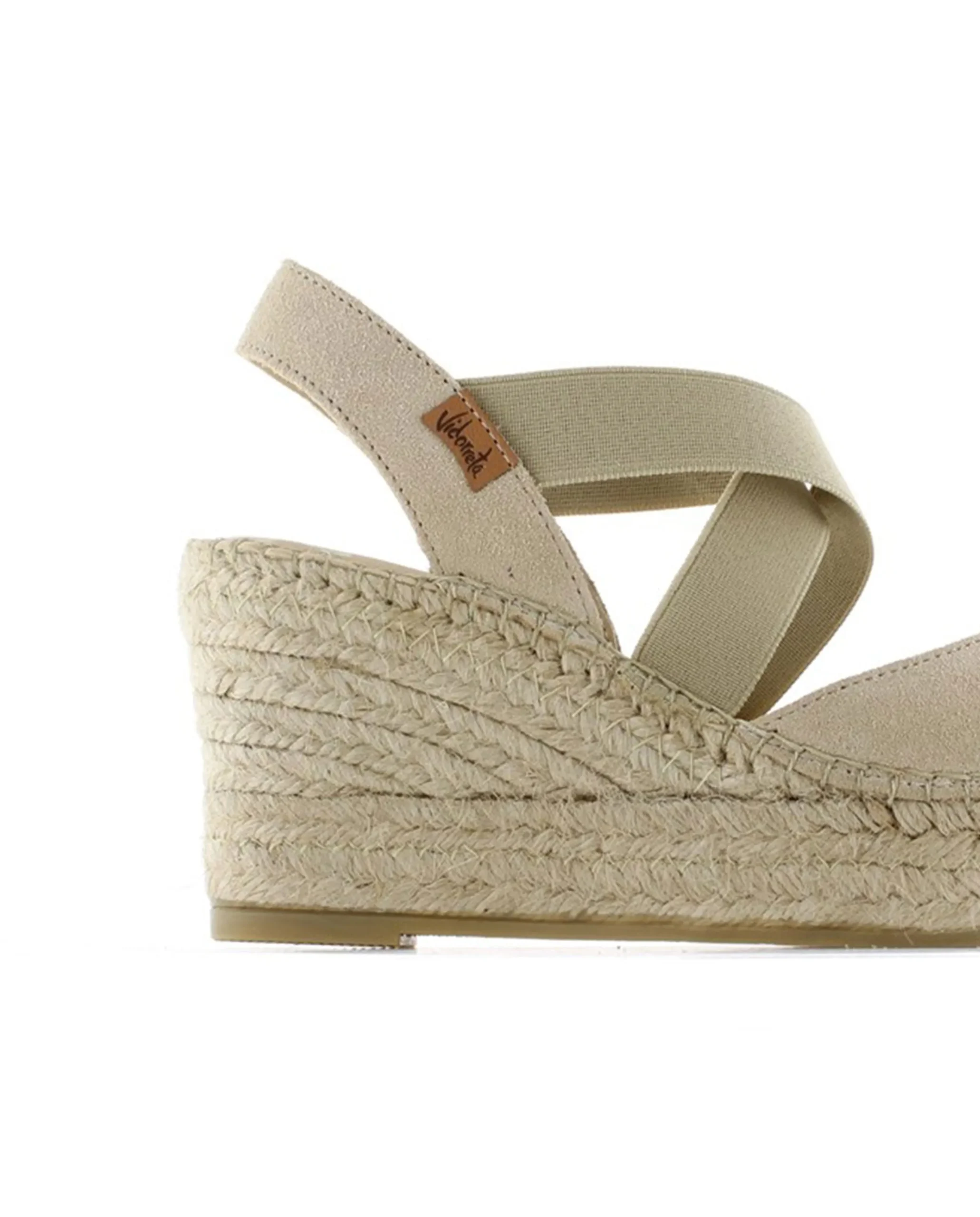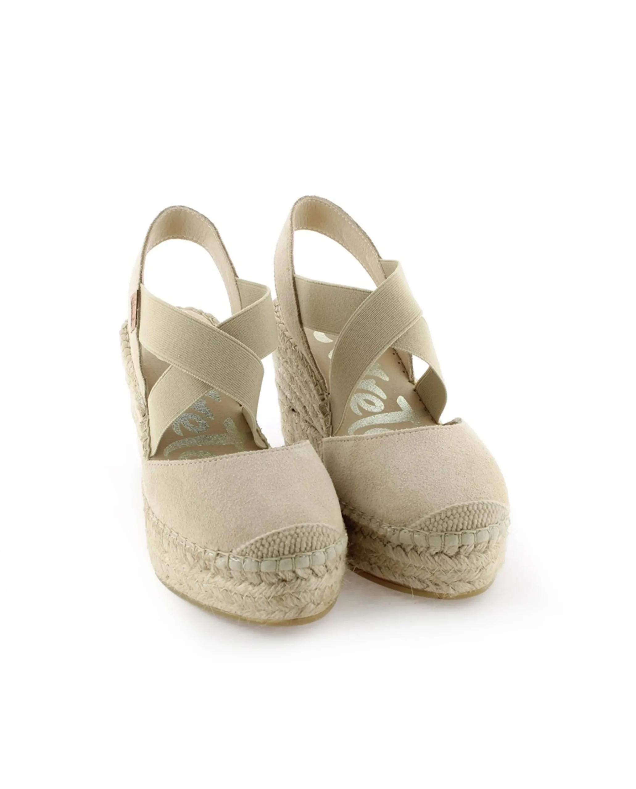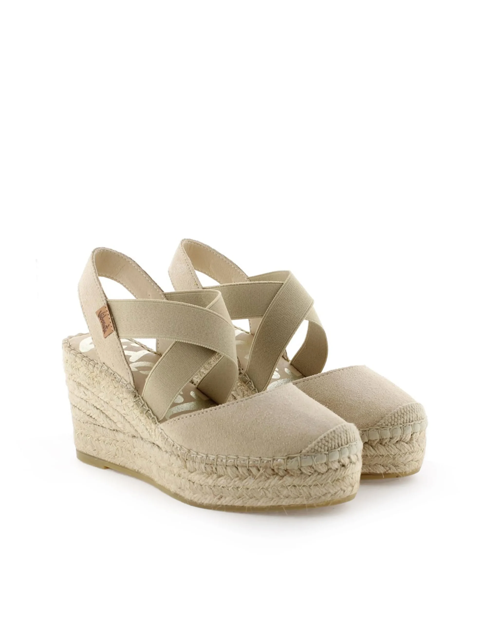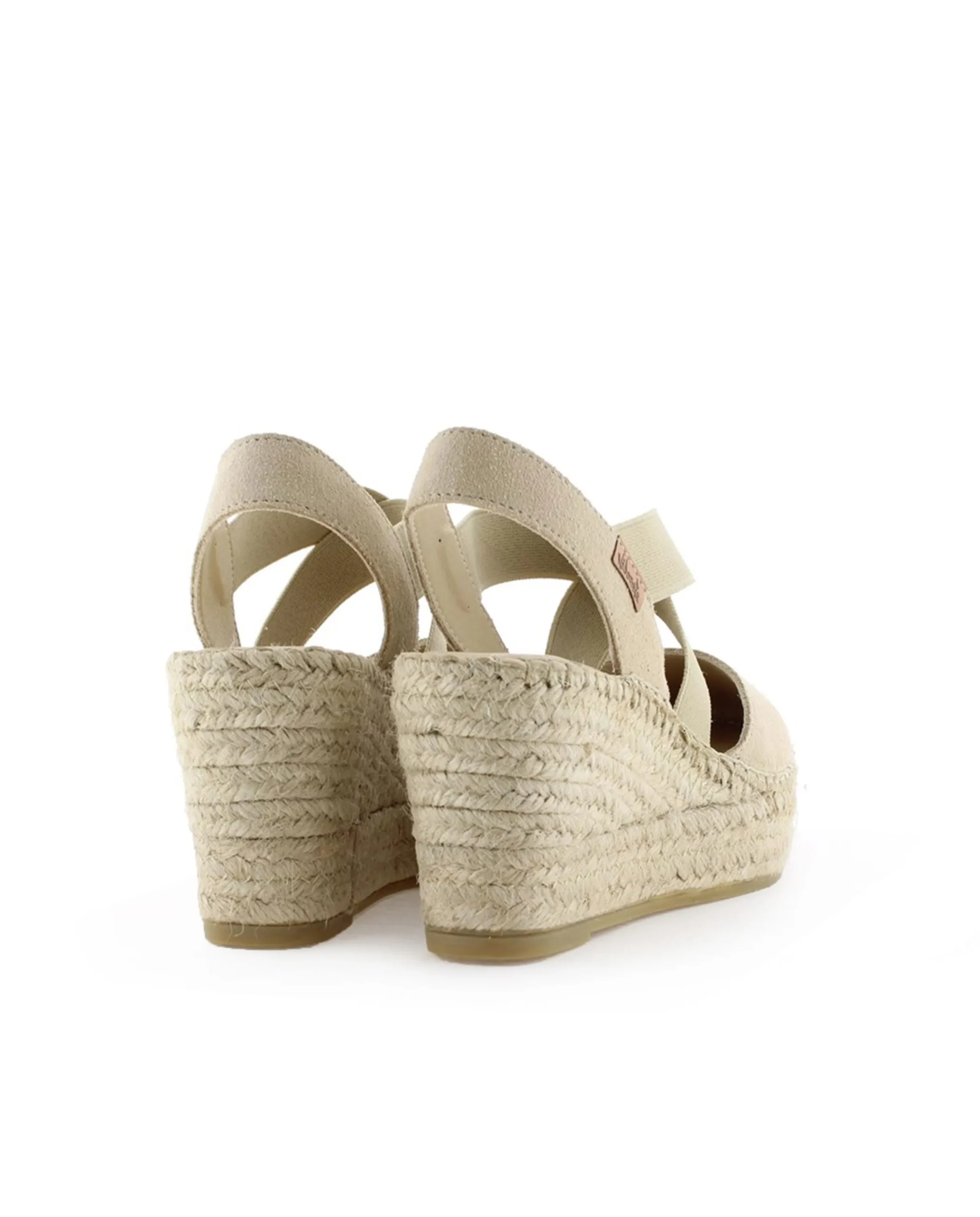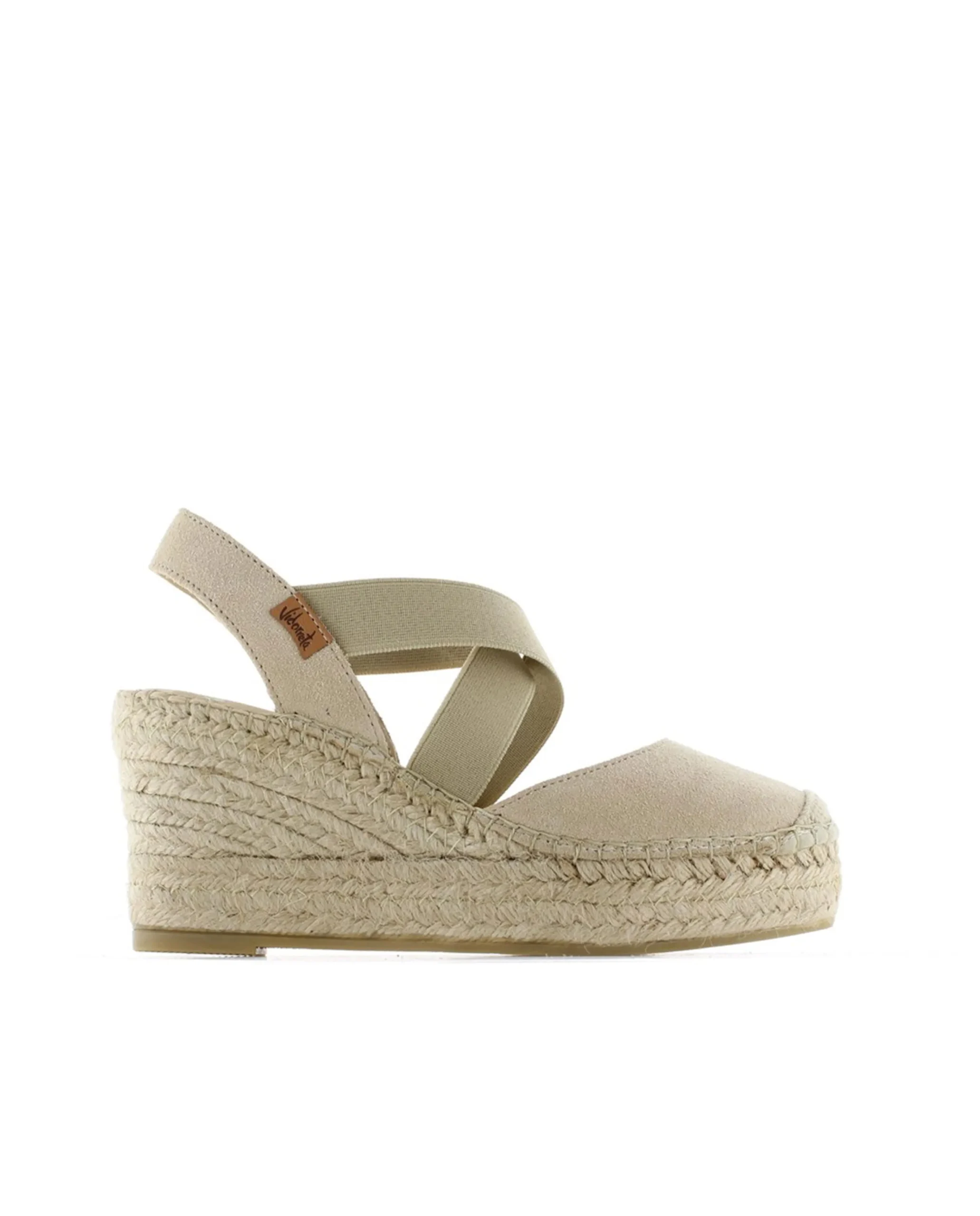Alpargata de cuña de yute natural de 8 cm en serraje color arena. Plantilla de microfibra transpirable y antibacteriana.