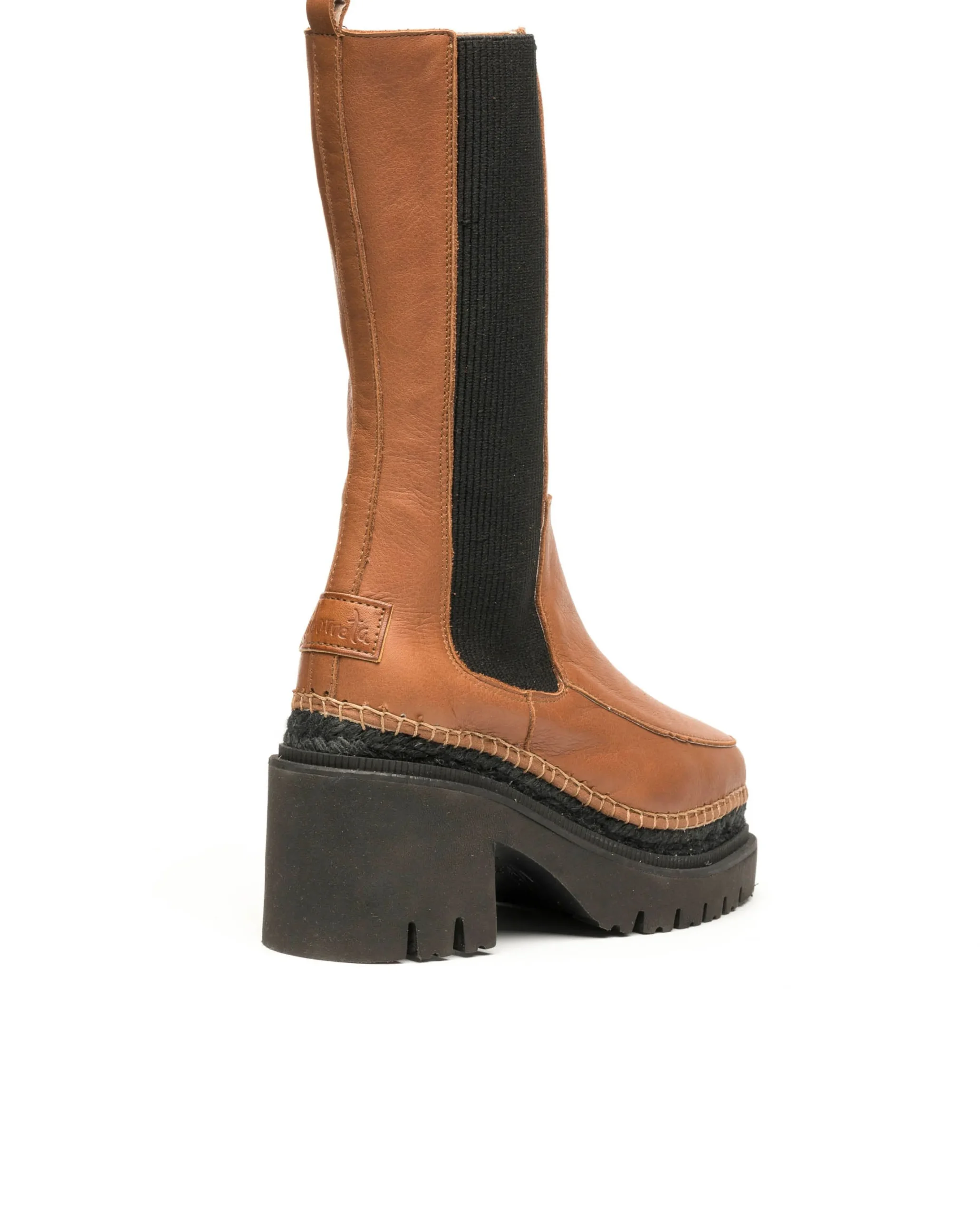 Bota alta de tacón ancho de 9 cm en piel velvet color cuero. Plantilla de microfibra transpirable y antibacteriana.