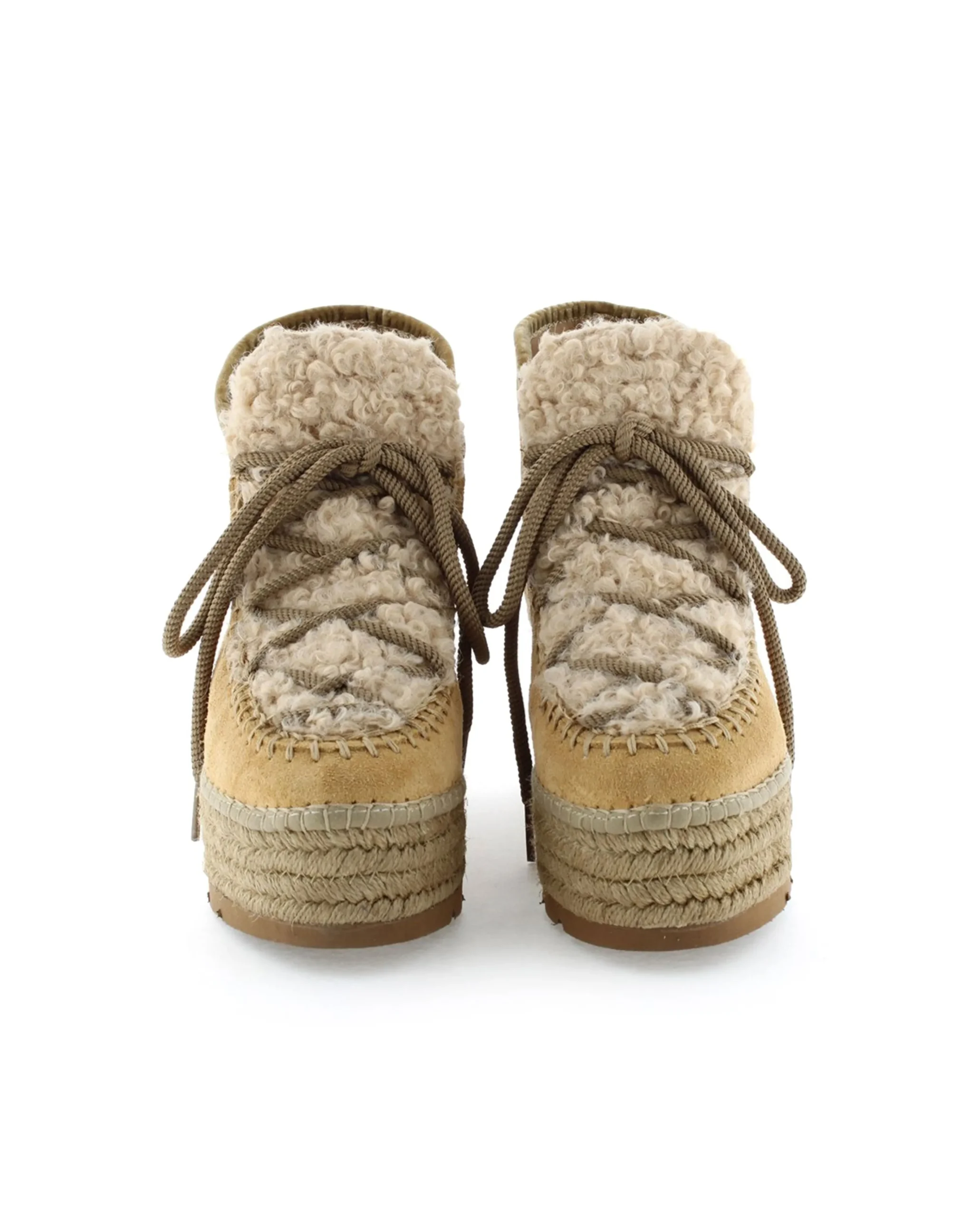Bota baja de cuña de yute natural de 7 cm en serraje color camel. Plantilla de microfibra transpirable y antibacteriana.