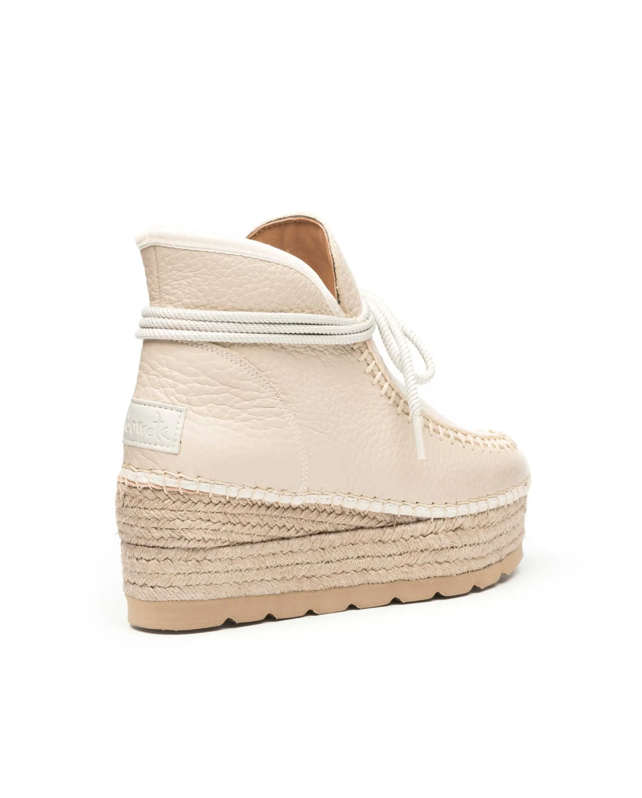 Bota baja de cuña de yute natural de 7 cm en piel bost color crudo. Plantilla de microfibra transpirable y antibacteriana.