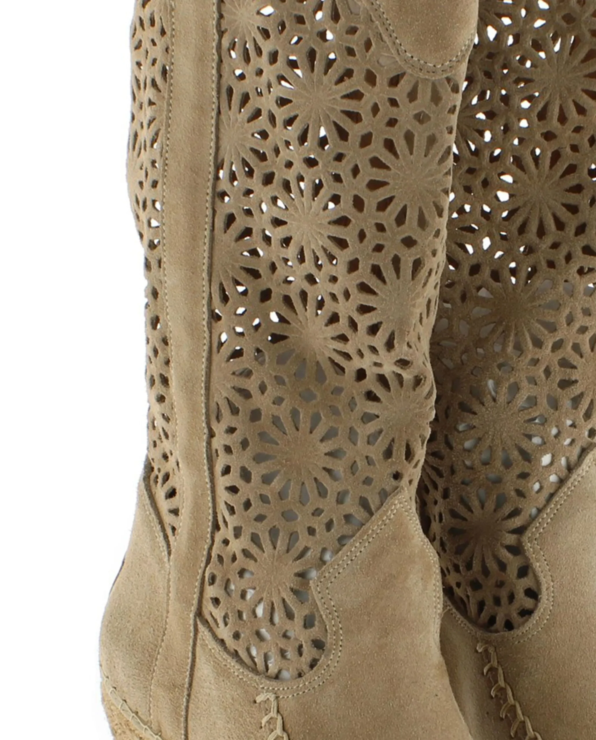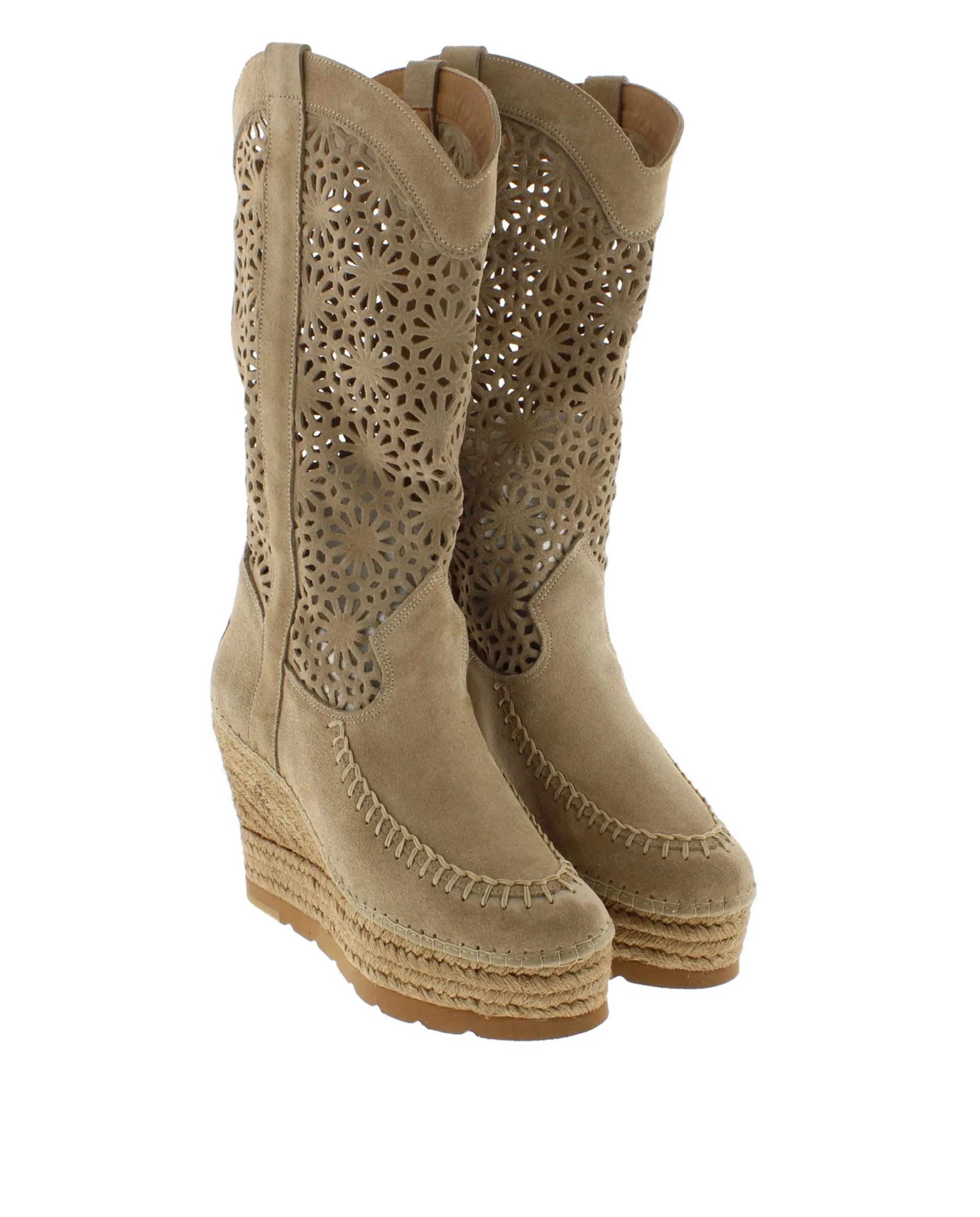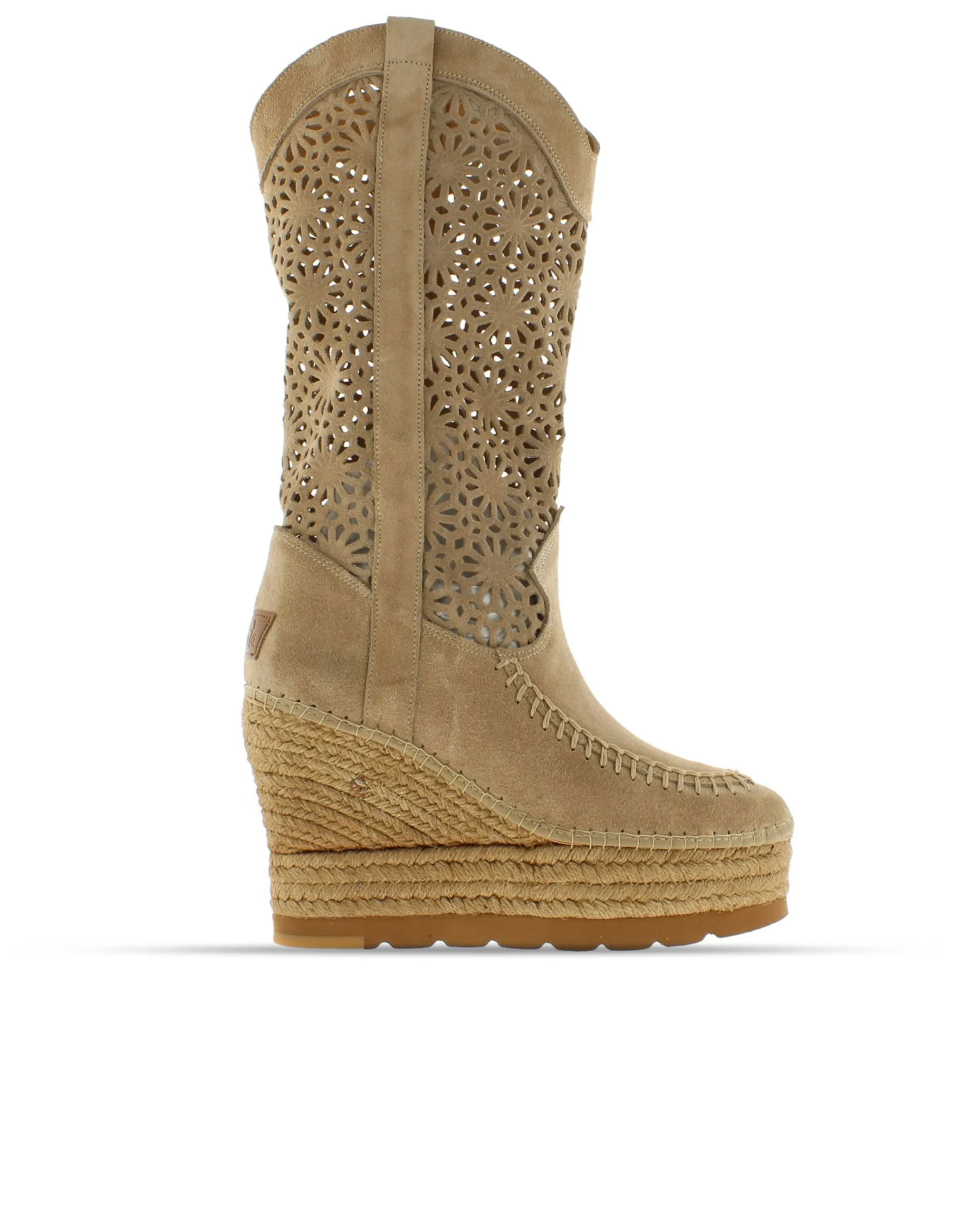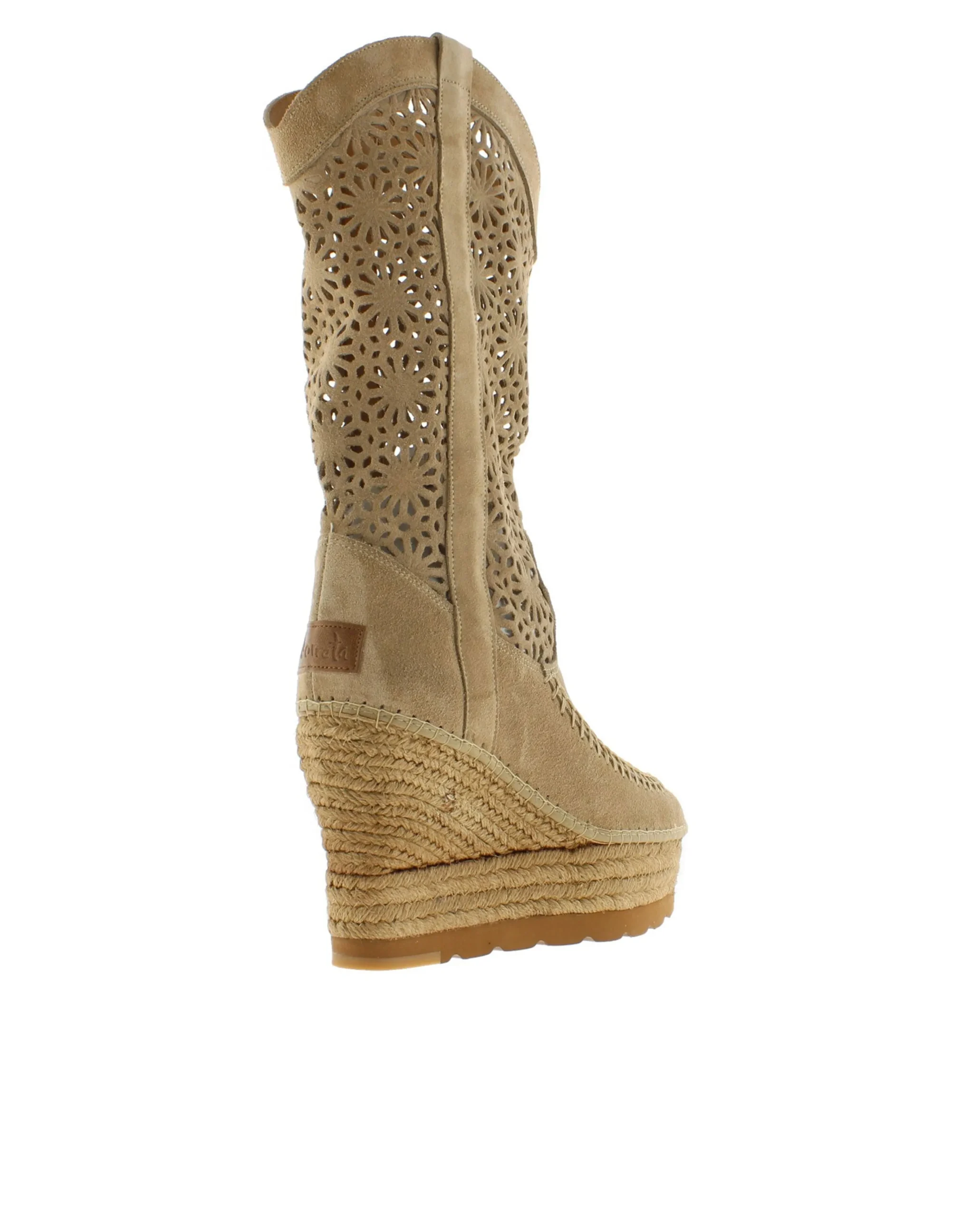 Bota de cuña de yute natural de 10,5 cm en serraje color arena. Plantilla de microfibra transpirable y antibacteriana.