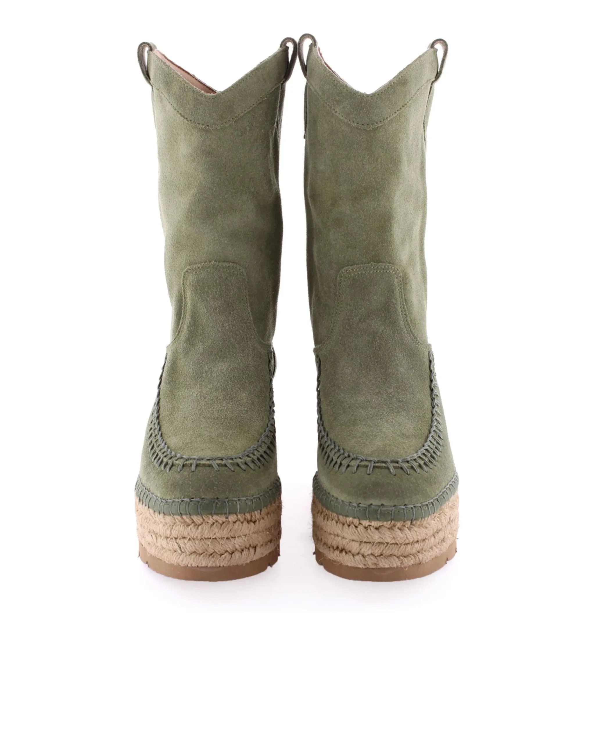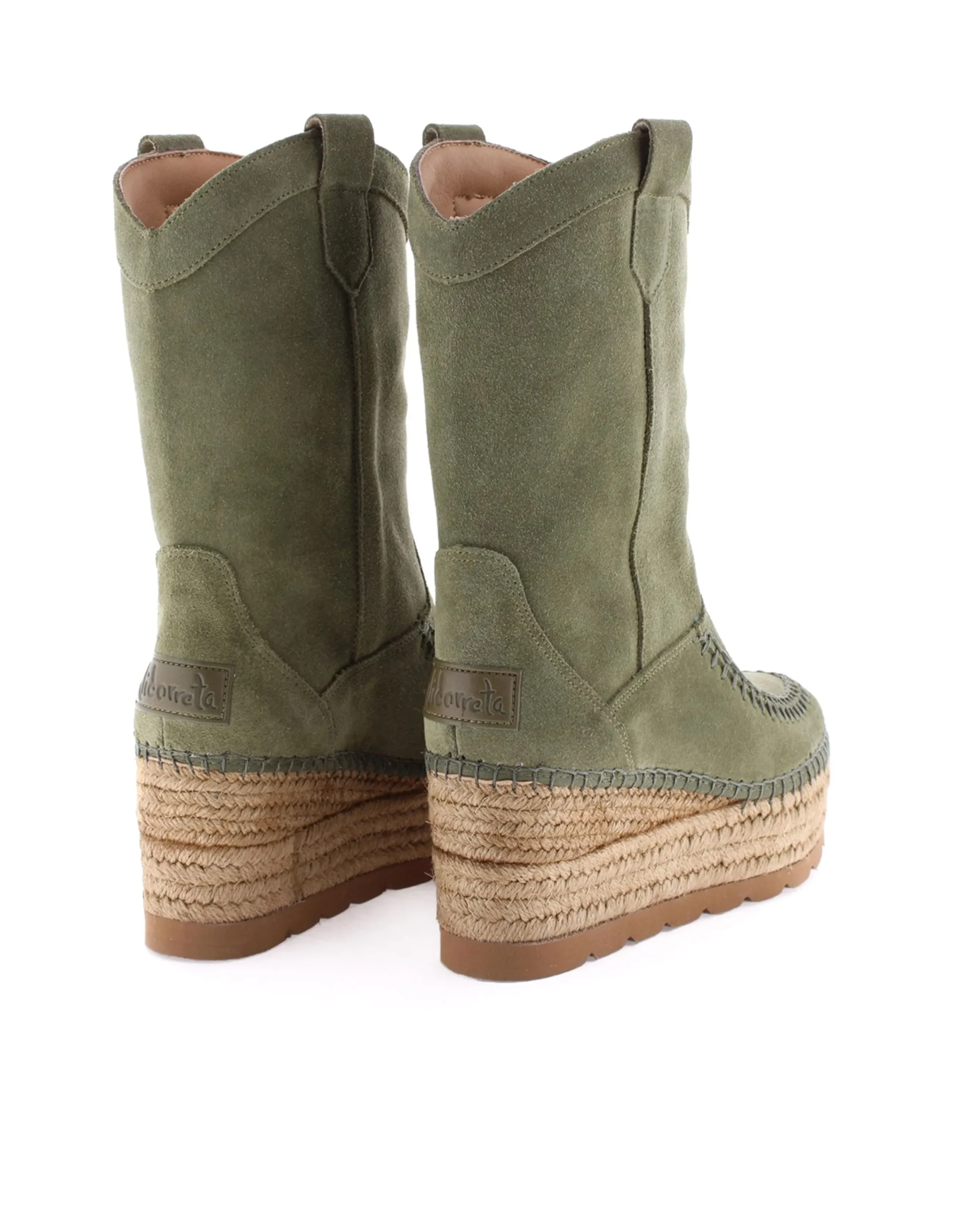 Bota alta cowboy de cuña de yute natural de 7 cm en serraje color kaki. Plantilla de microfibra transpirable y antibacteriana.