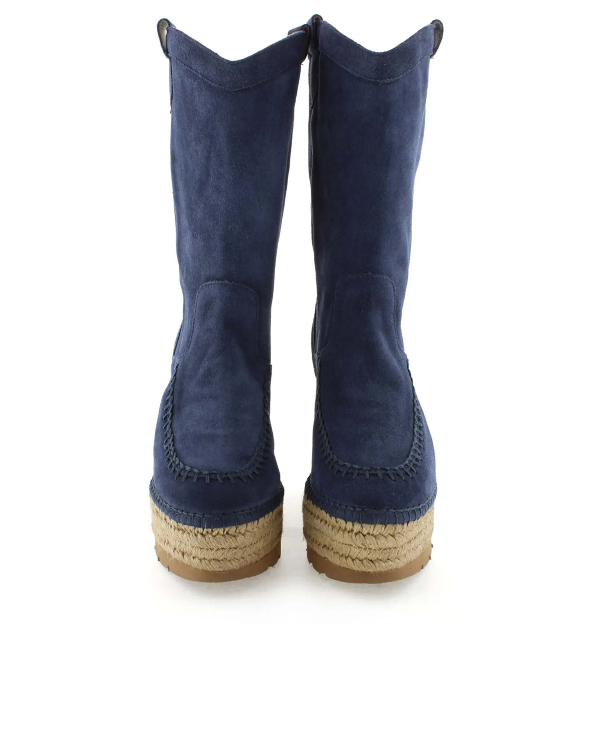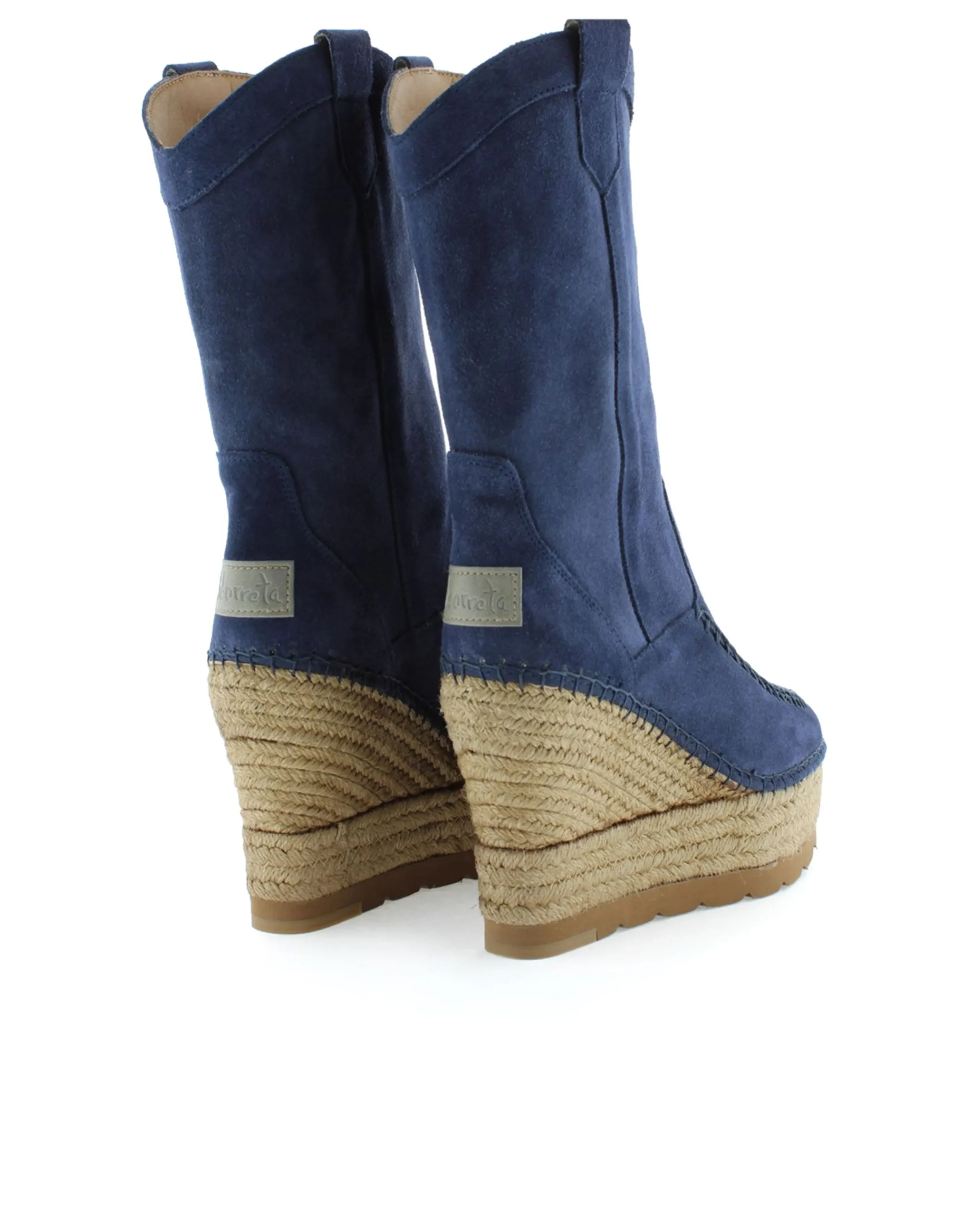 Bota alta cowboy de cuña de yute natural de 10,5 cm en serraje color marino. Plantilla de microfibra transpirable y antibacteriana.