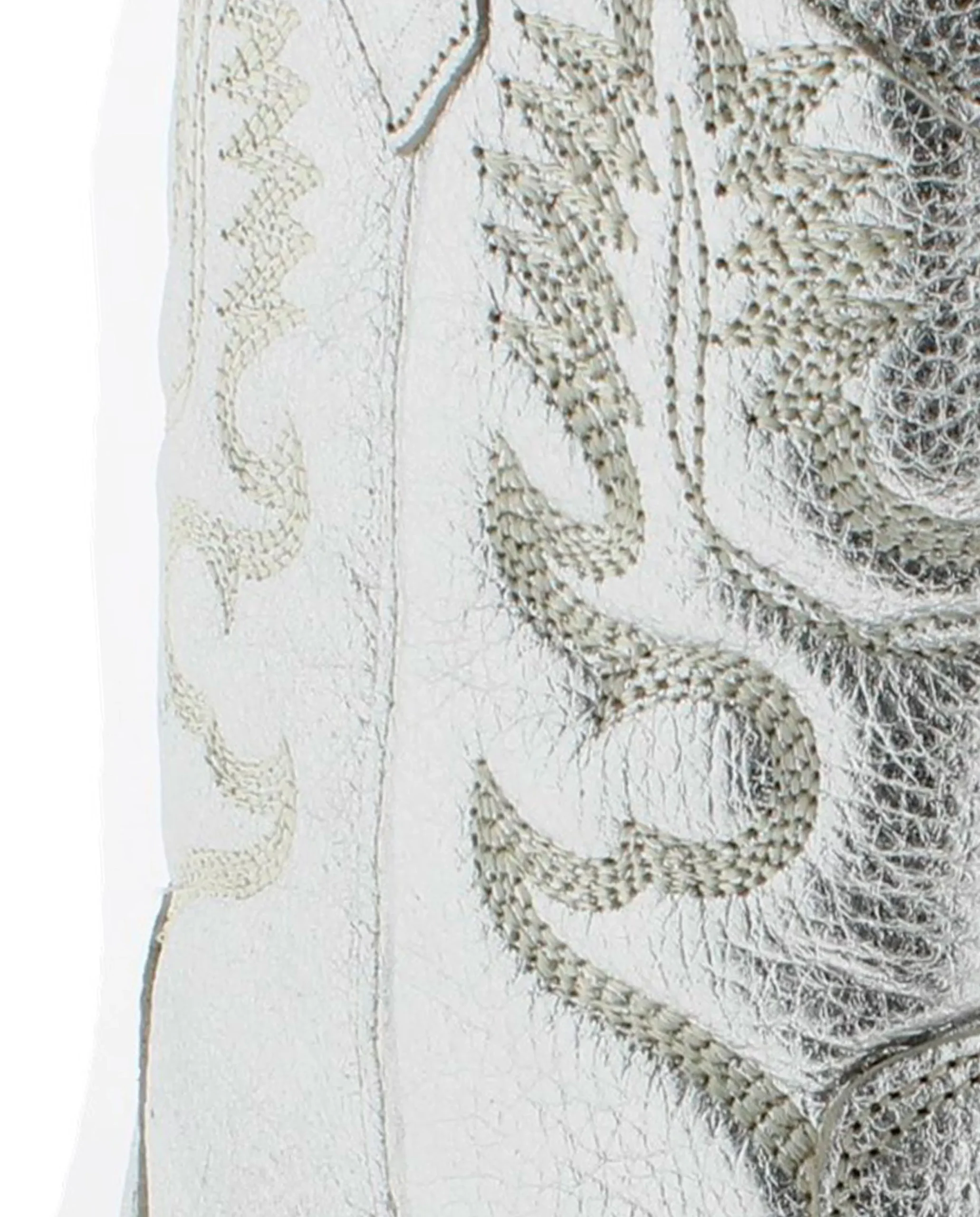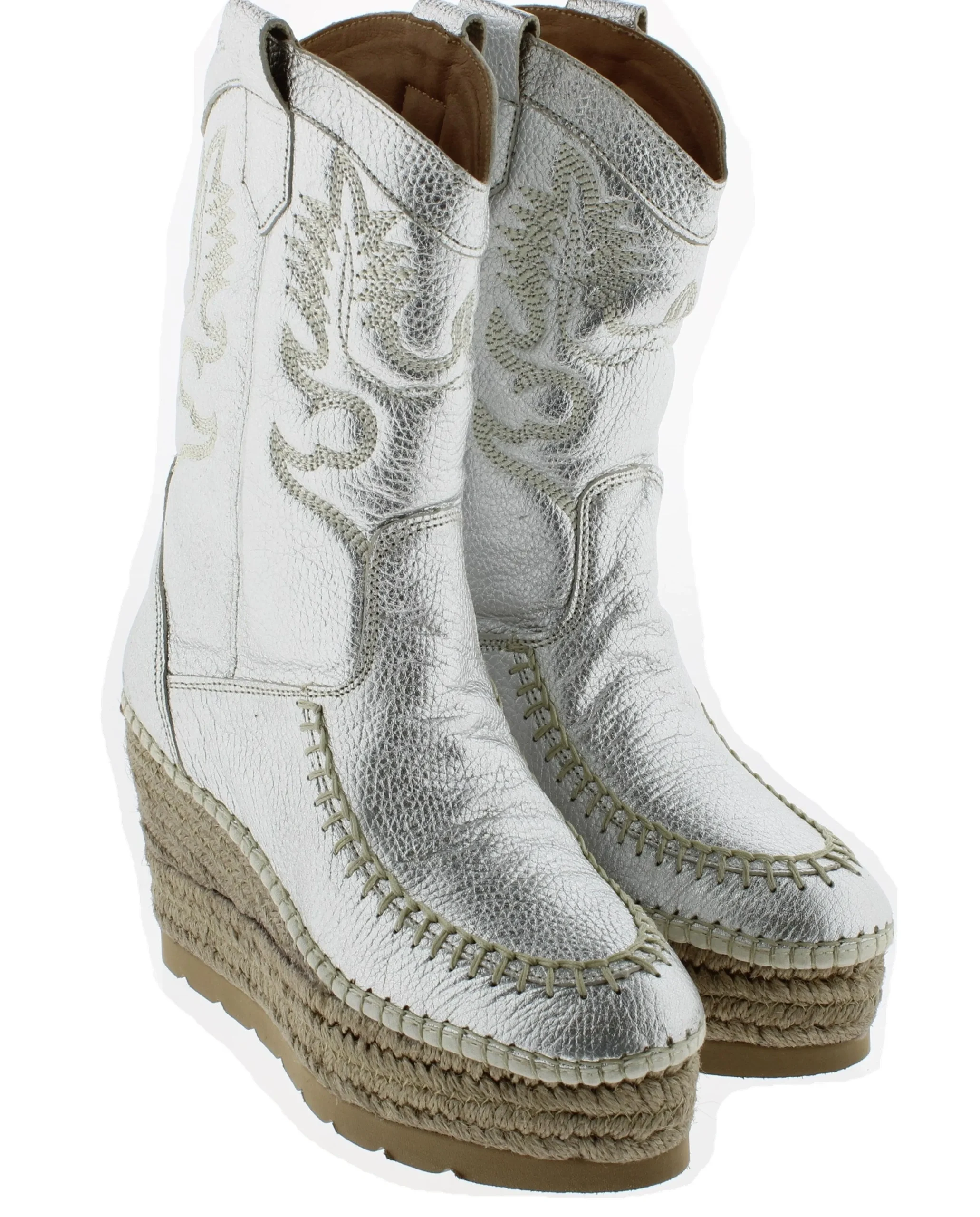 Bota alta cowboy de cuña de yute natural de 9,5 cm en napa metal color plata. Plantilla de microfibra transpirable y antibacteriana.