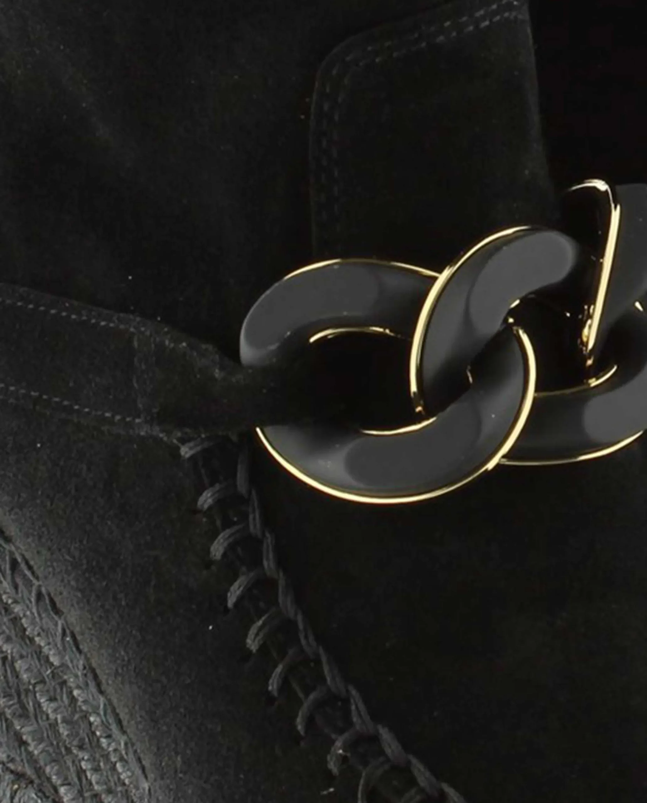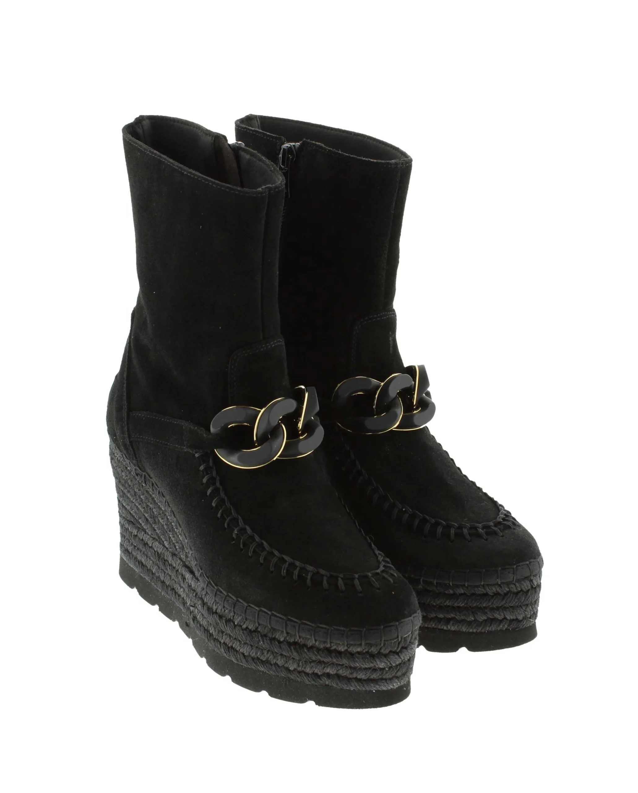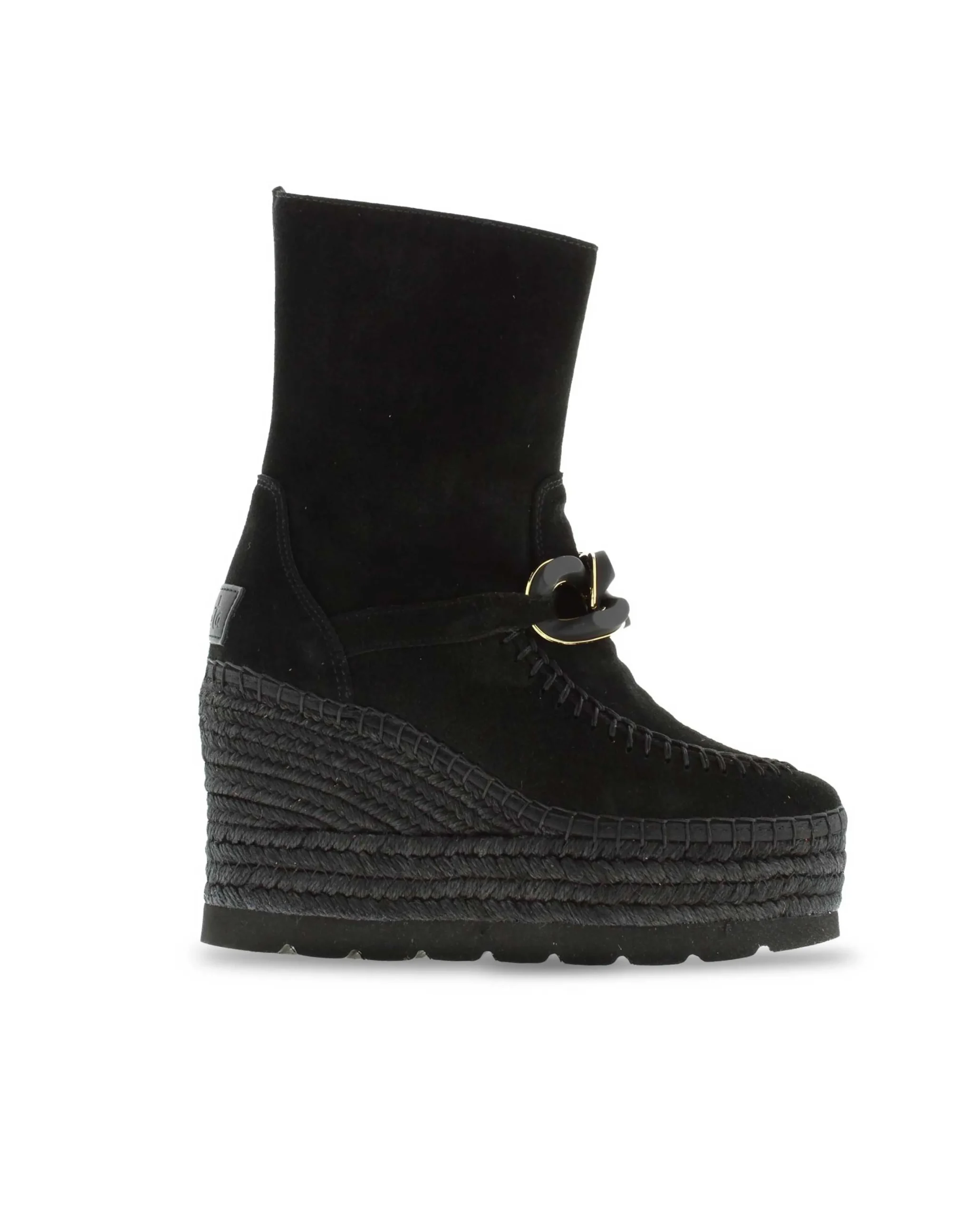 Botín de cuña de yute negro de 9,5 cm en serraje color negro. Plantilla de microfibra transpirable y antibacteriana.