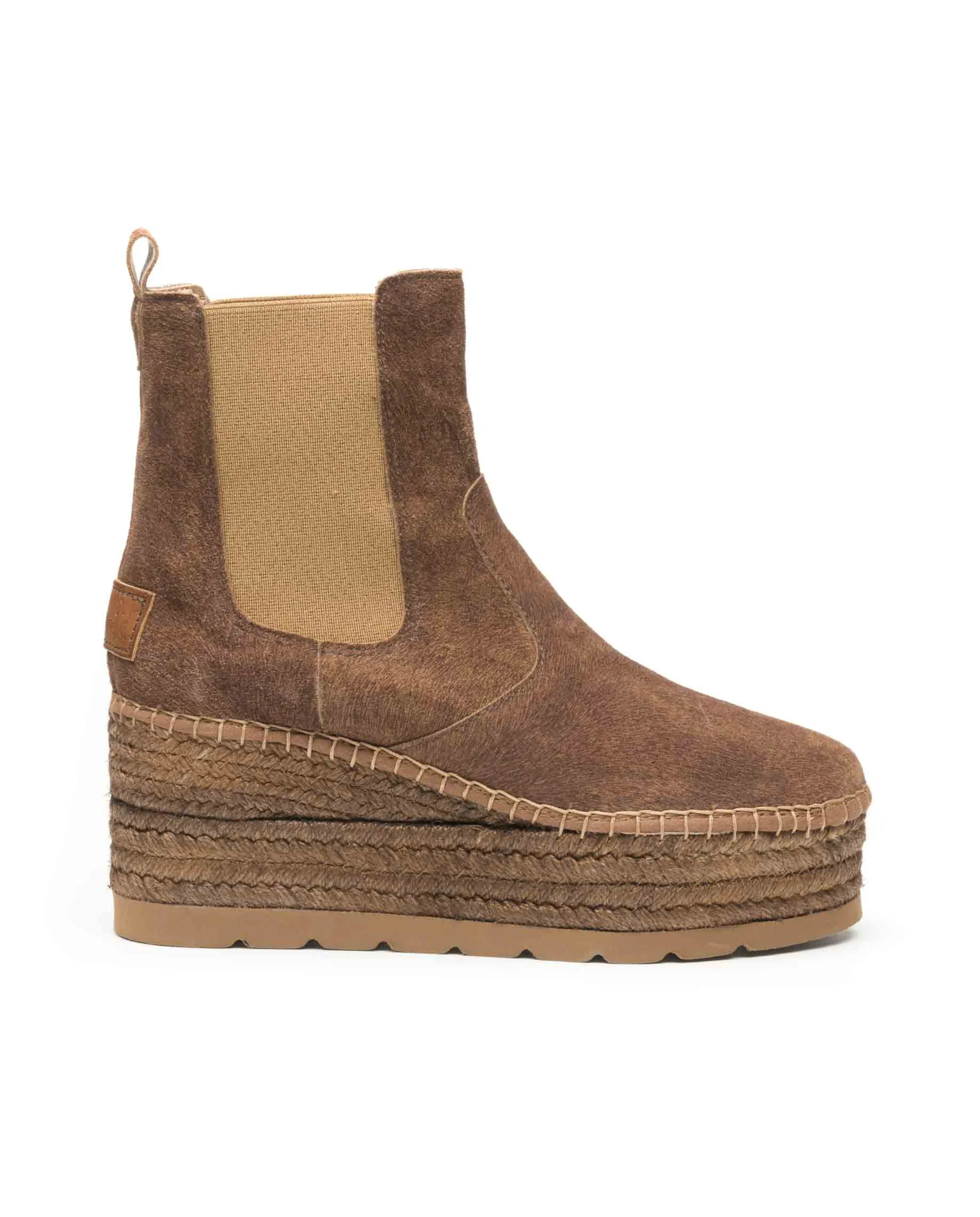 Botín Chelsea de cuña de yute natural de 7 cm en serraje color cuero oscuro. Plantilla de microfibra transpirable y antibacteriana.