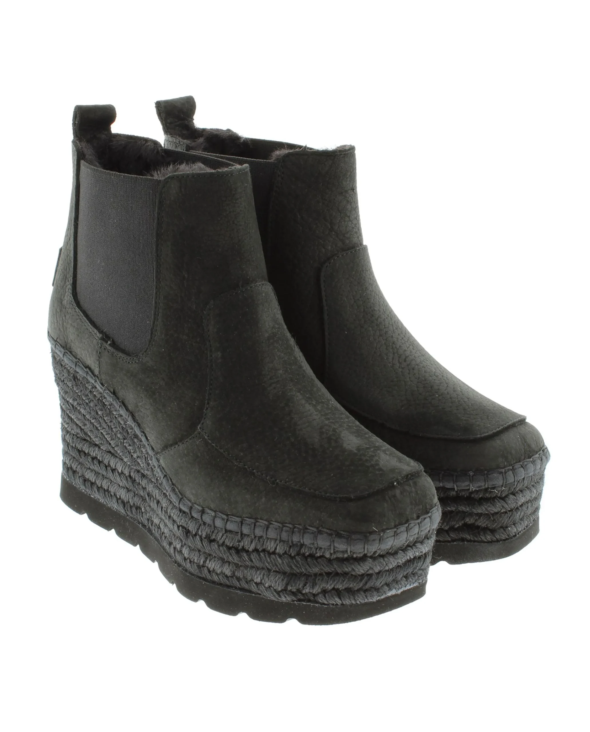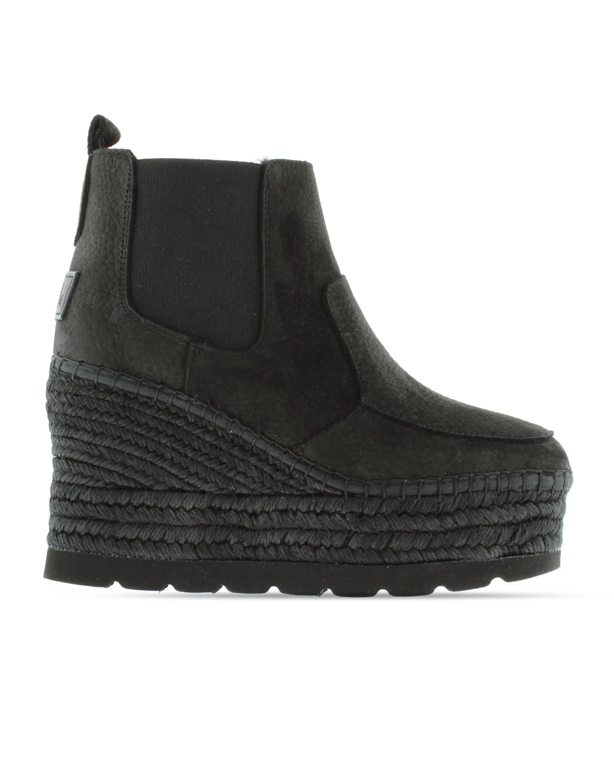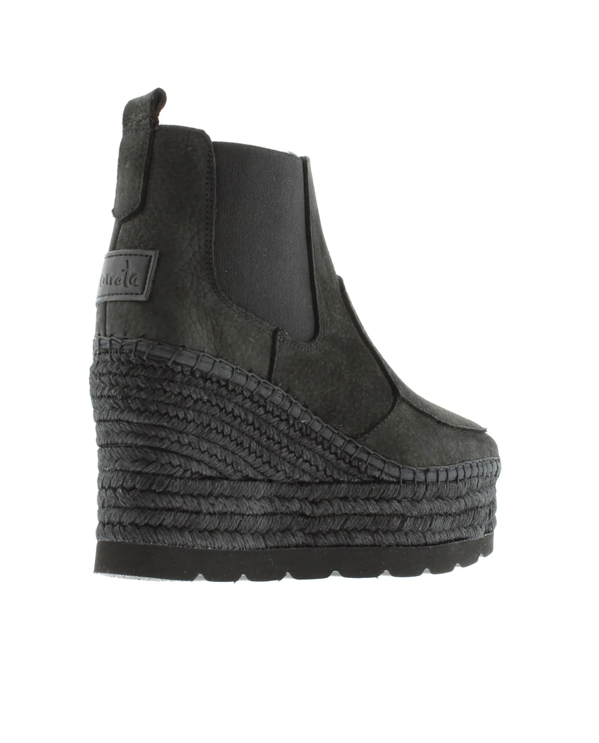 Botín e cuña de yute natural de 9,5 cm en piel nobuk color negro. Plantilla de microfibra transpirable y antibacteriana.