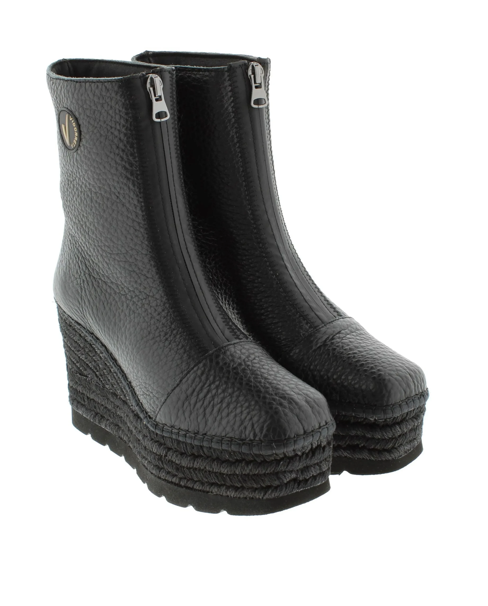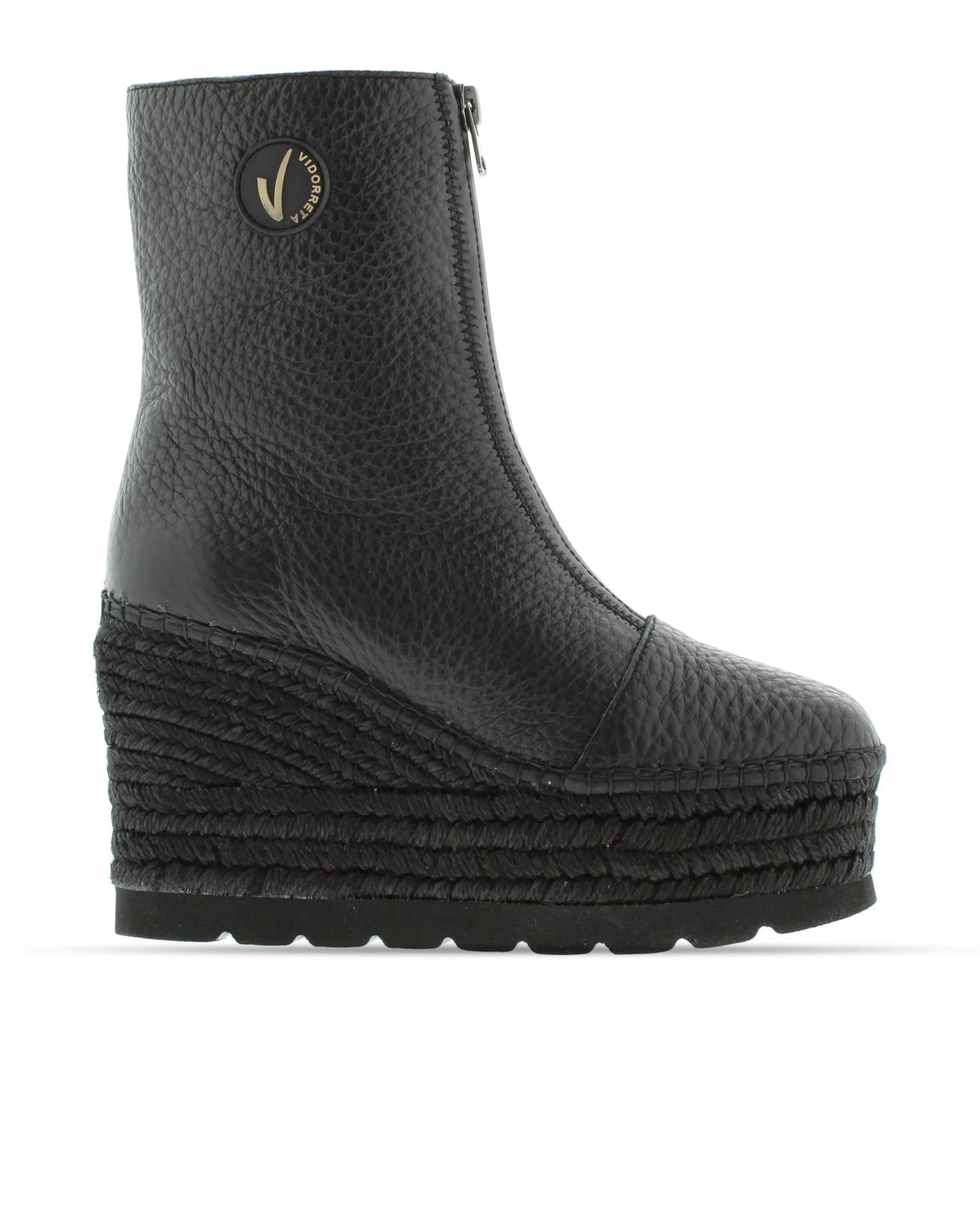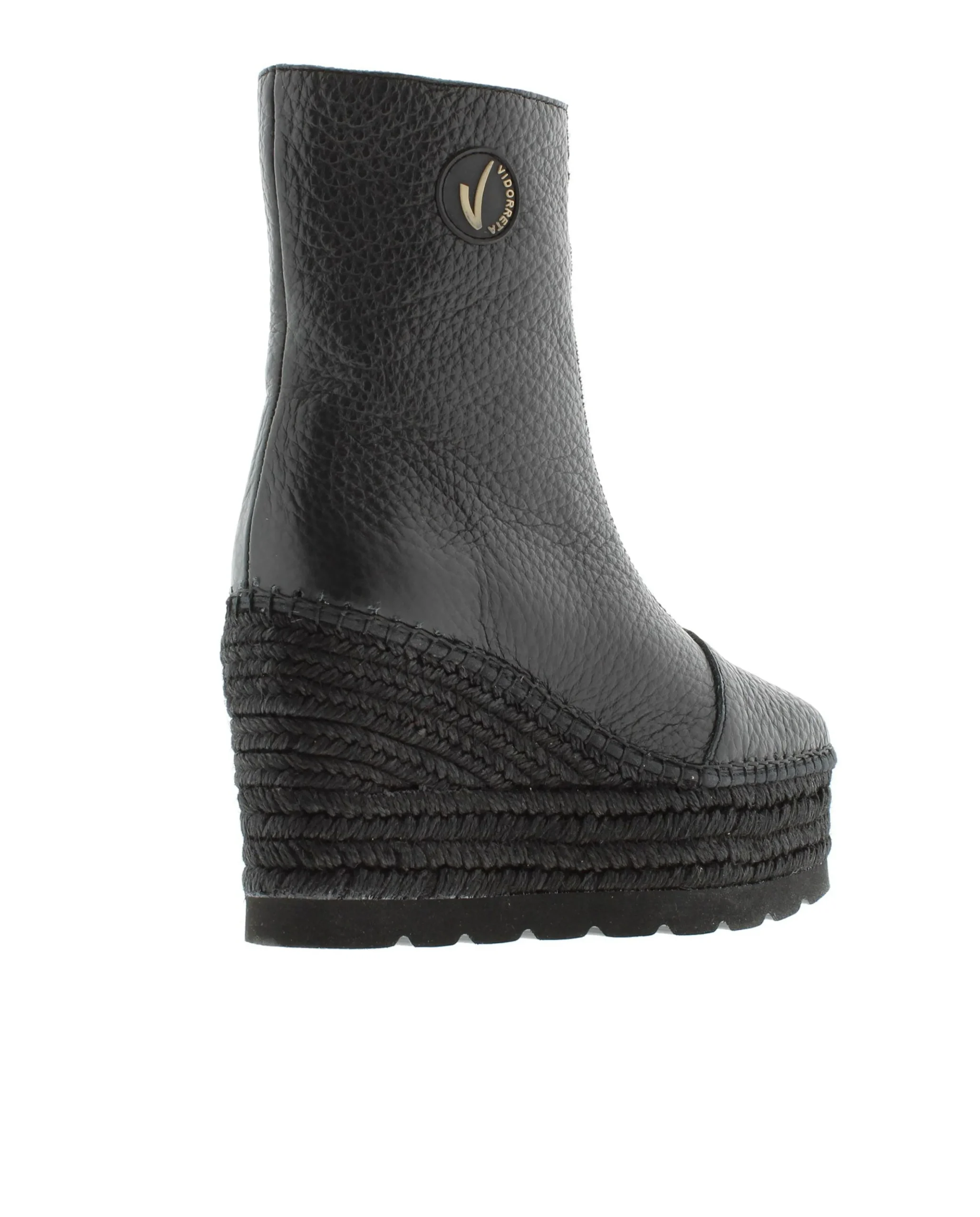 Botín de cuña de yute natural de 9,5 cm en piel bost color negro. Plantilla de microfibra transpirable y antibacteriana.