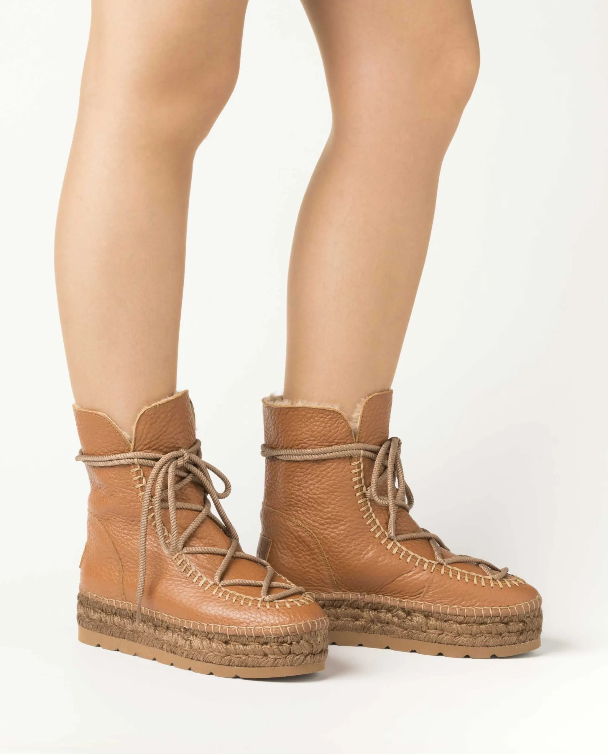 Botín de plataforma de yute natural de 4 cm en piel bost color camel. Plantilla de microfibra transpirable y antibacteriana.