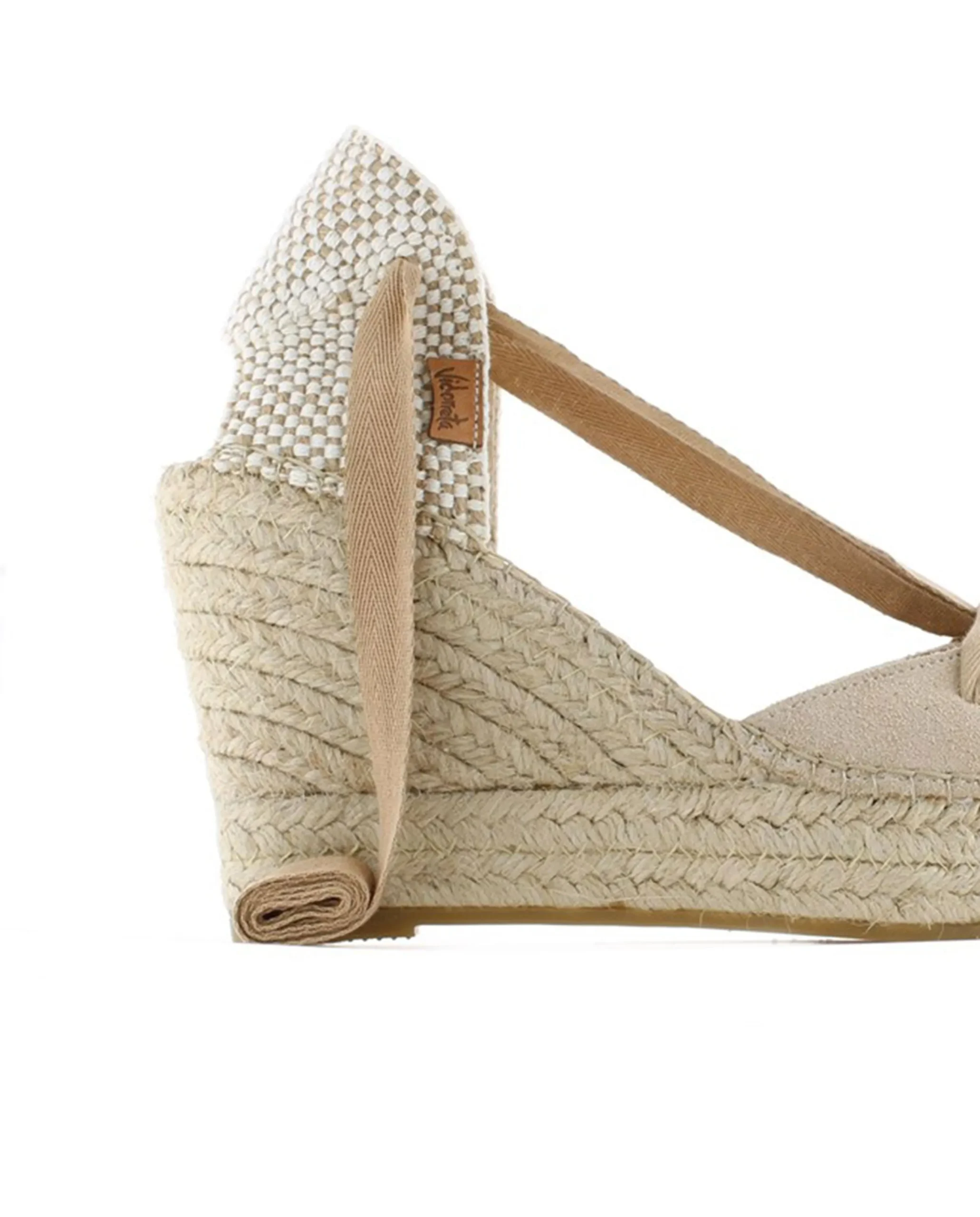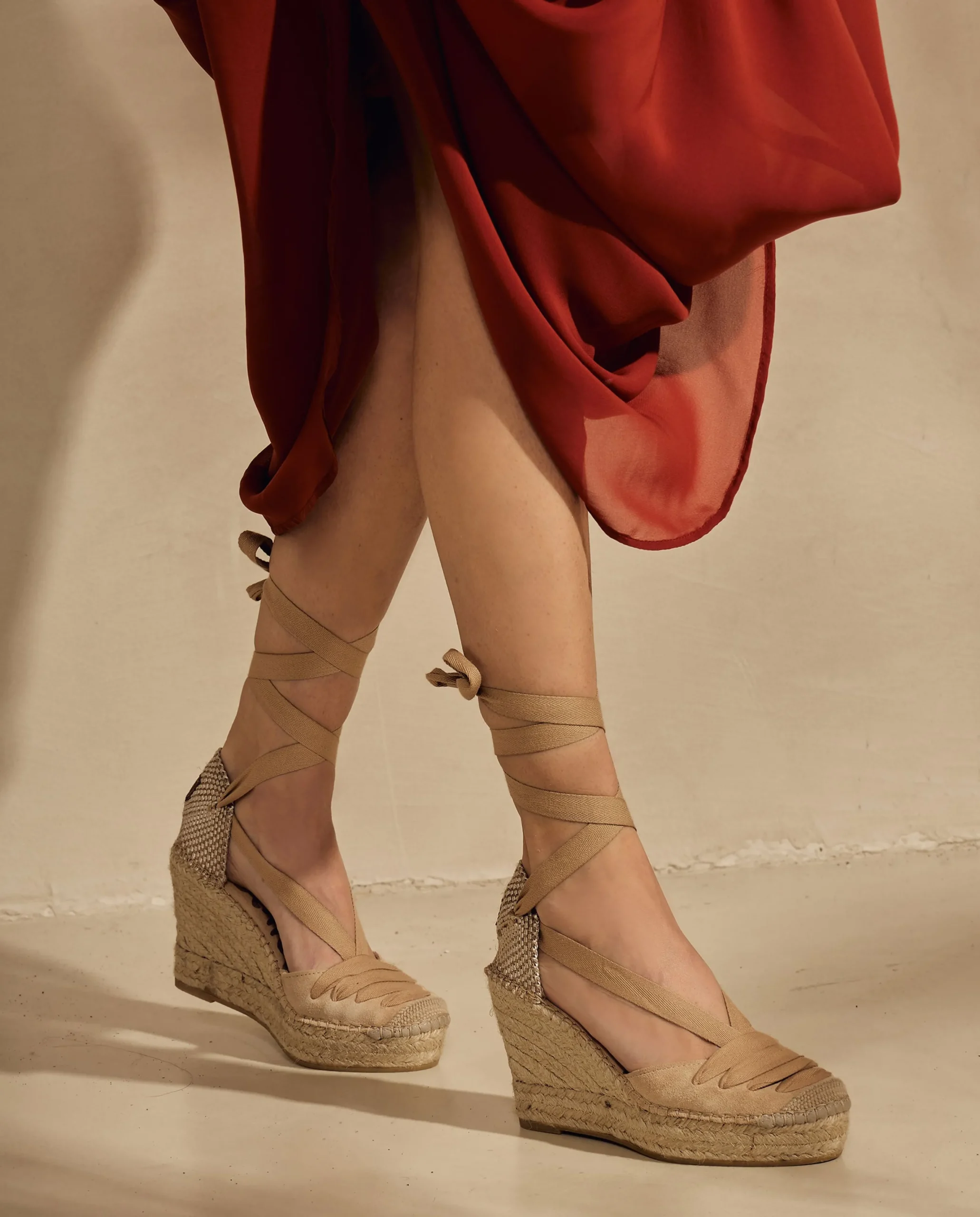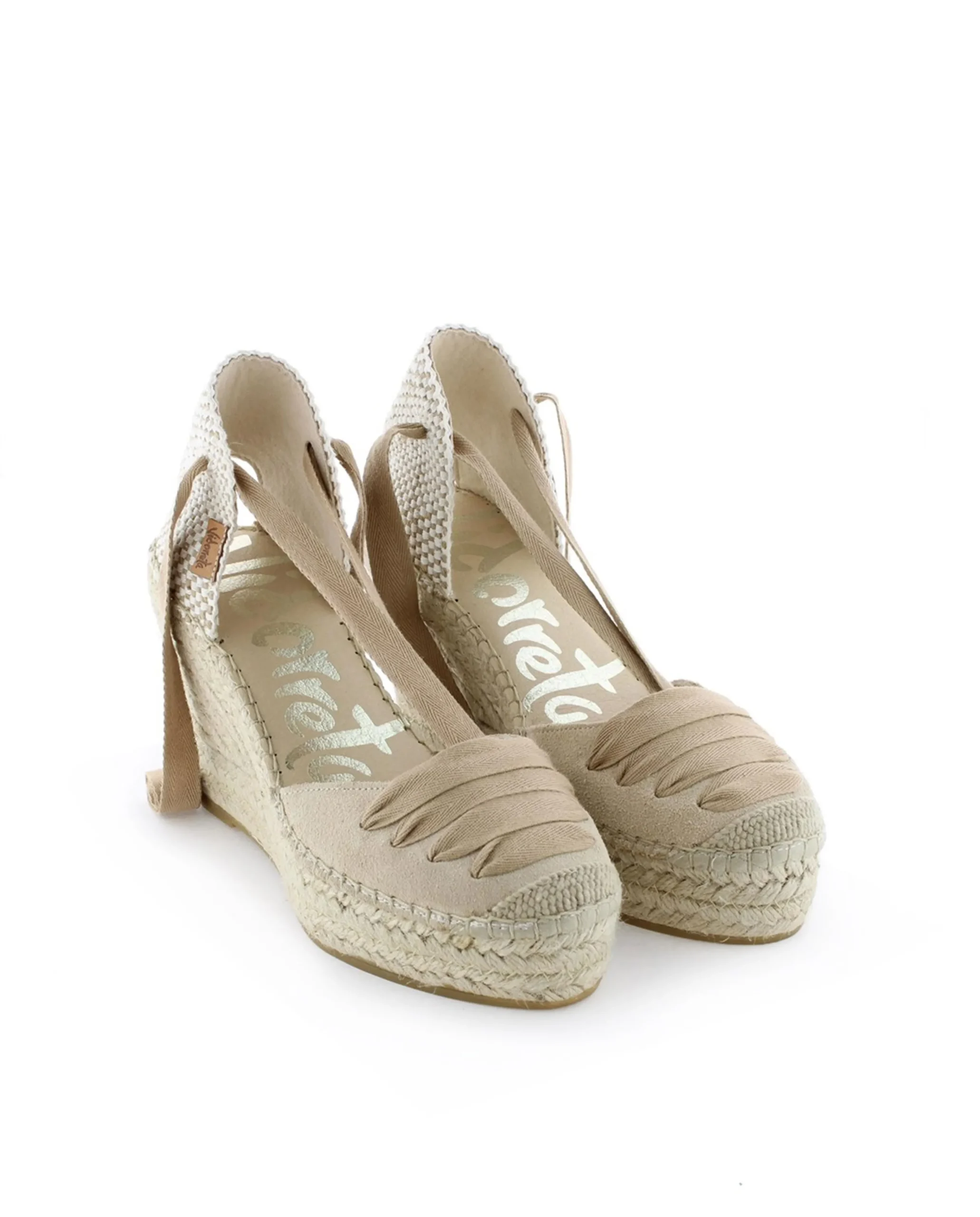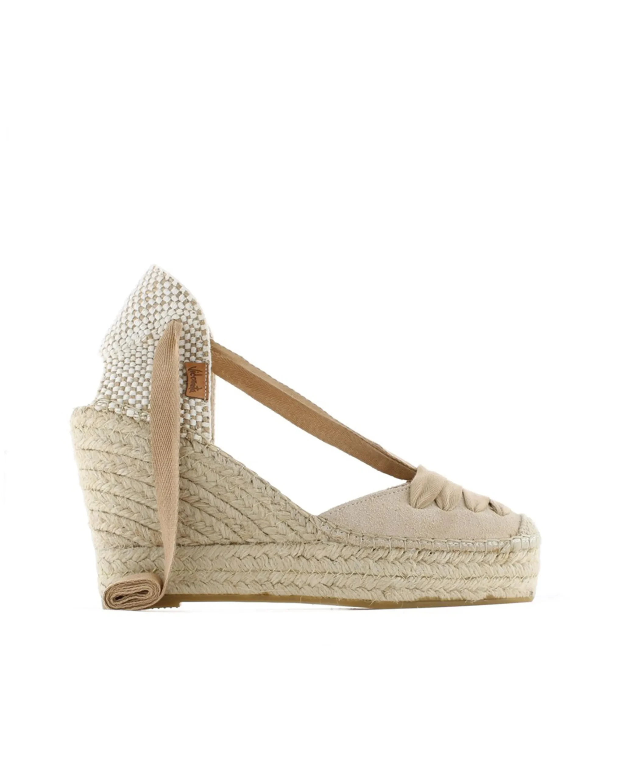 Alpargata de cuña de yute natural de 9,5 cm en serraje color arena. Plantilla de microfibra transpirable y antibacteriana.