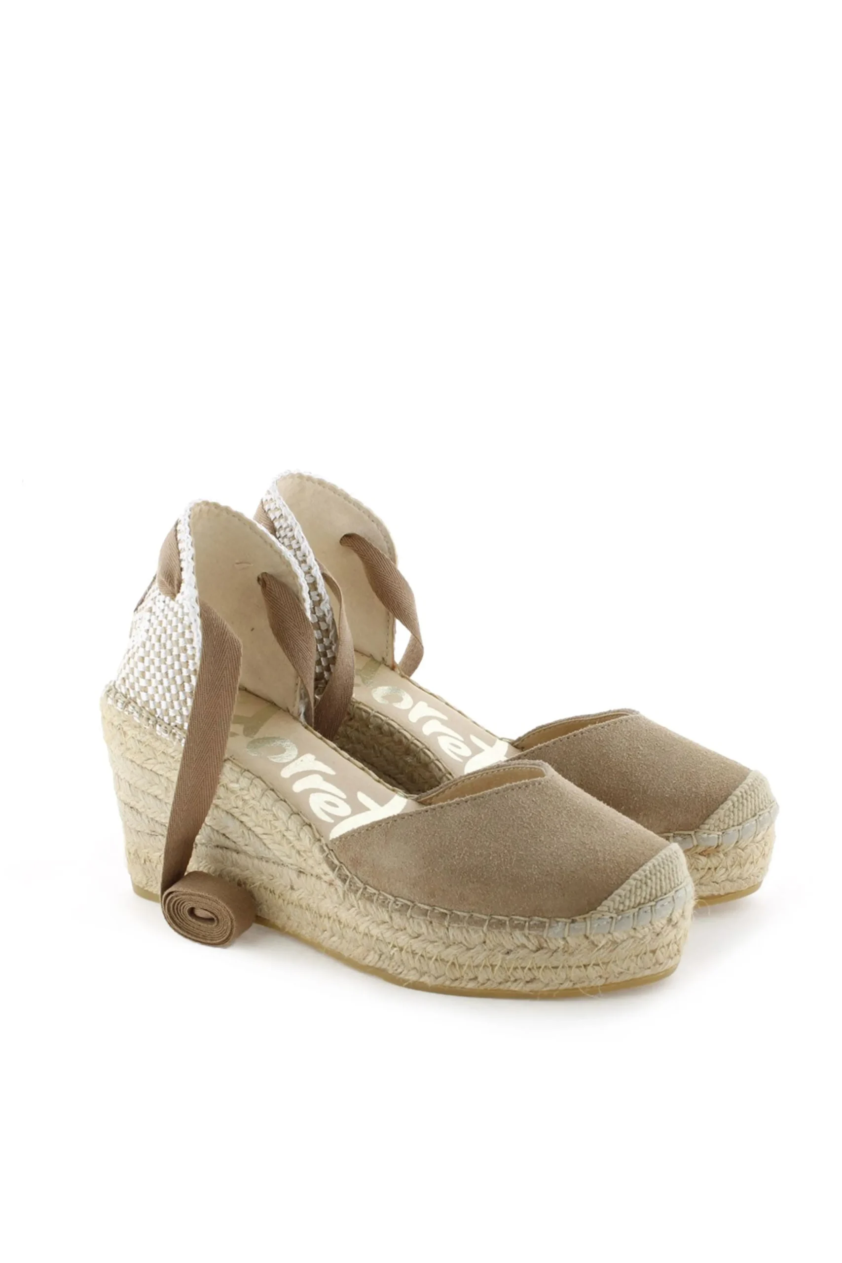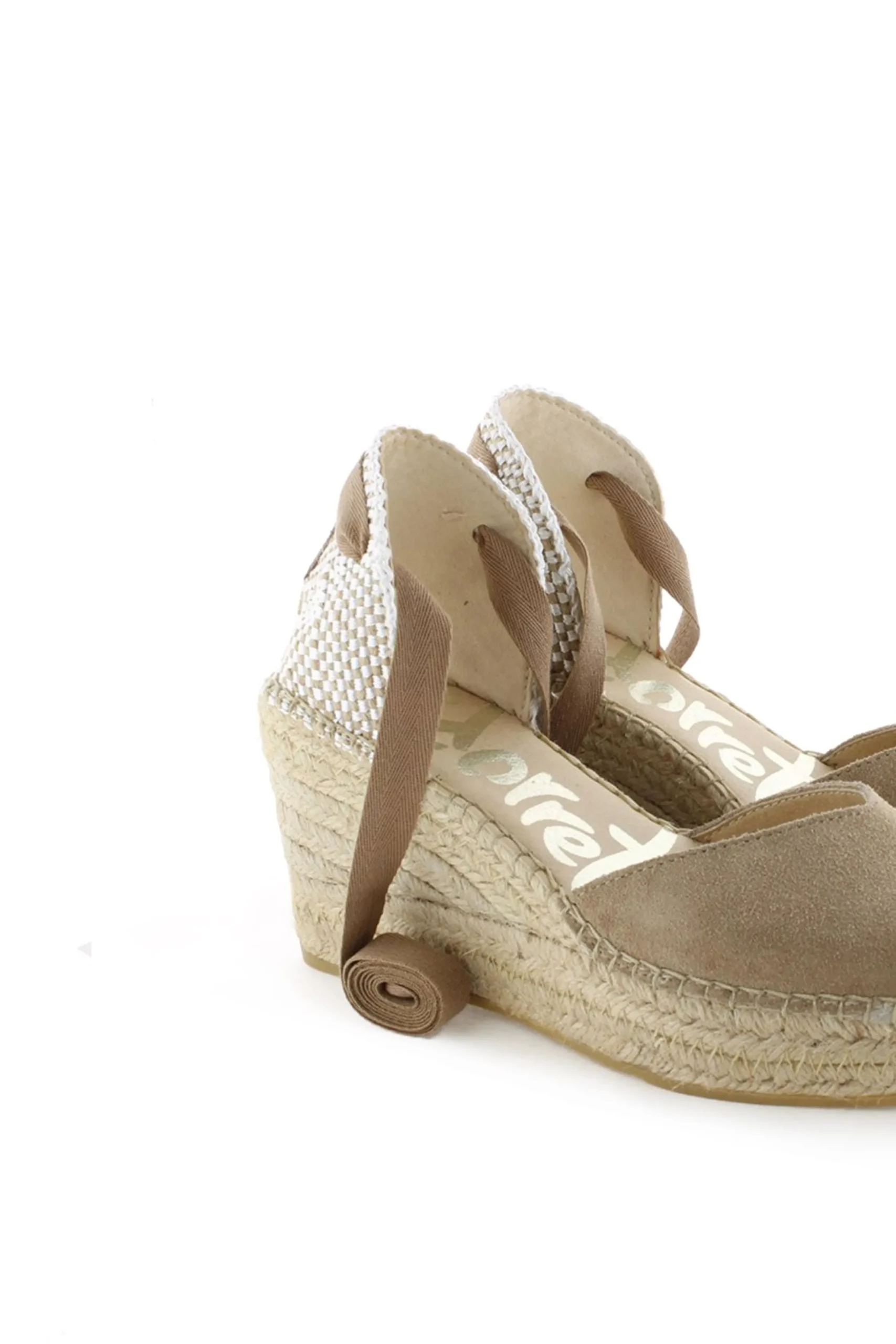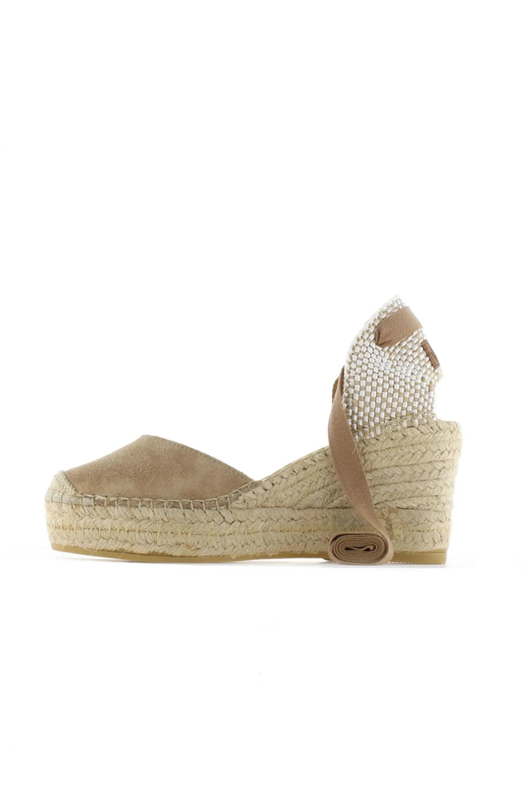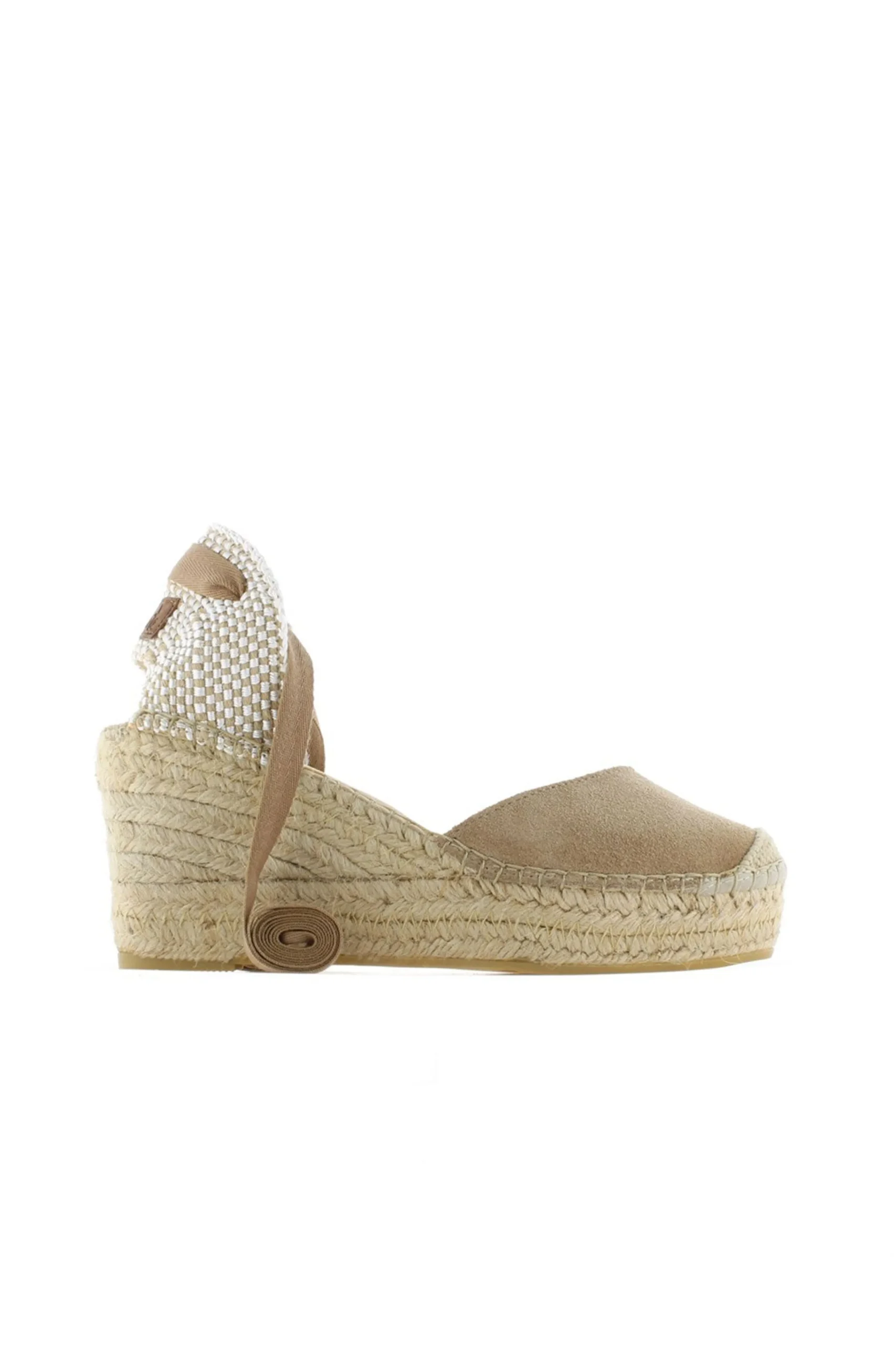 Alpargata de cuña de yute natural de 8 cm en serraje color arena oscuro. Plantilla de microfibra transpirable y antibacteriana.
