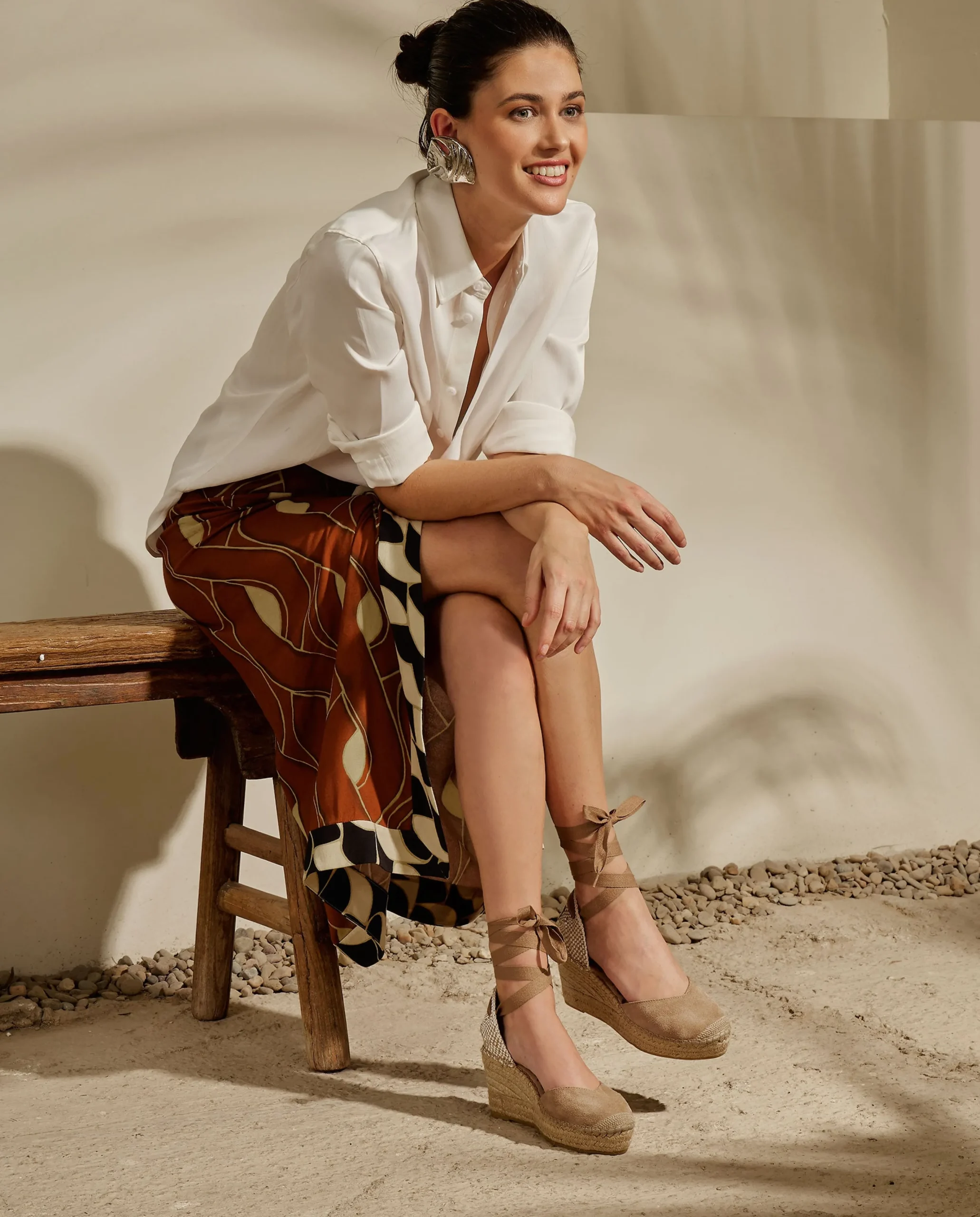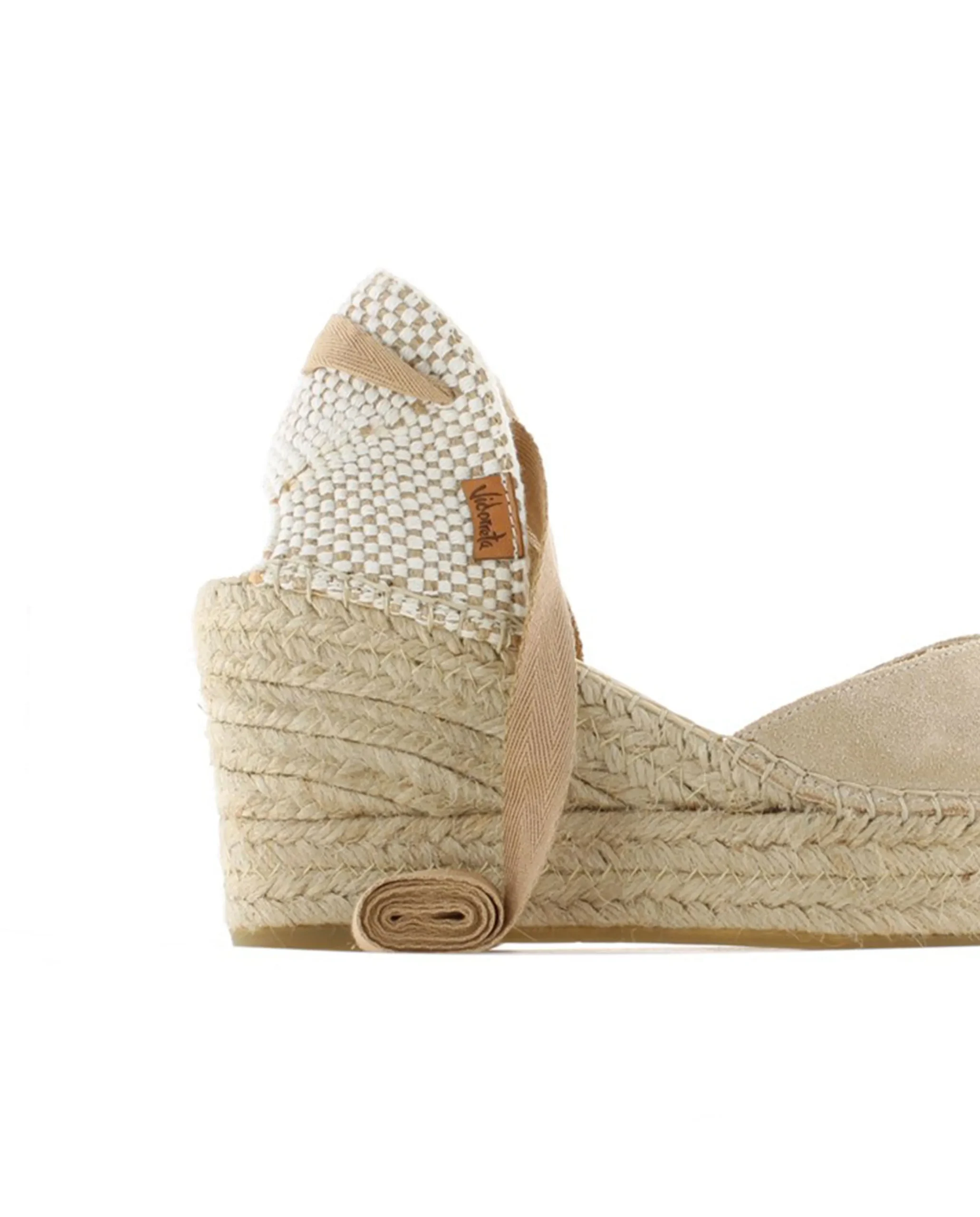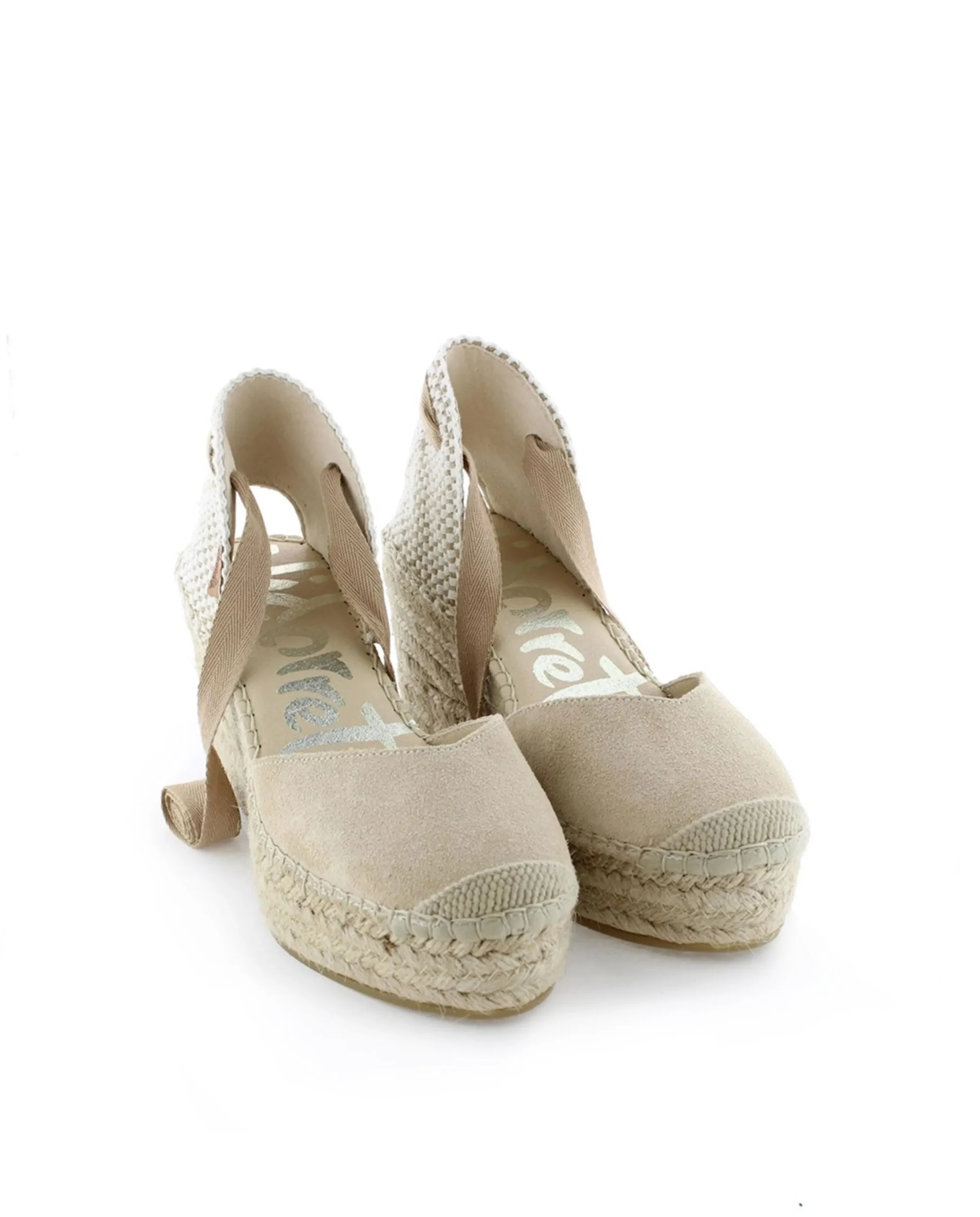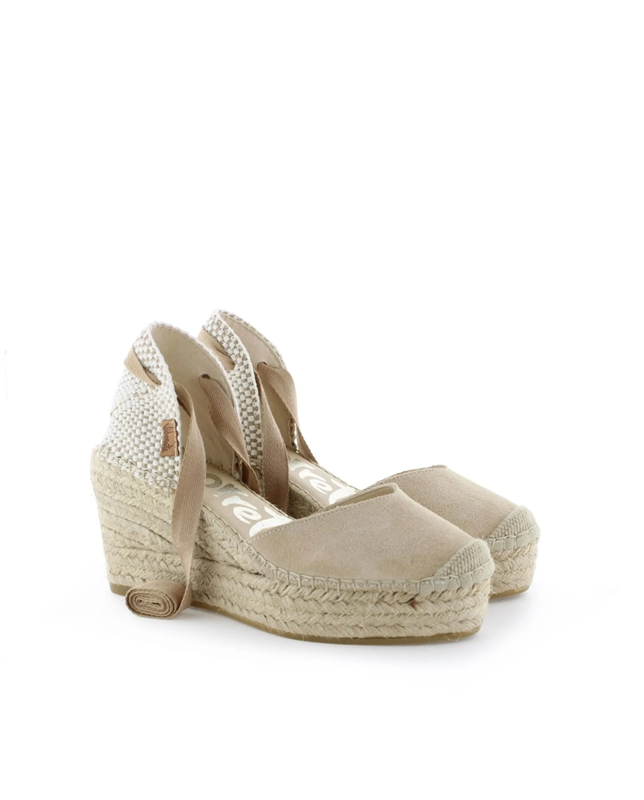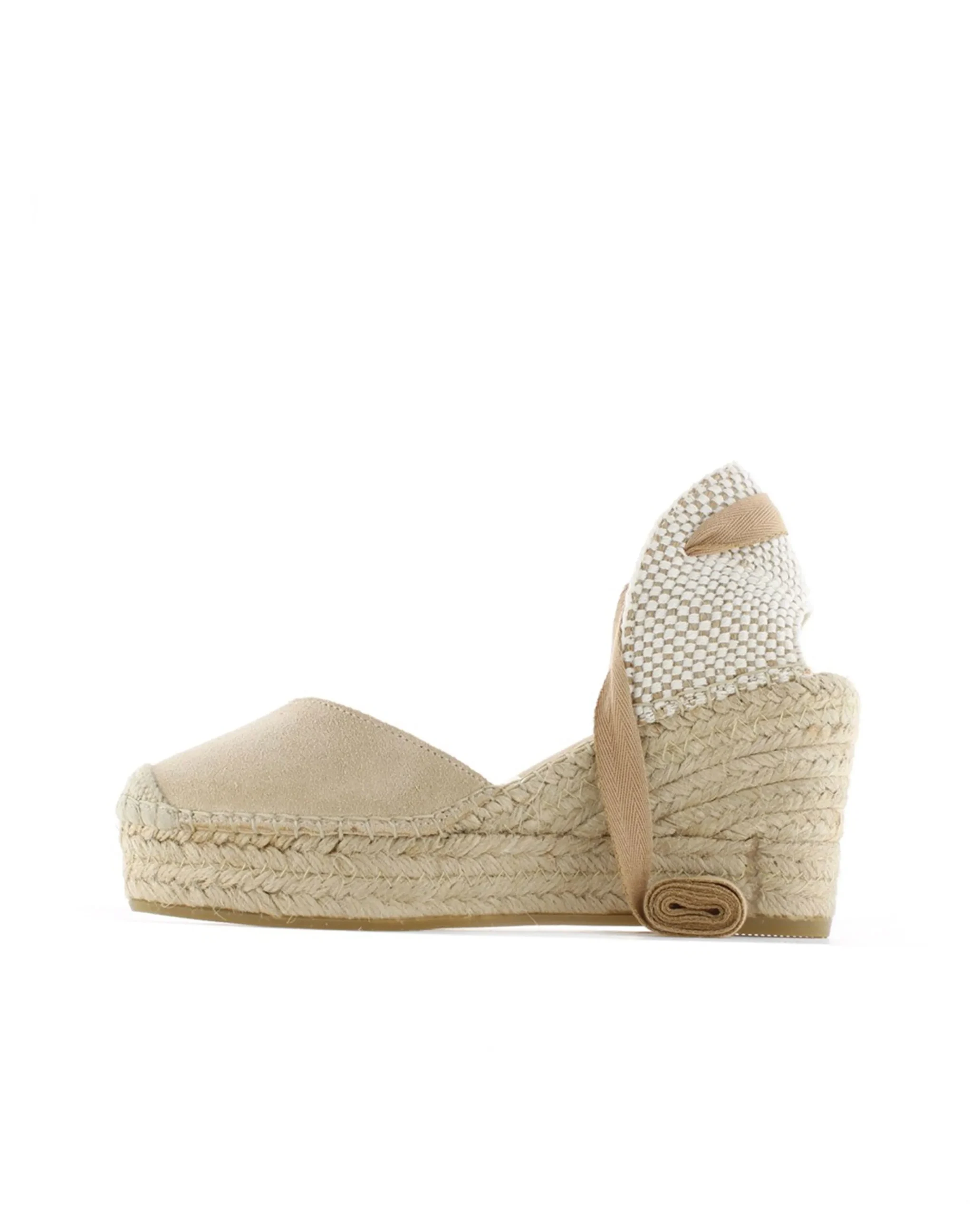 Alpargata de cuña de yute natural de 8 cm en serraje color arena. Plantilla de microfibra transpirable y antibacteriana.