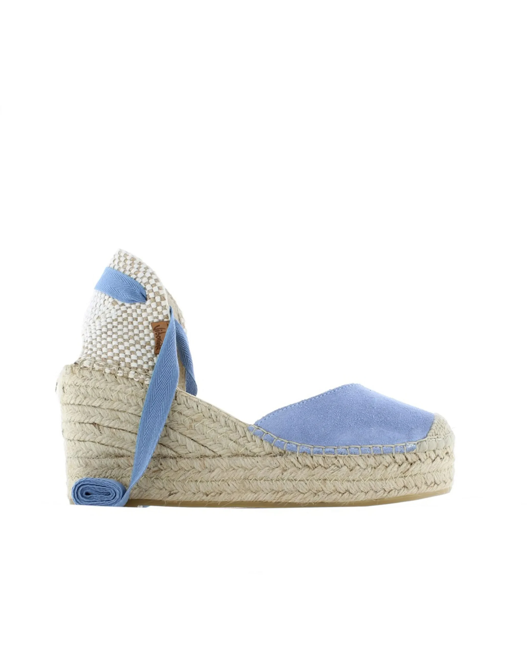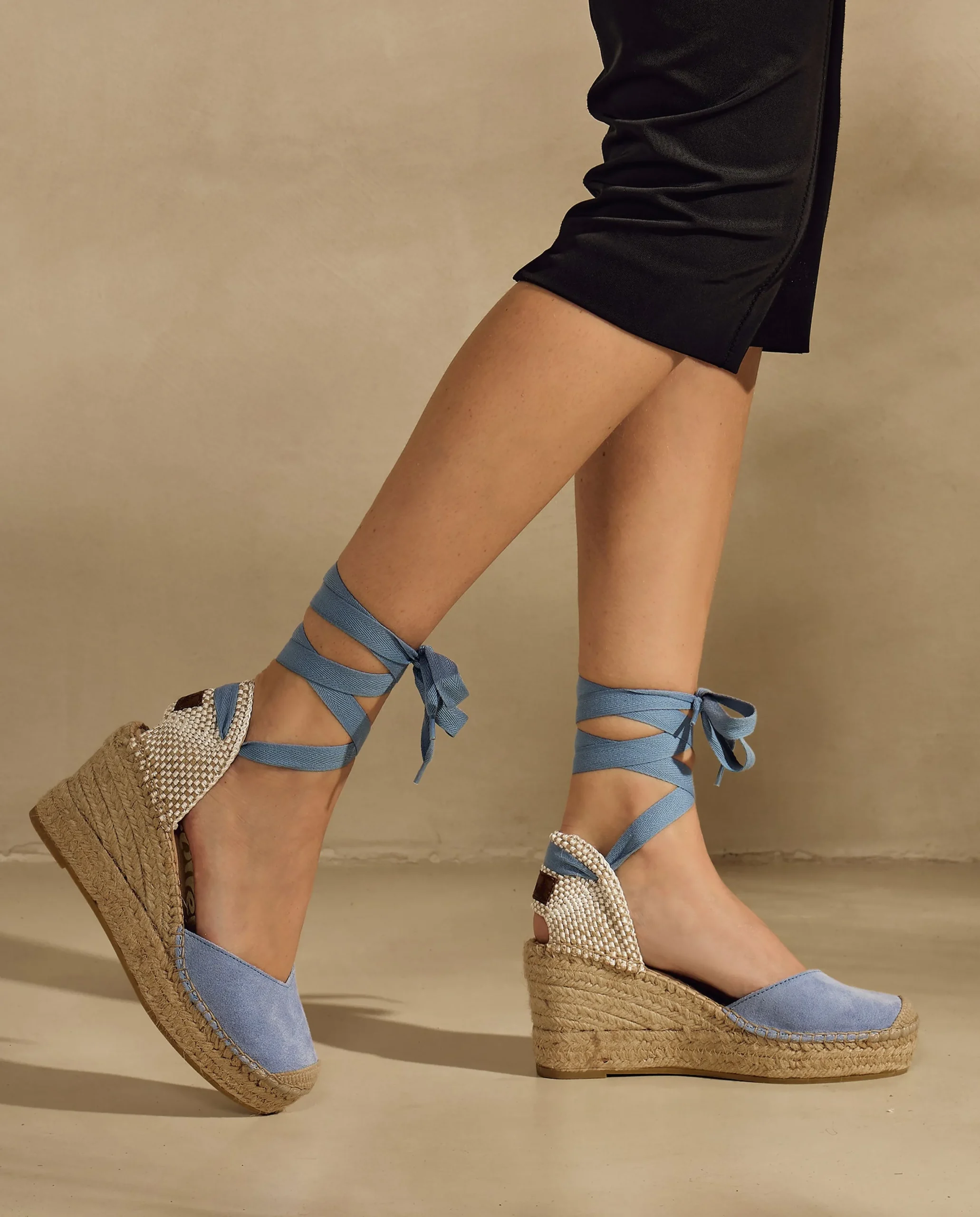Alpargata de cuña de yute natural de 8 cm en serraje color jeans. Plantilla de microfibra transpirable y antibacteriana.