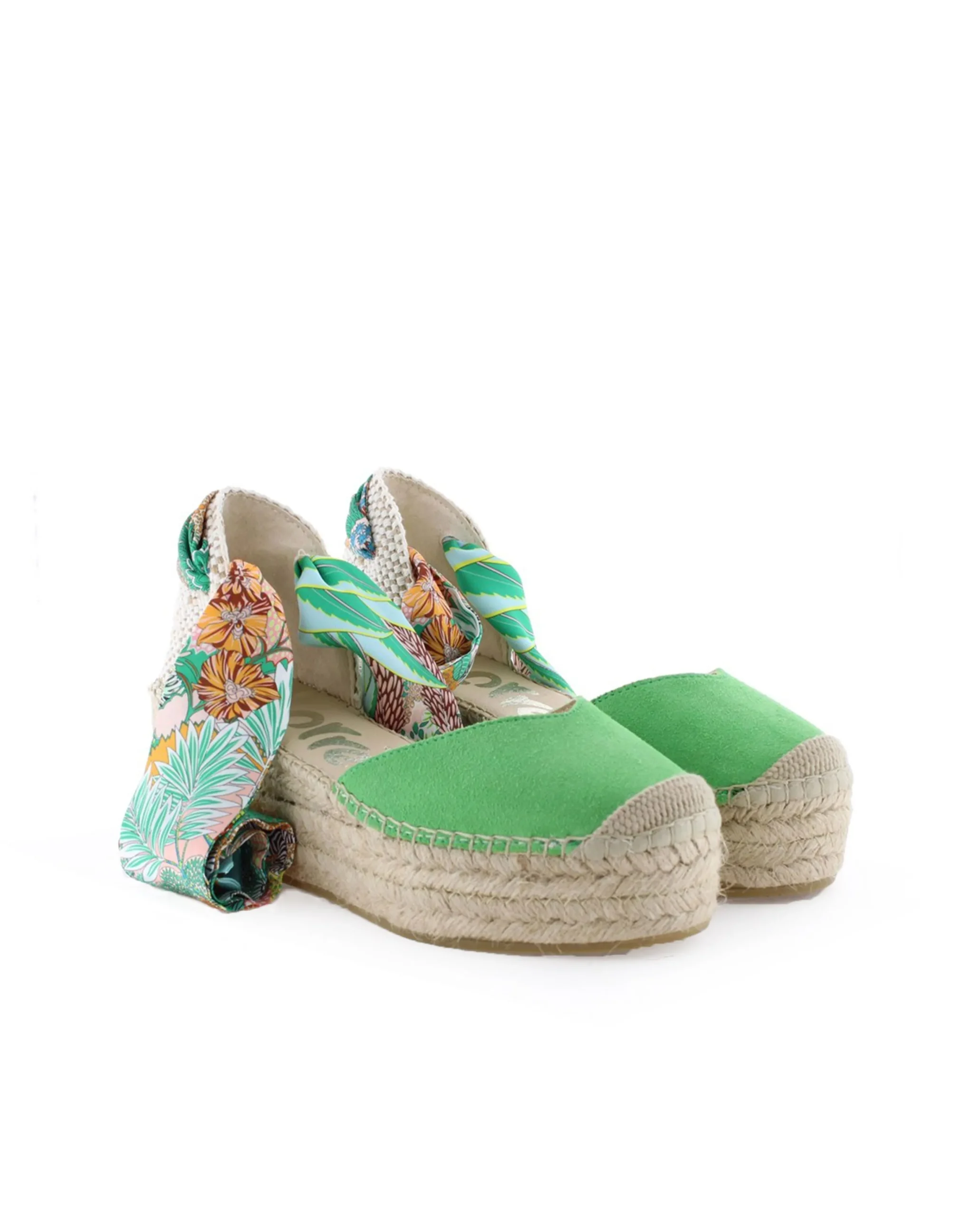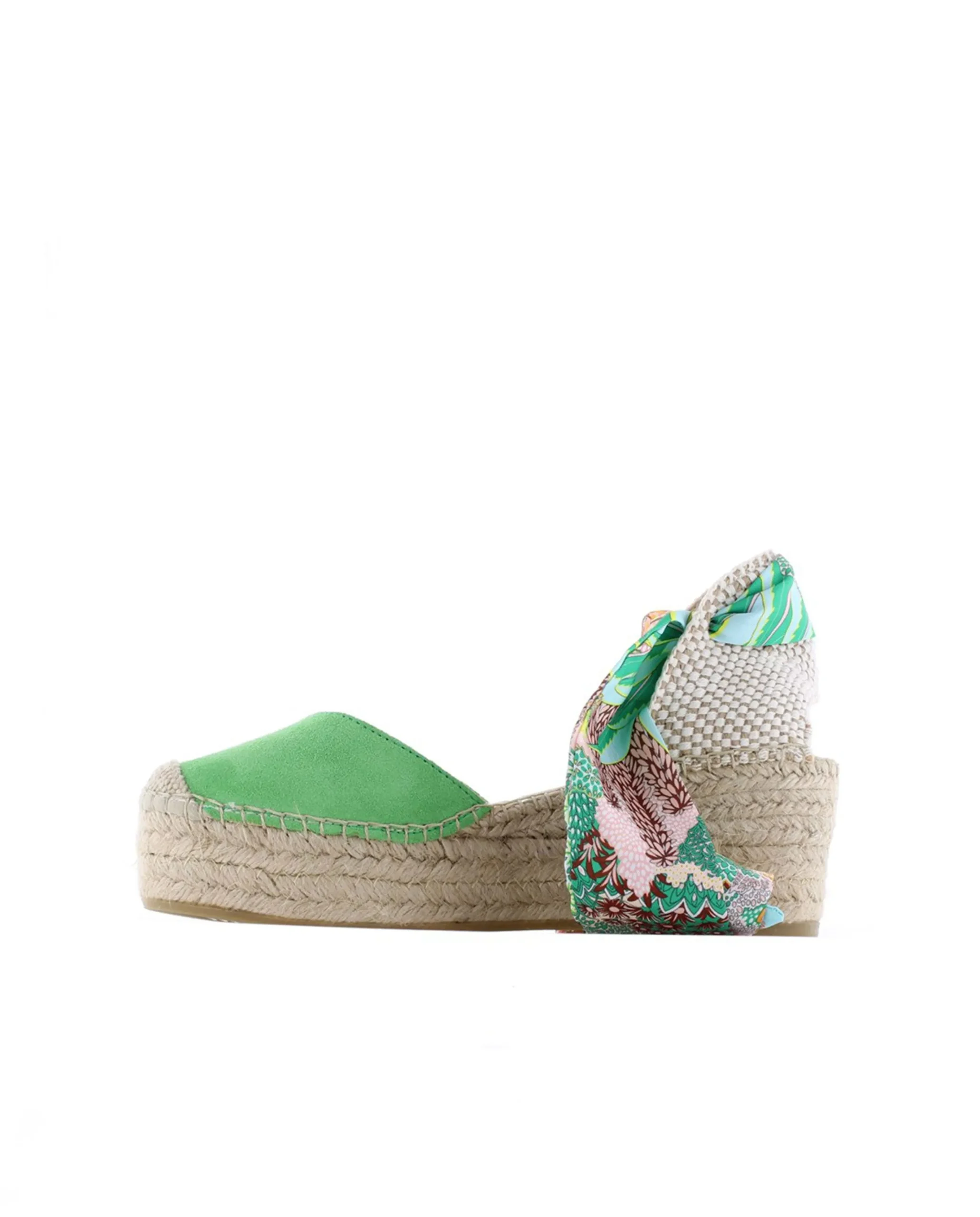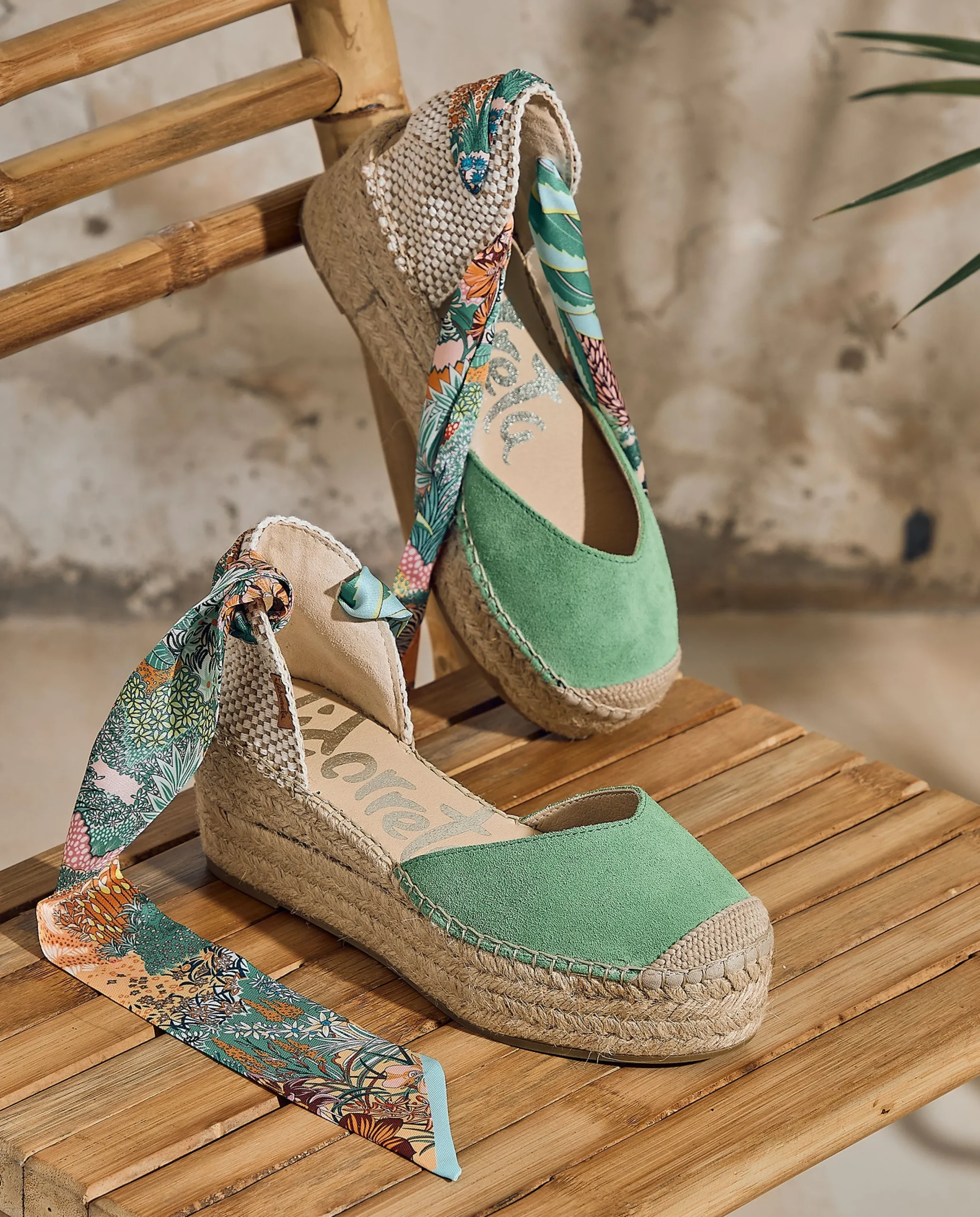 Alpargata de cuña de yute natural de 6 cm en serraje color menta. Plantilla de microfibra transpirable y antibacteriana.