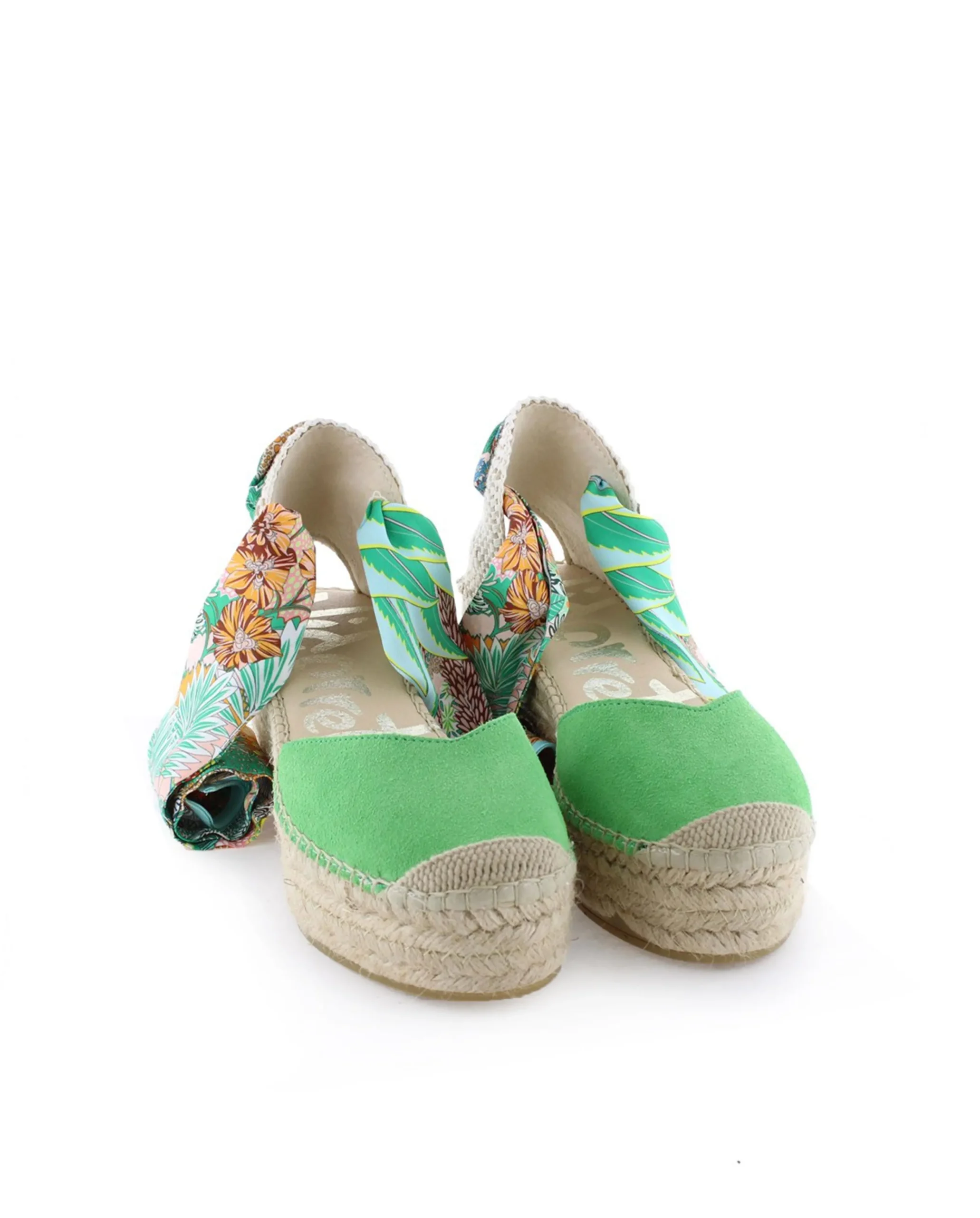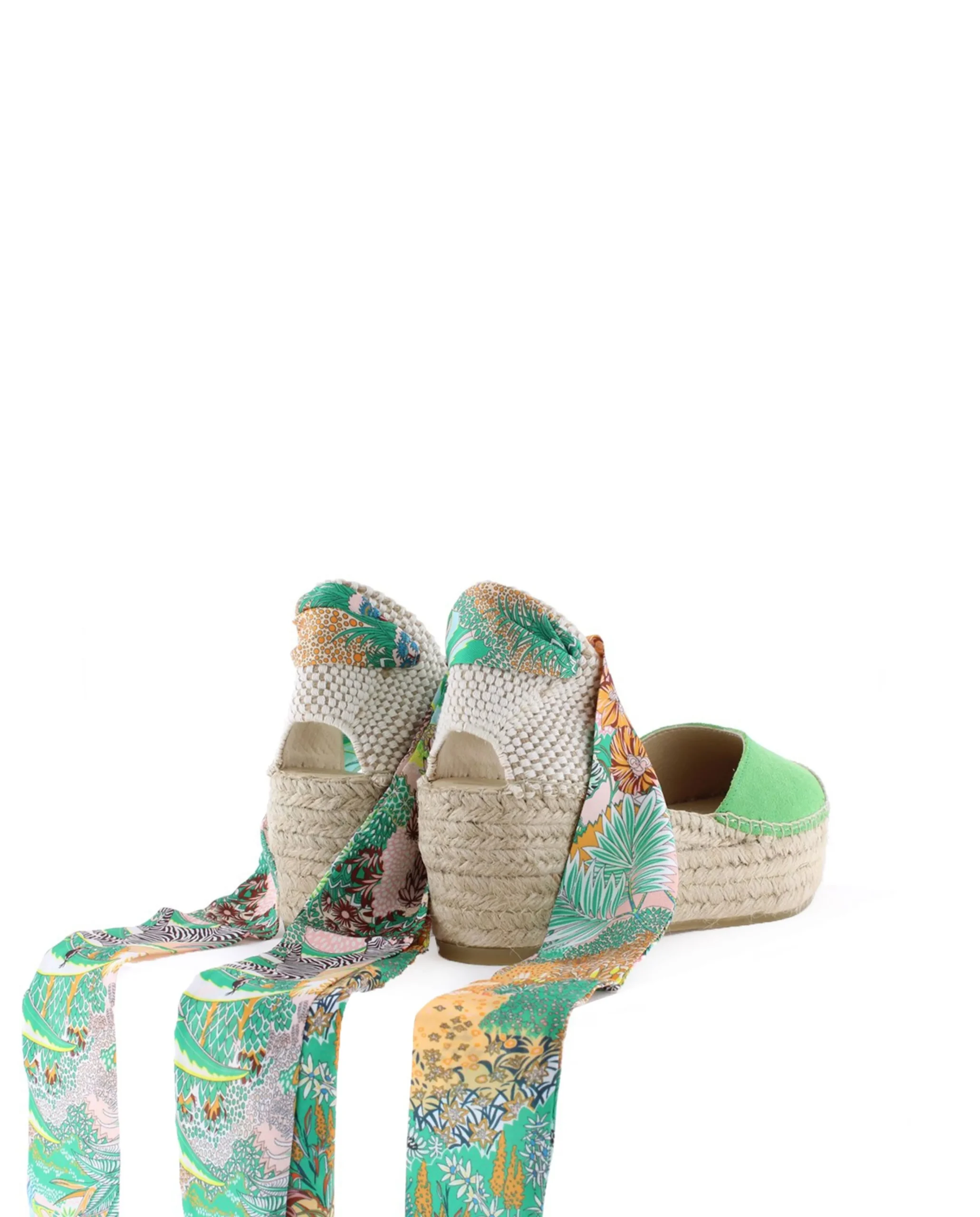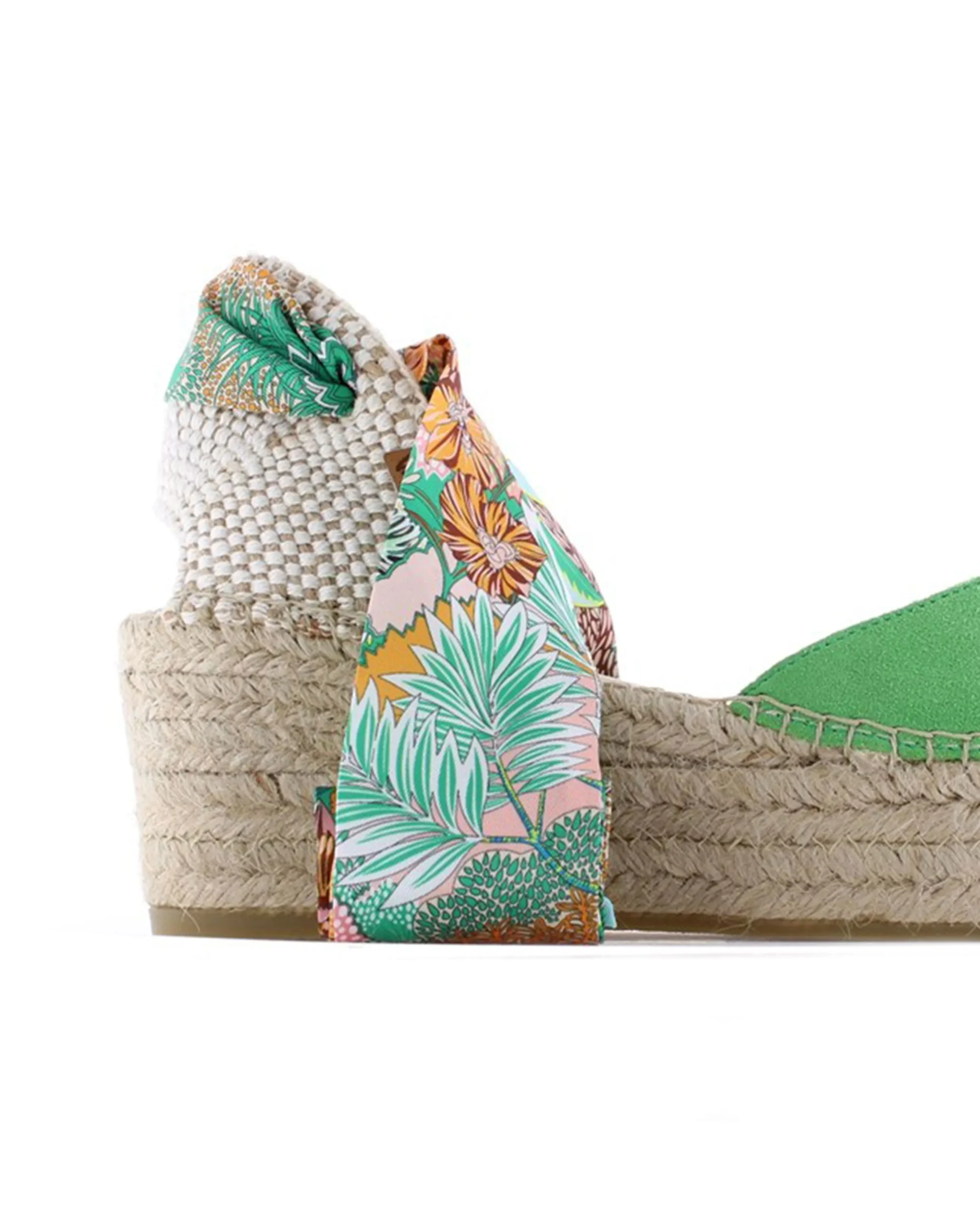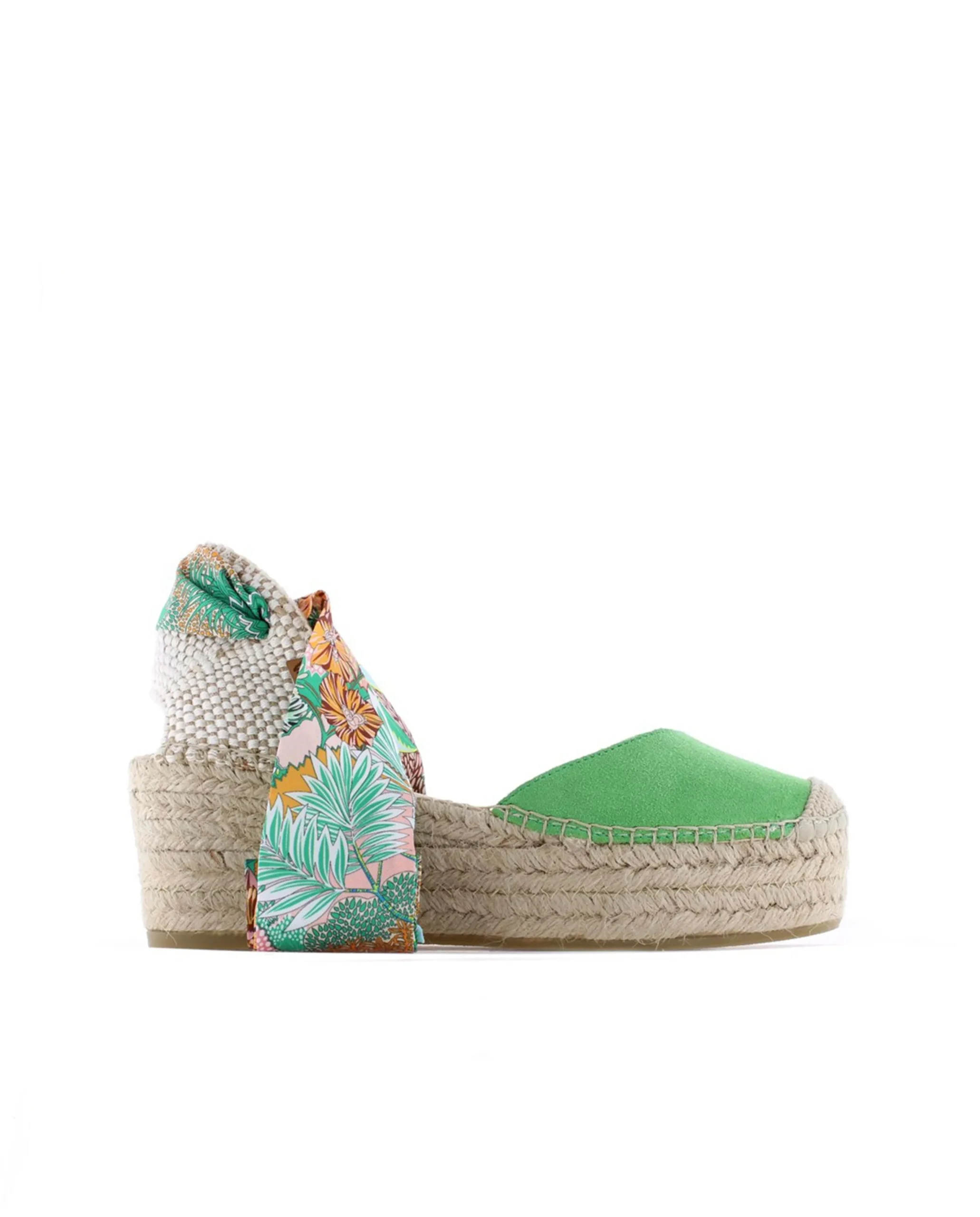 Alpargata de cuña de yute natural de 6 cm en serraje color menta. Plantilla de microfibra transpirable y antibacteriana.