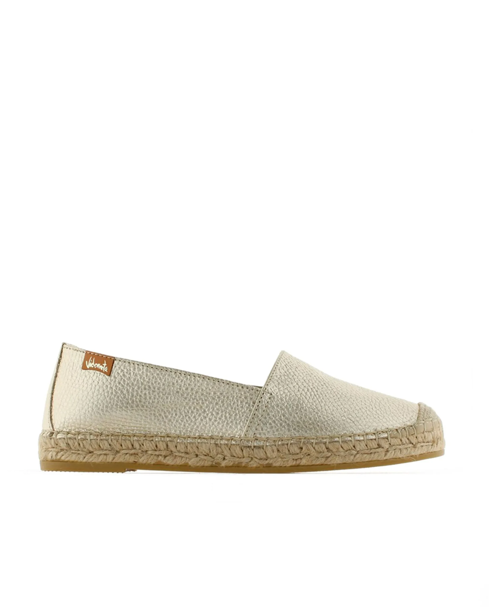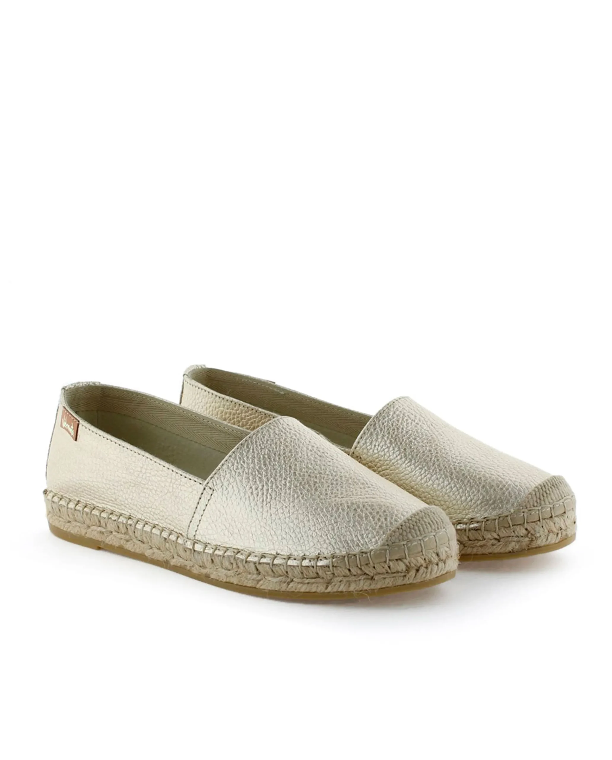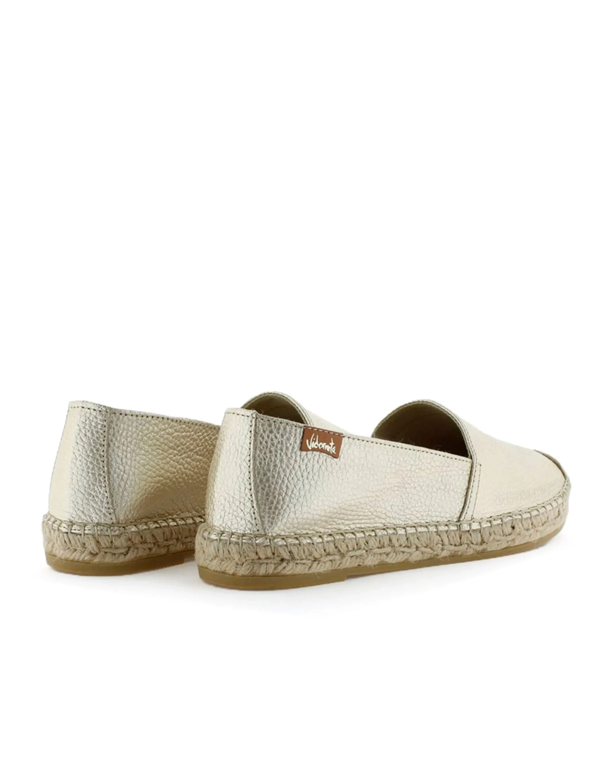 Camping con suela de yute natural de 2 cm en napa color dorado. Plantilla de microfibra transpirable y antibacteriana.