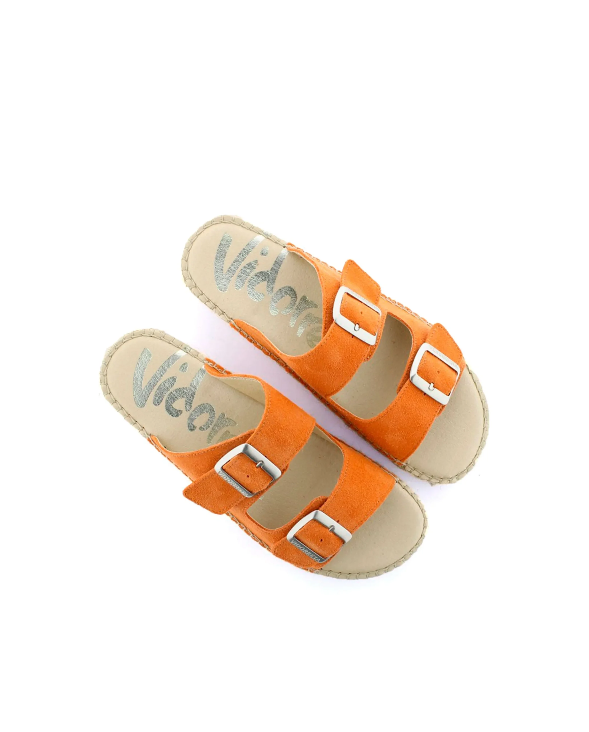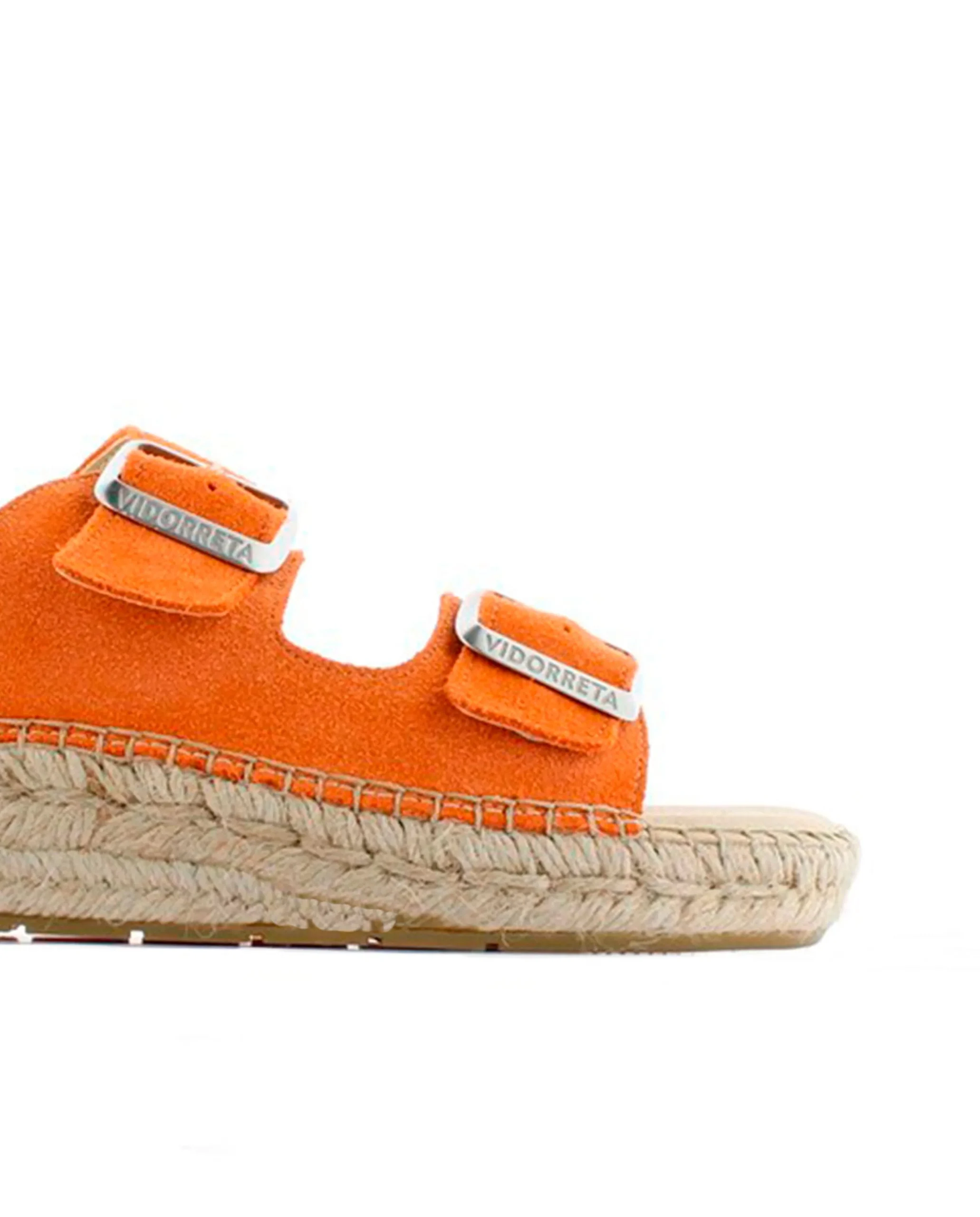 Sandalia con plataforma de yute natural de 3 cm en serraje color naranja. Plantilla de microfibra transpirable y antibacteriana.