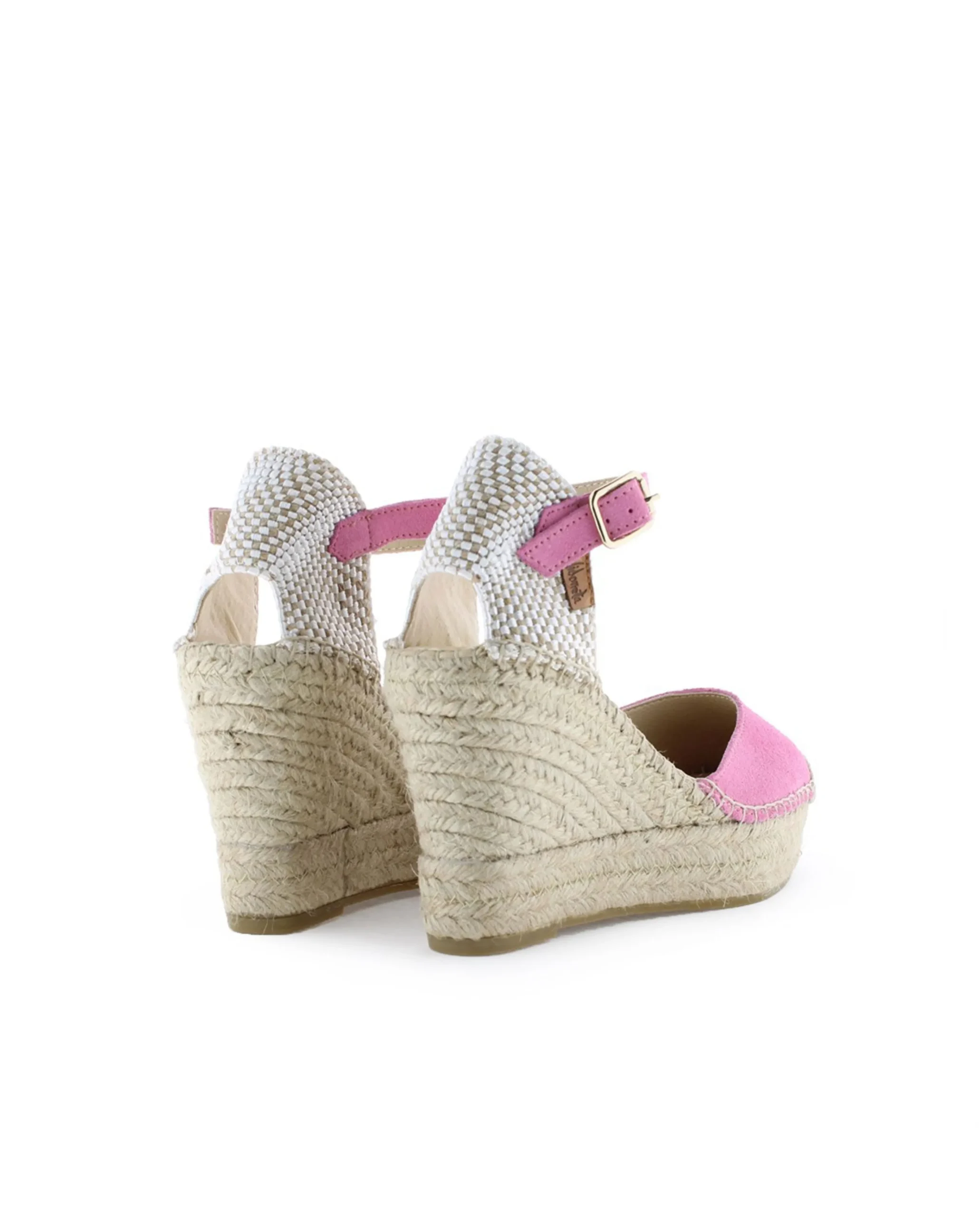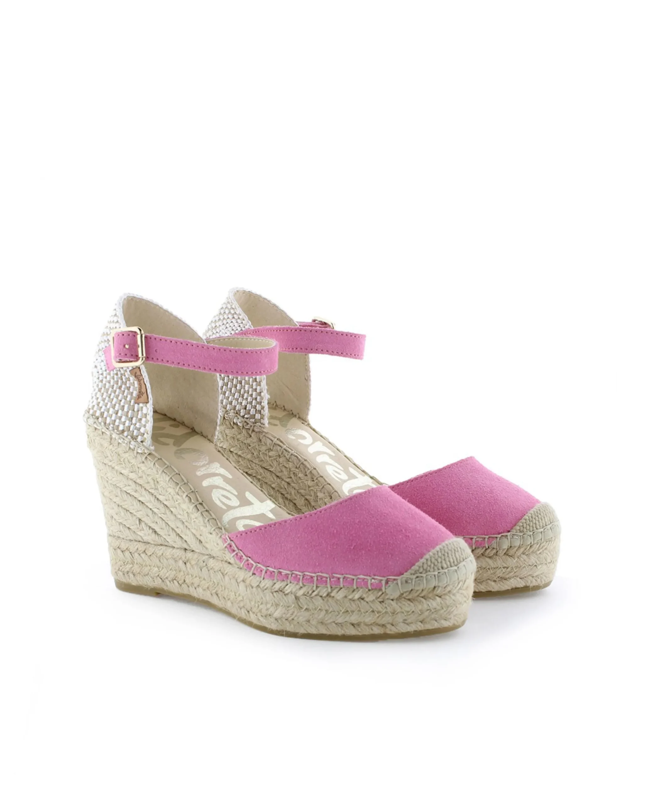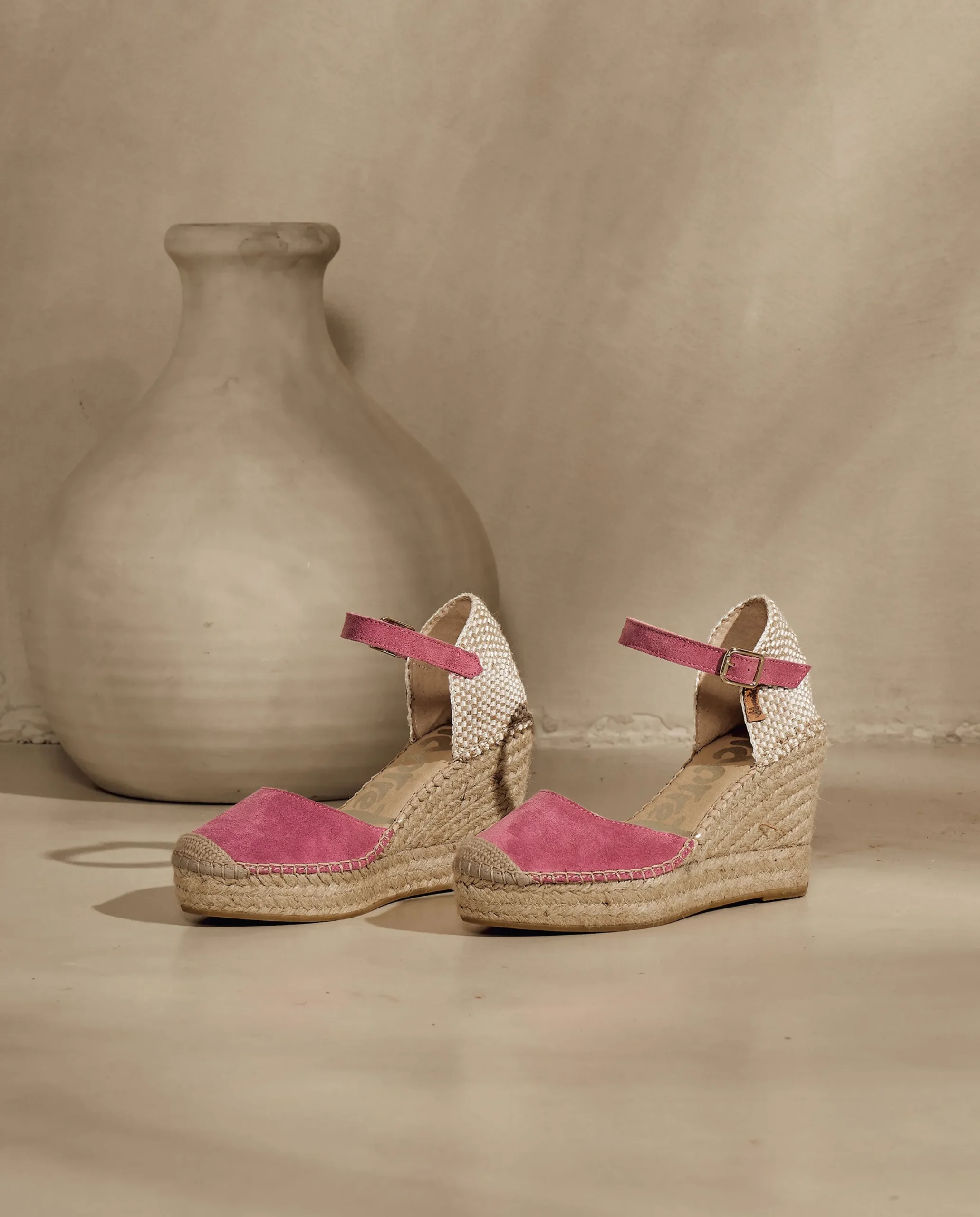 Alpargata de cuña de yute natural de 9,5 cm en serraje color frambuesa. Plantilla de microfibra transpirable y antibacteriana.