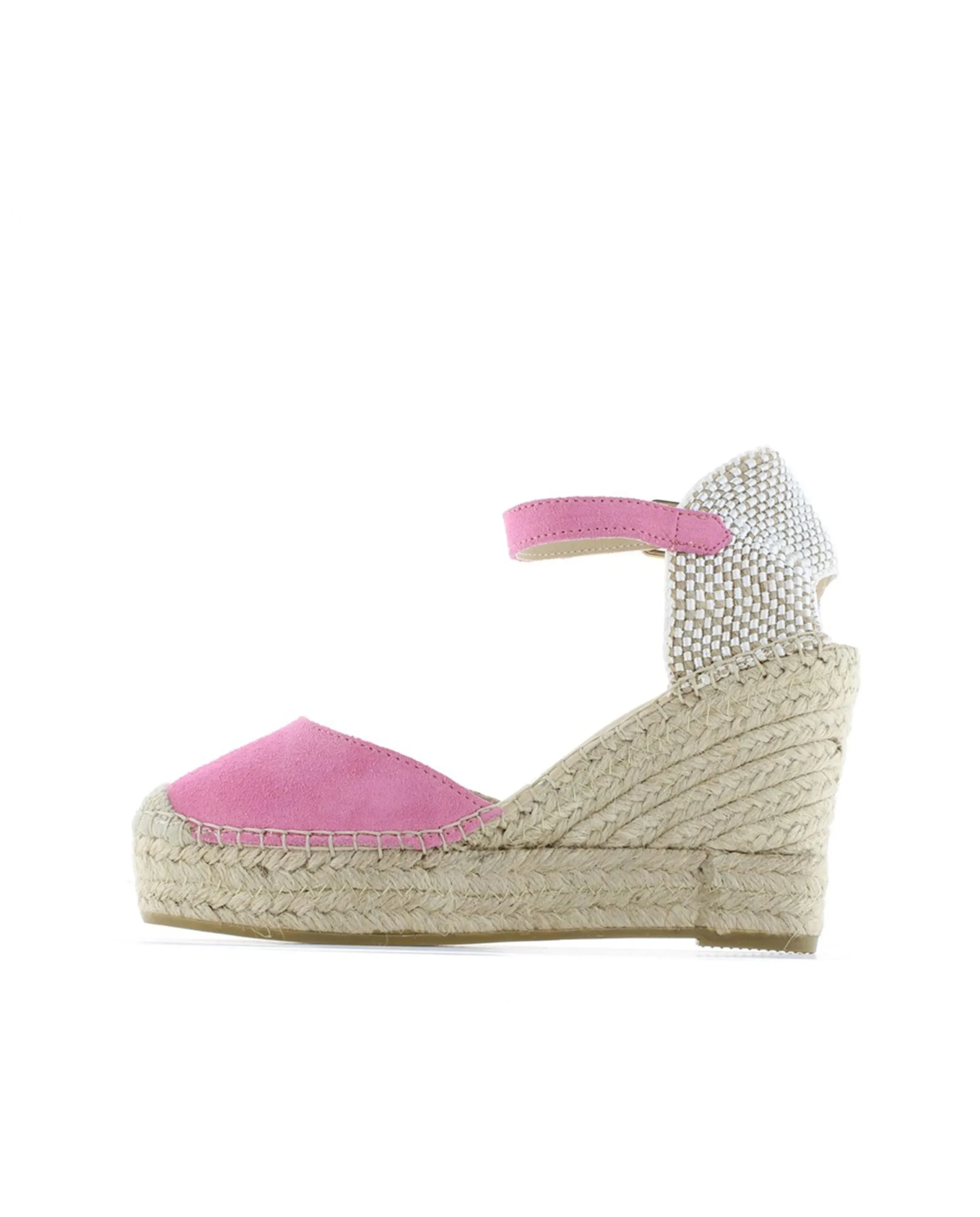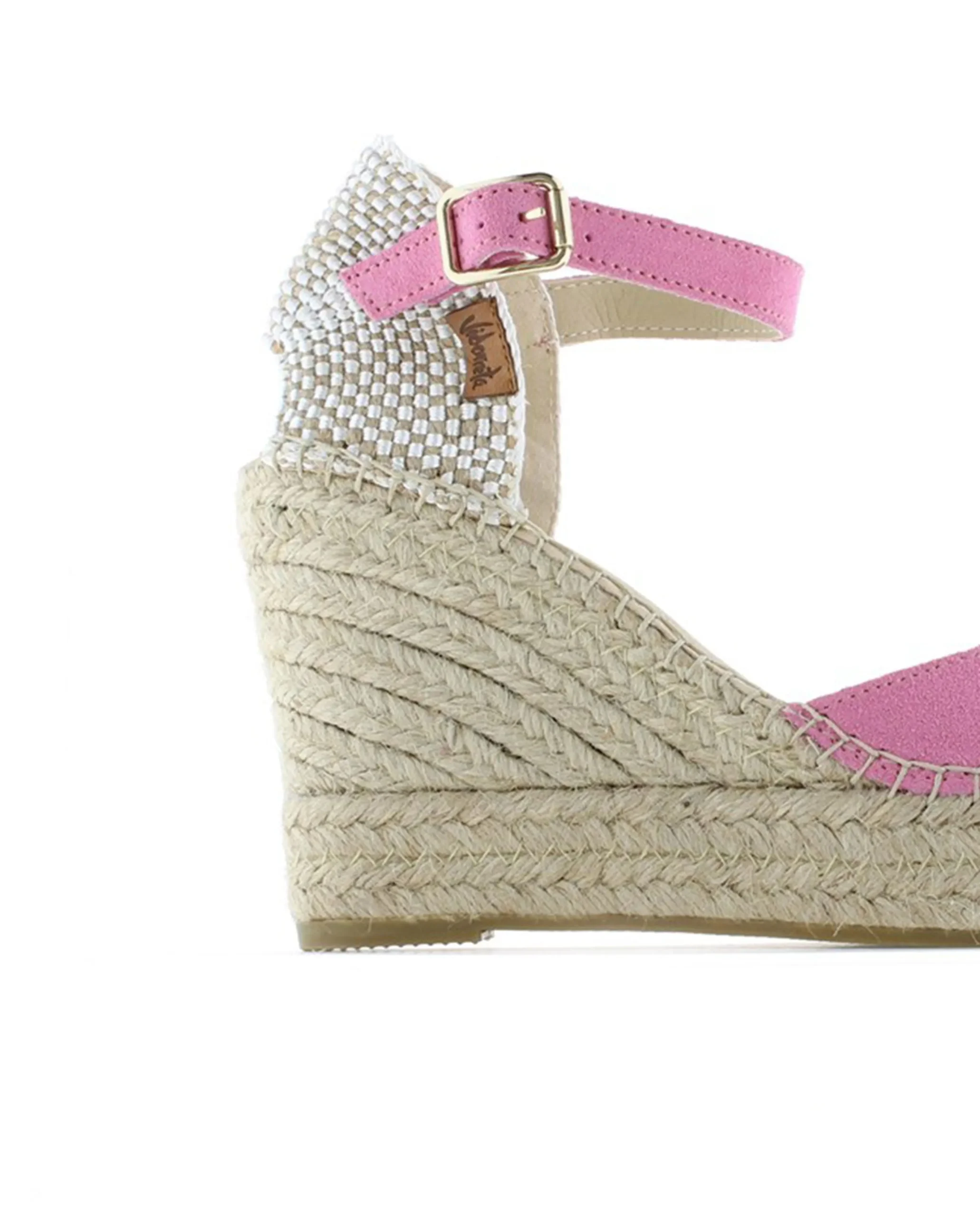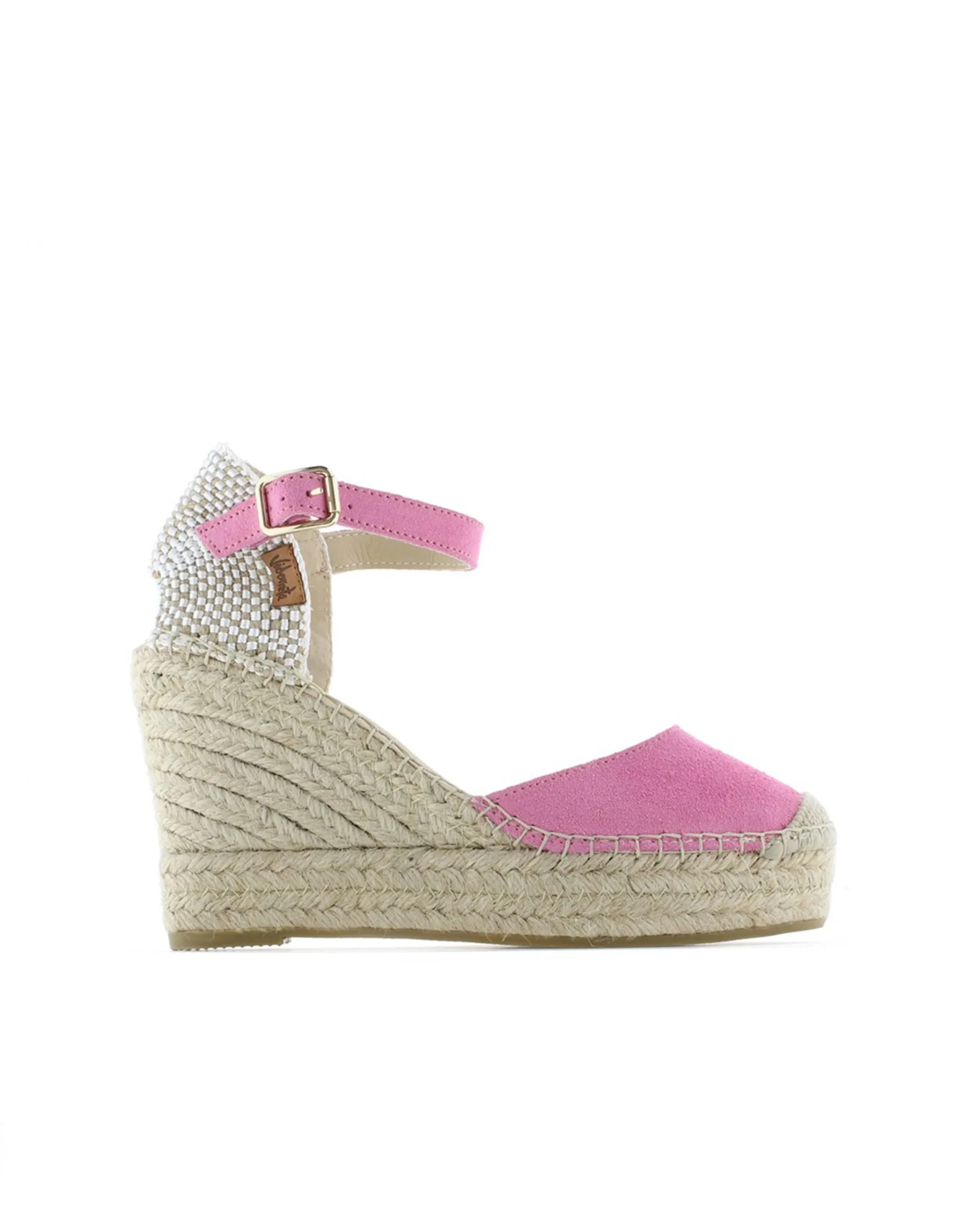 Alpargata de cuña de yute natural de 9,5 cm en serraje color frambuesa. Plantilla de microfibra transpirable y antibacteriana.
