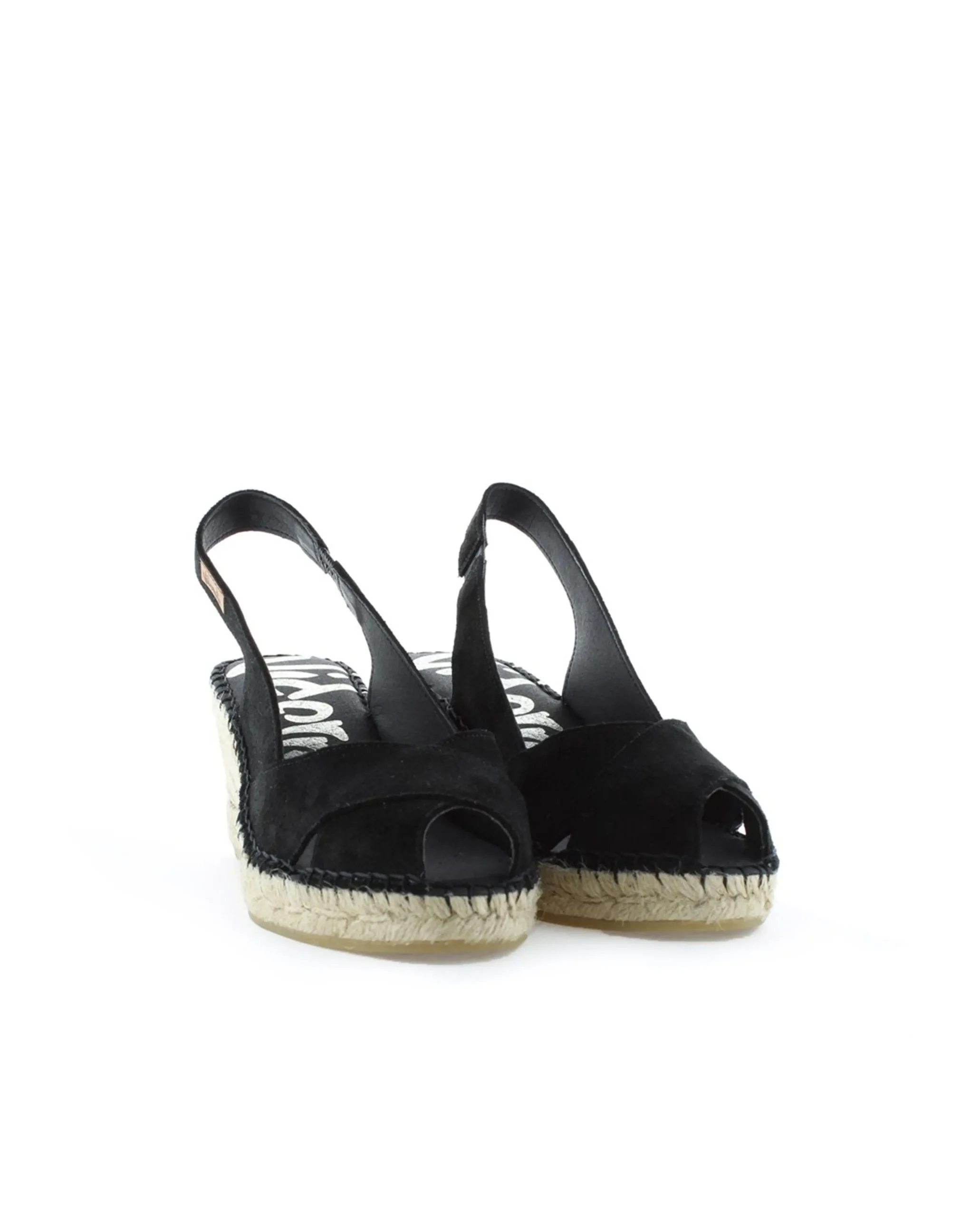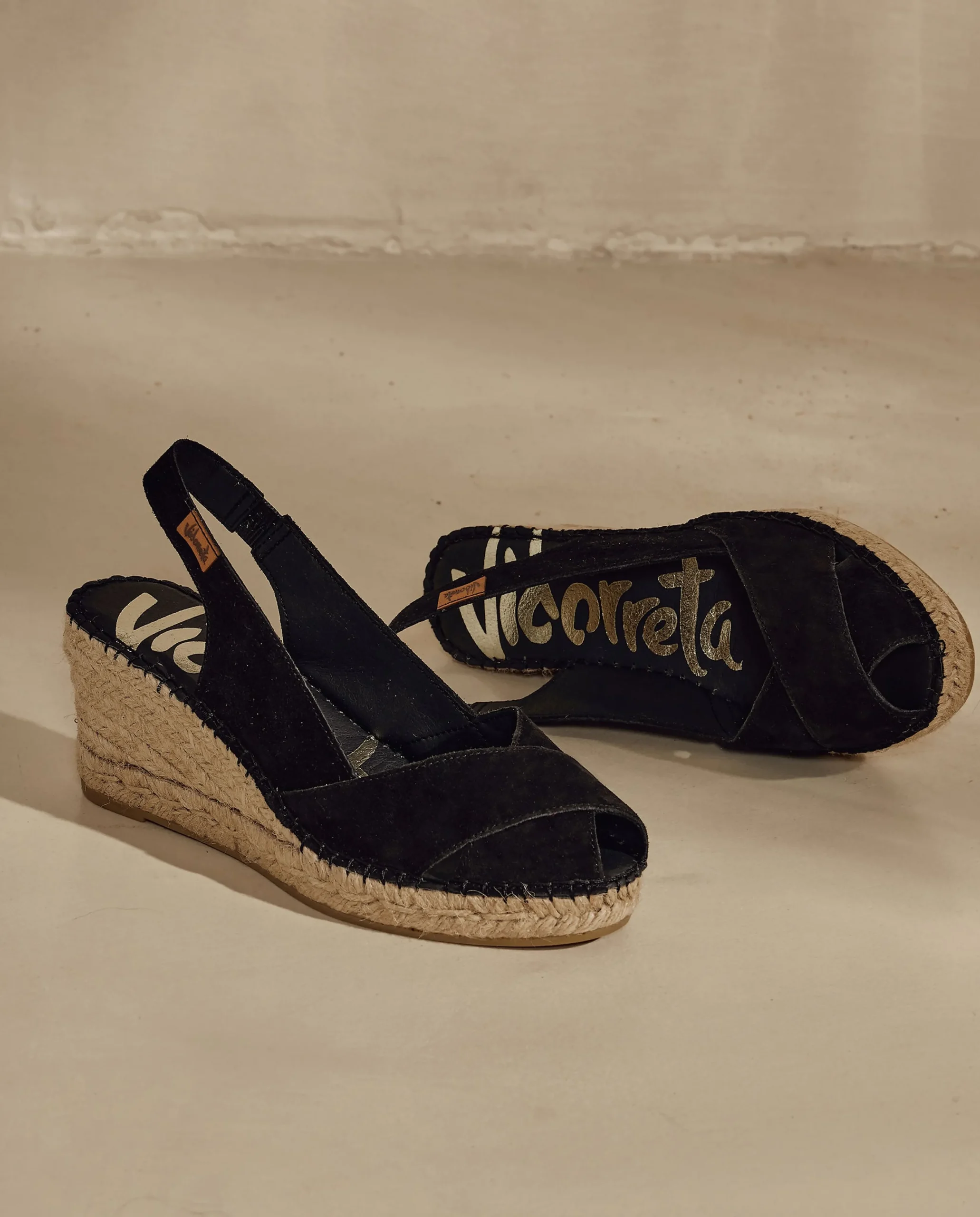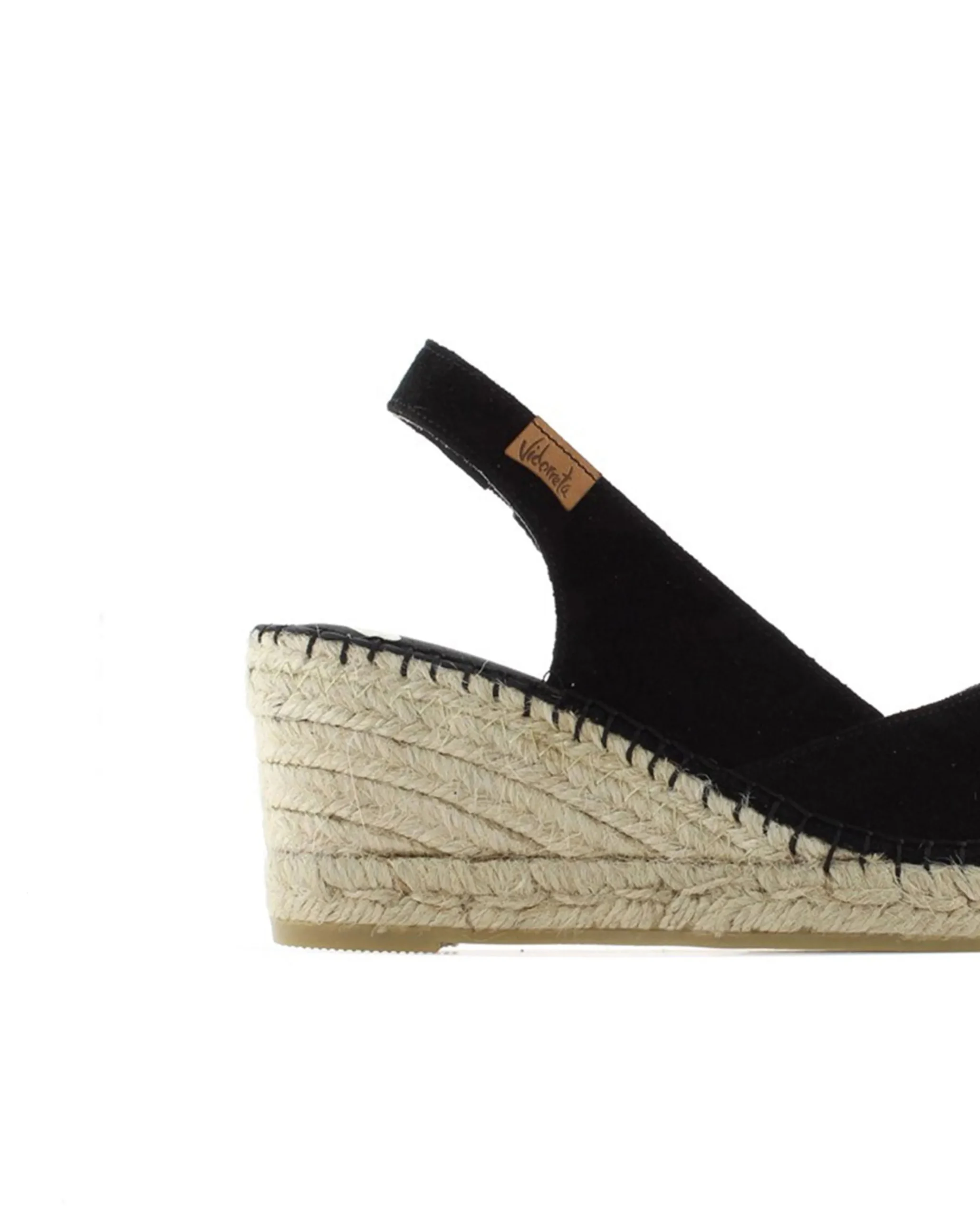 Sandalia de cuña de yute natural de 7 cm en serraje color negro. Plantilla de microfibra transpirable y antibacteriana.