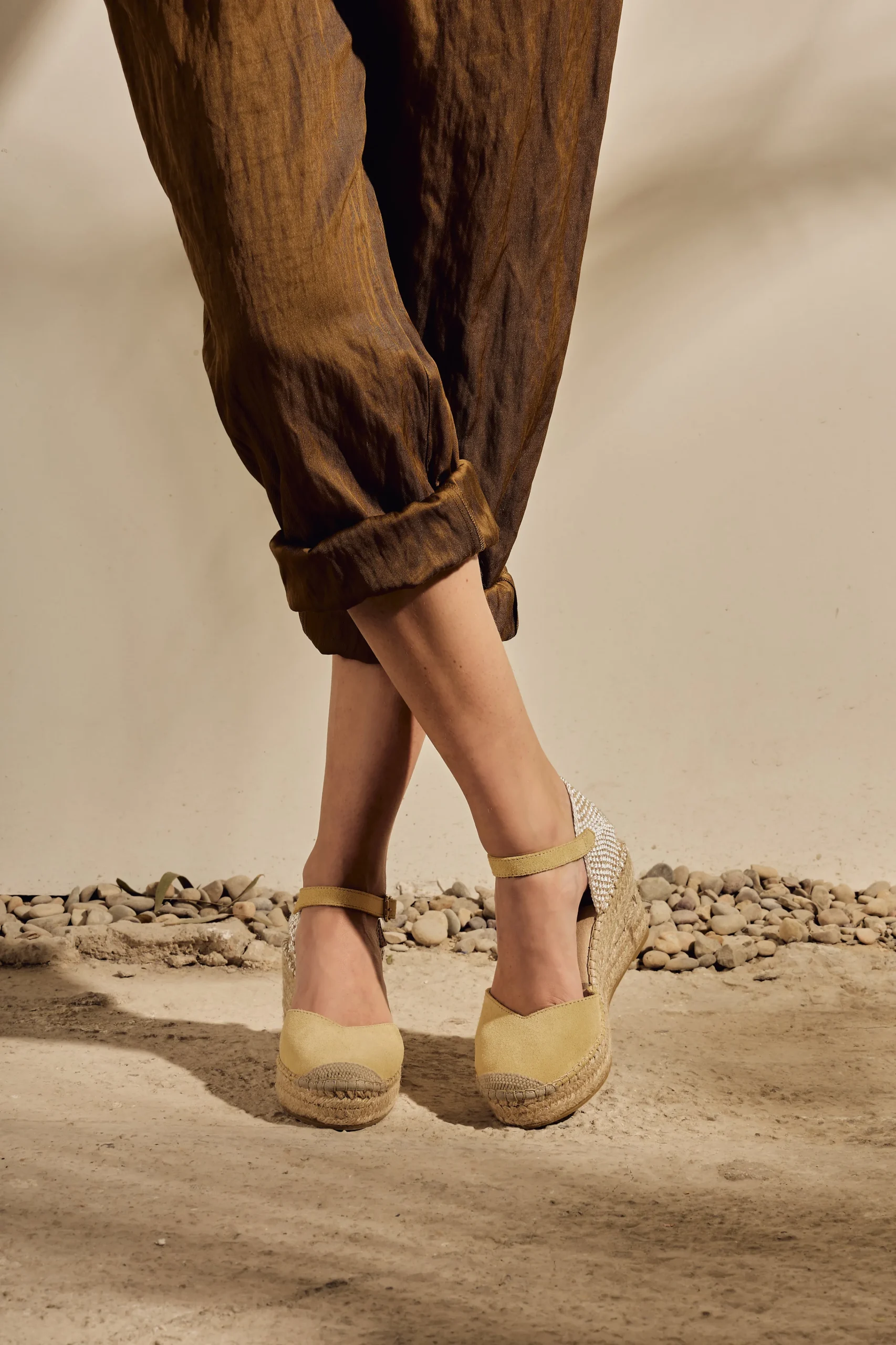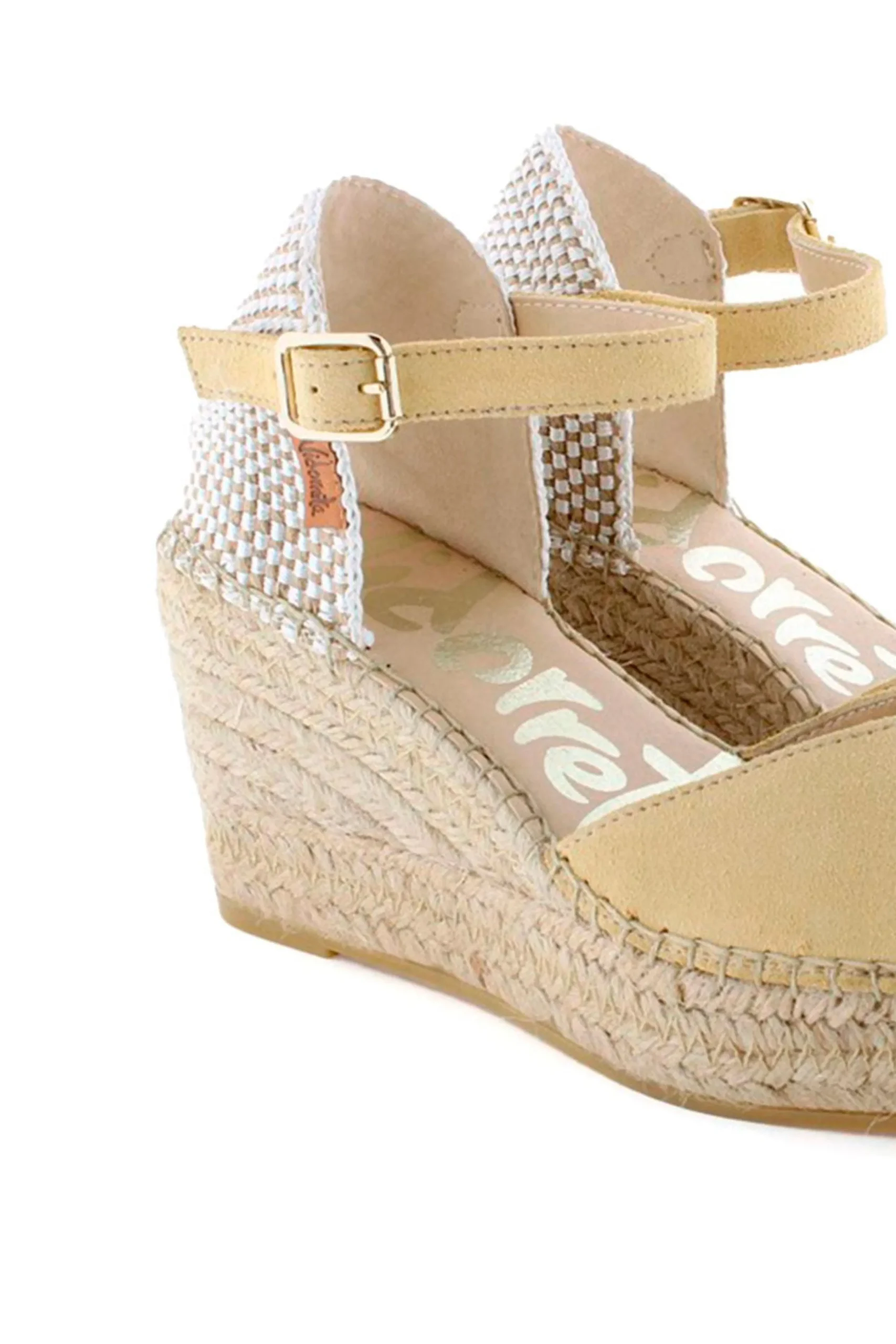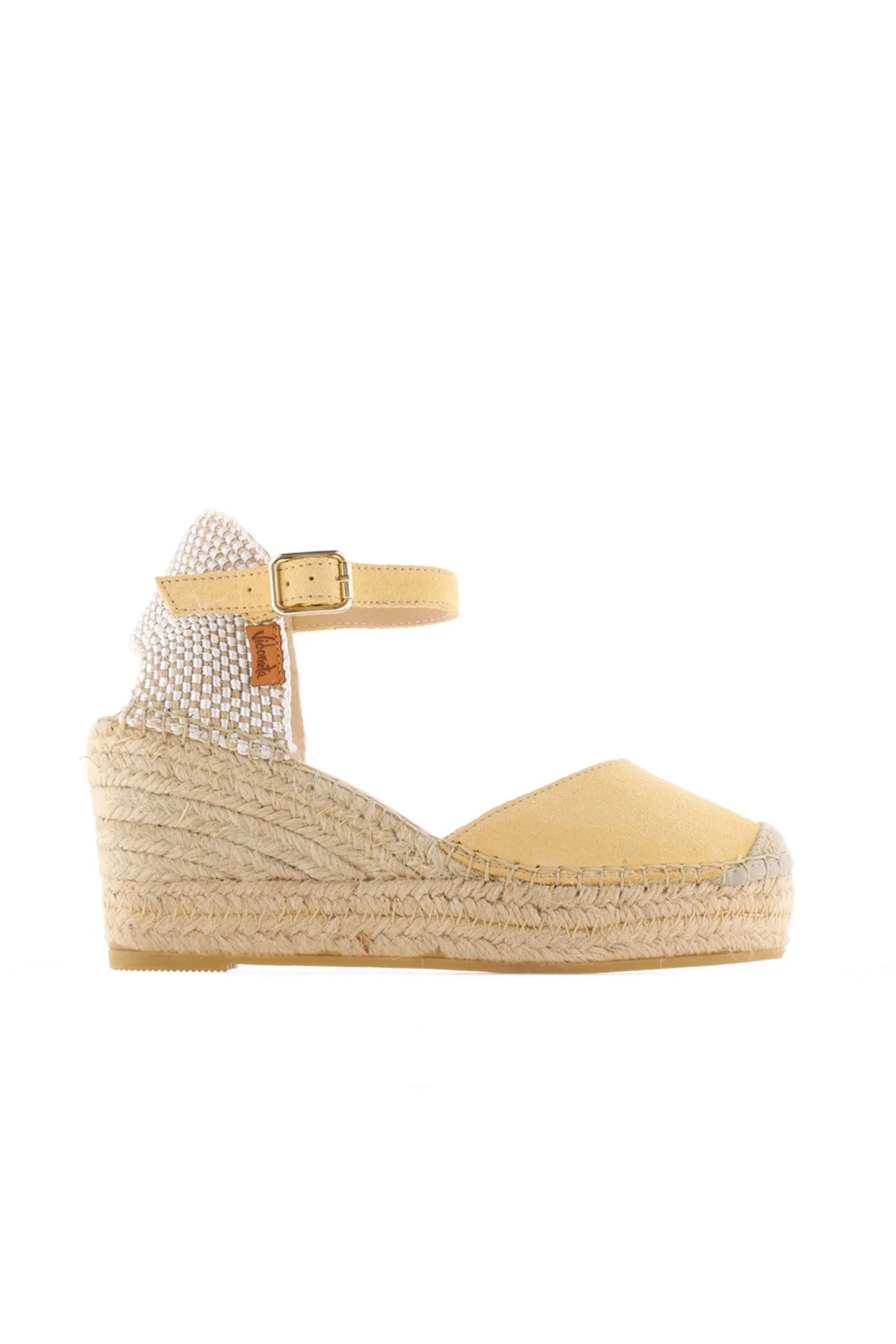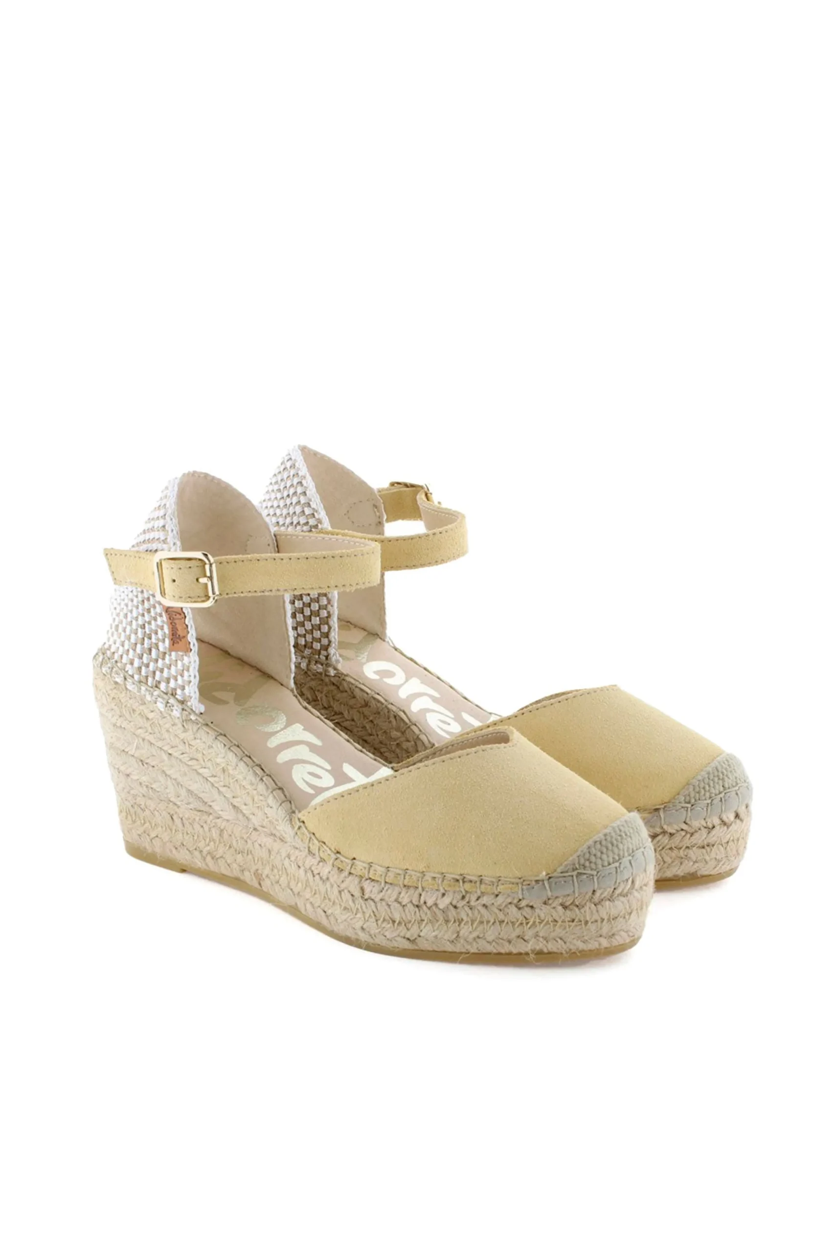 Alpargata de cuña de yute natural de 8 cm en serraje color limón. Plantilla de microfibra transpirable y antibacteriana.