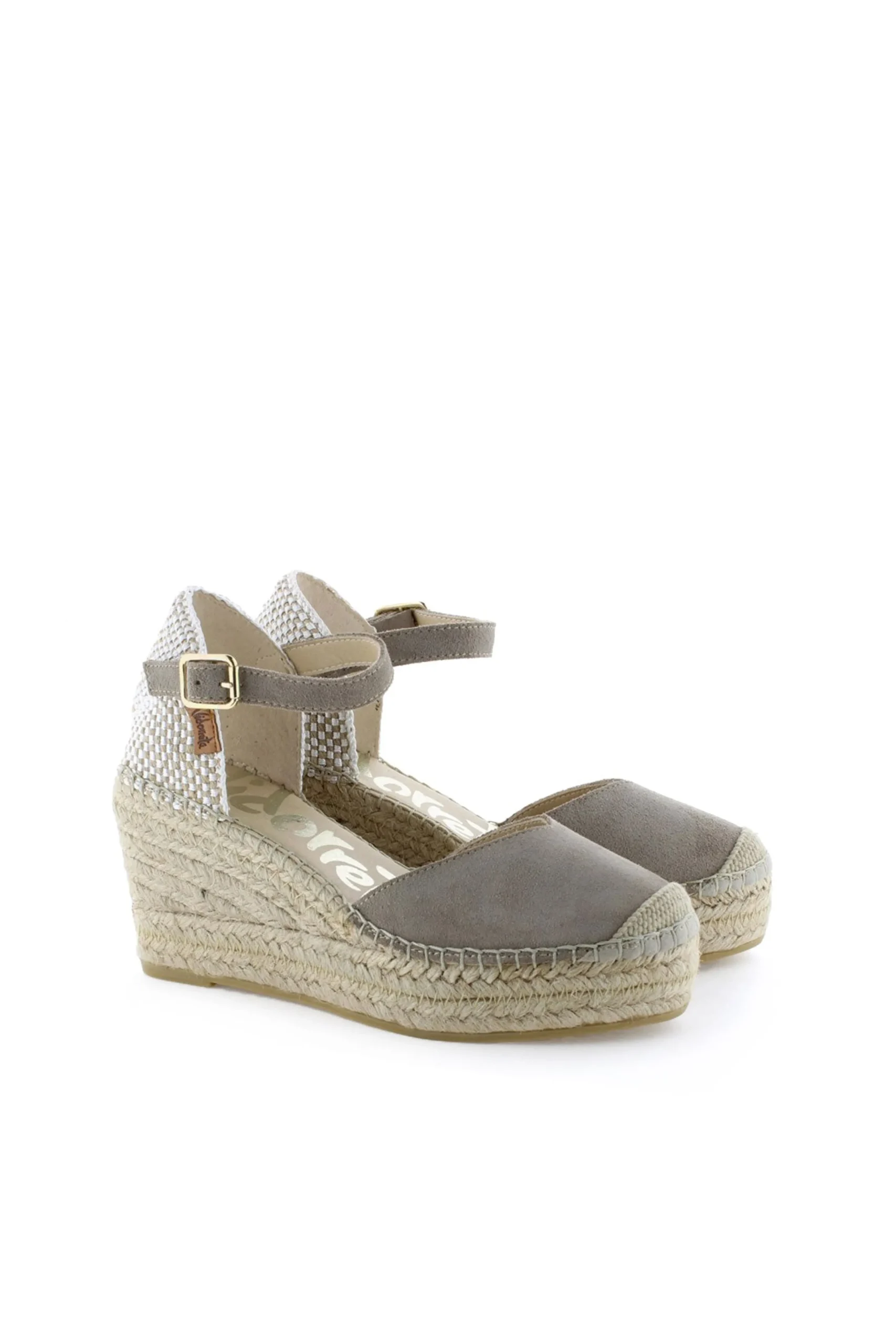 Alpargata de cuña de yute natural de 8 cm en serraje color taupe. Plantilla de microfibra transpirable y antibacteriana.