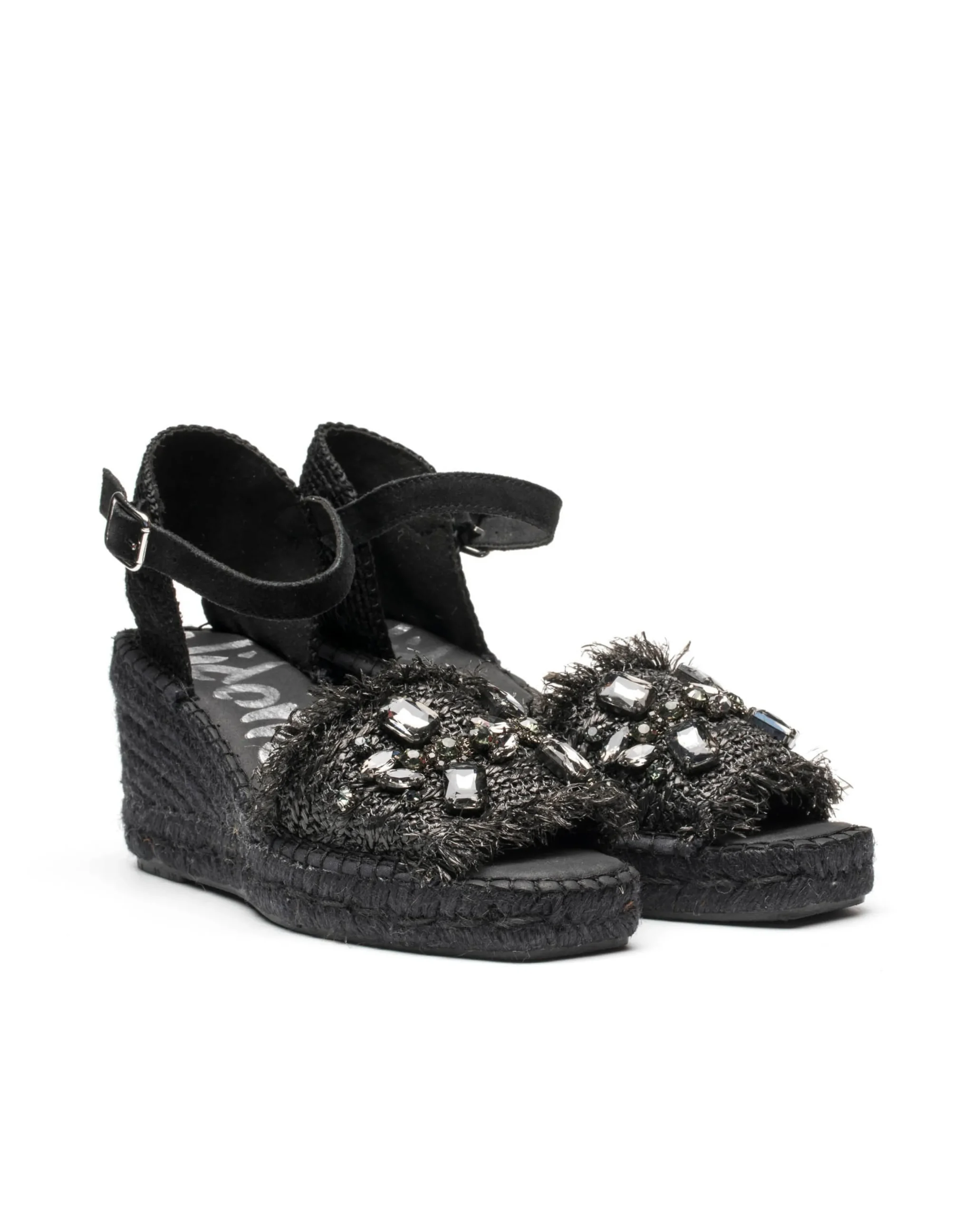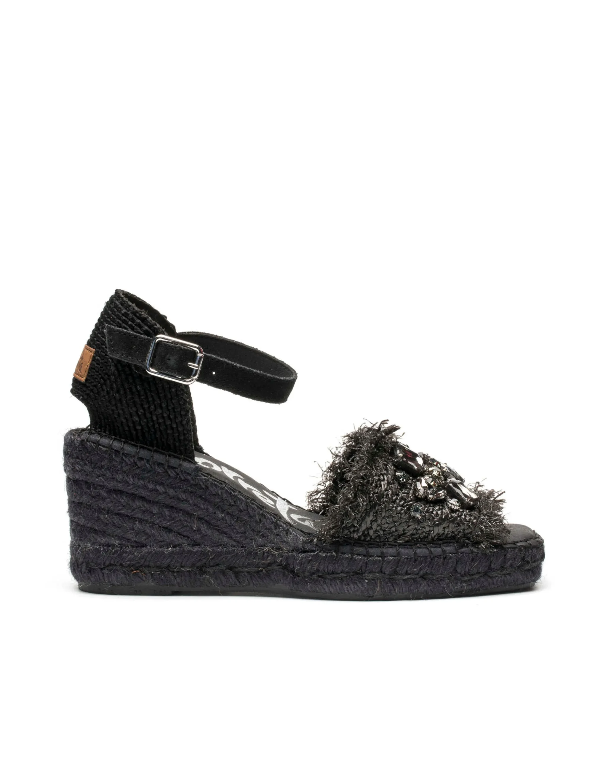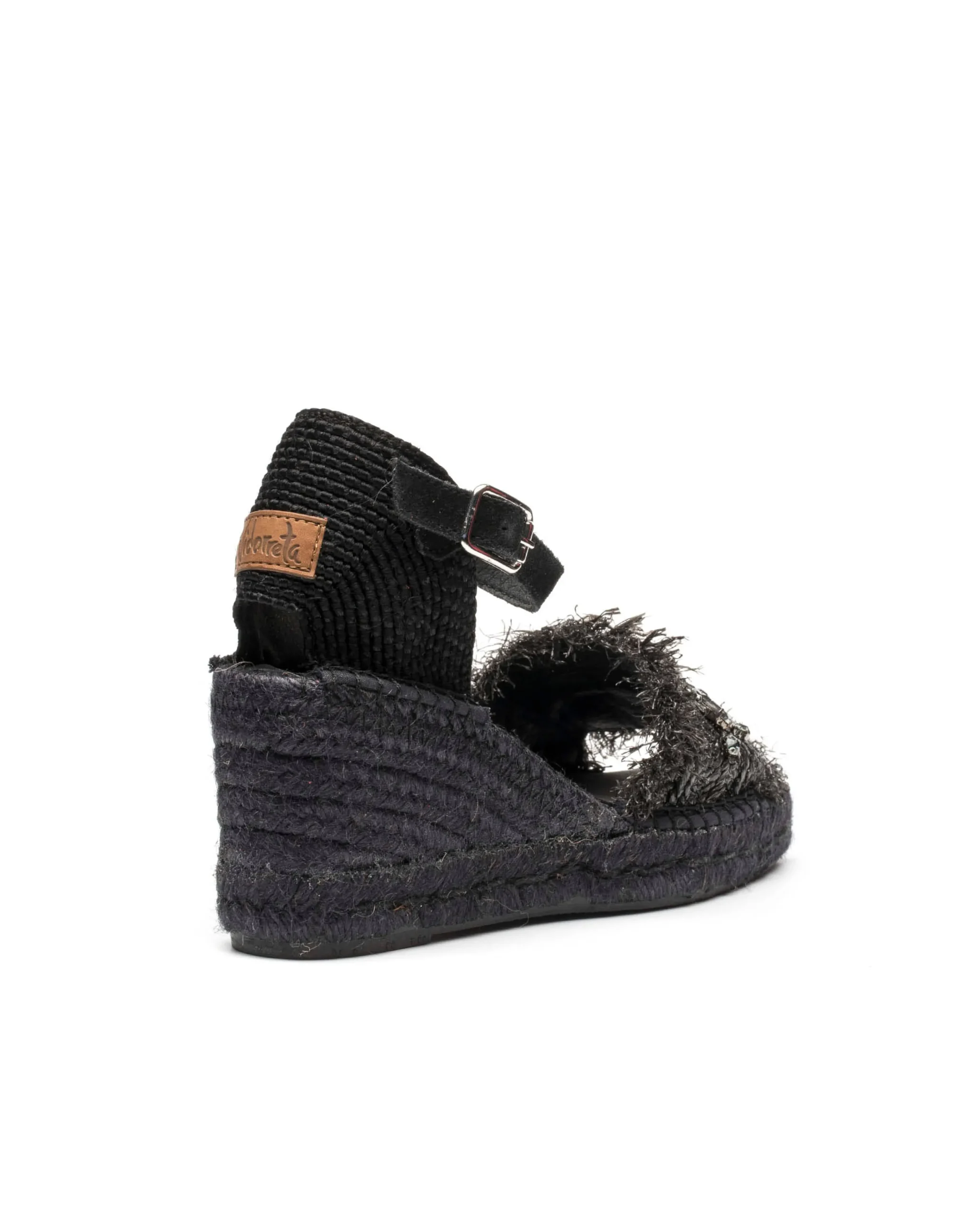 Sandalia de cuña de yute natural de 8 cm en rafia color negro. Plantilla de microfibra transpirable y antibacteriana.