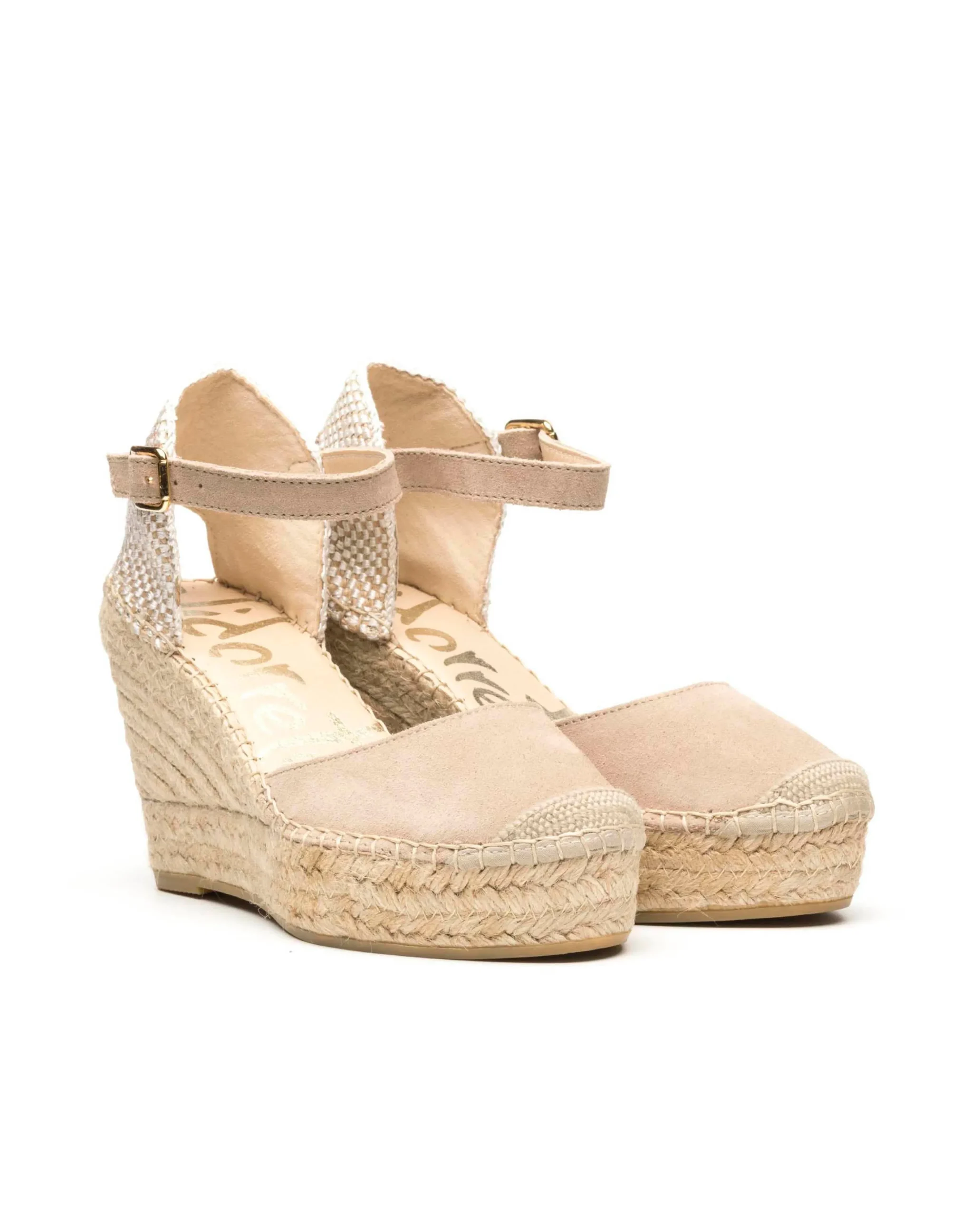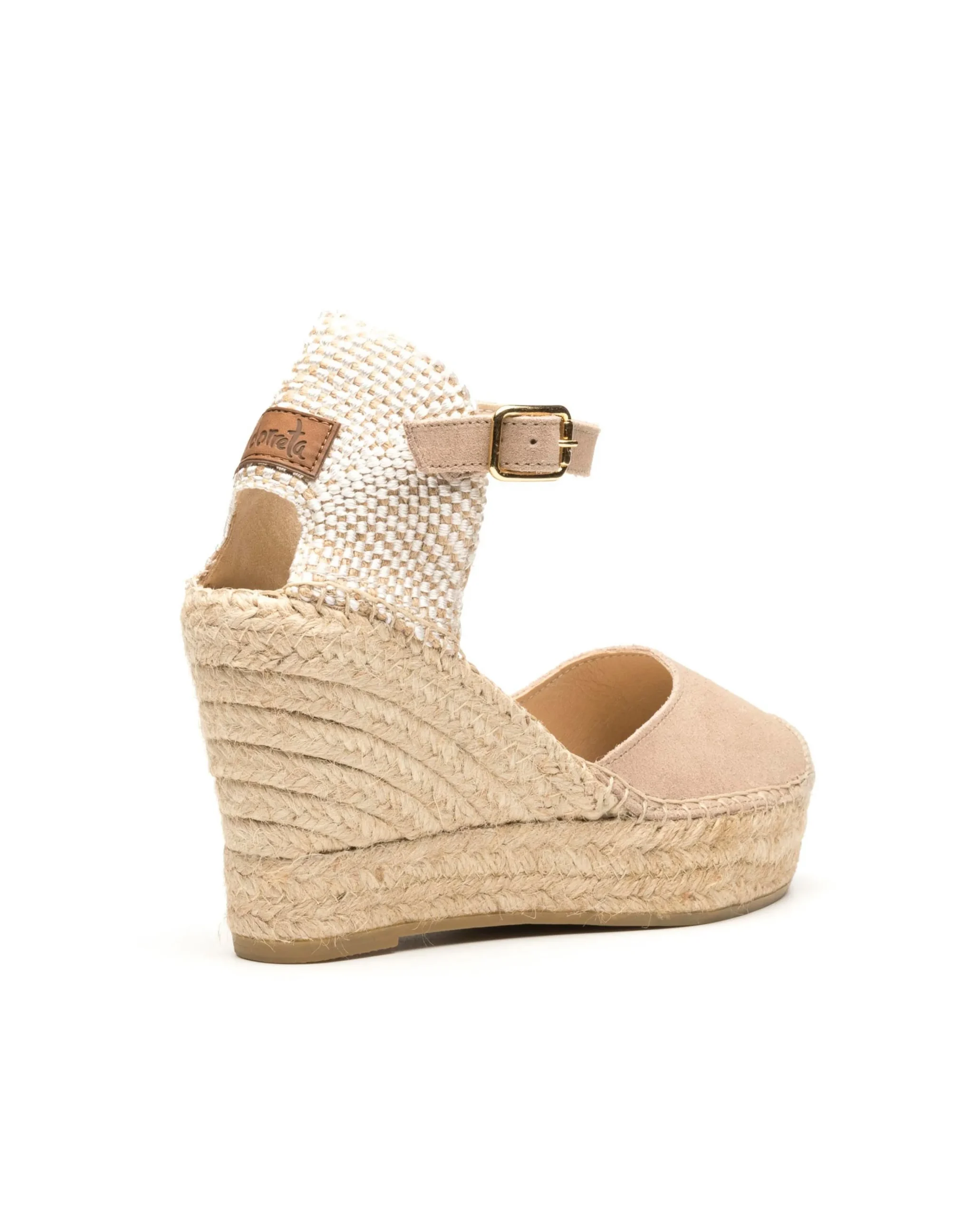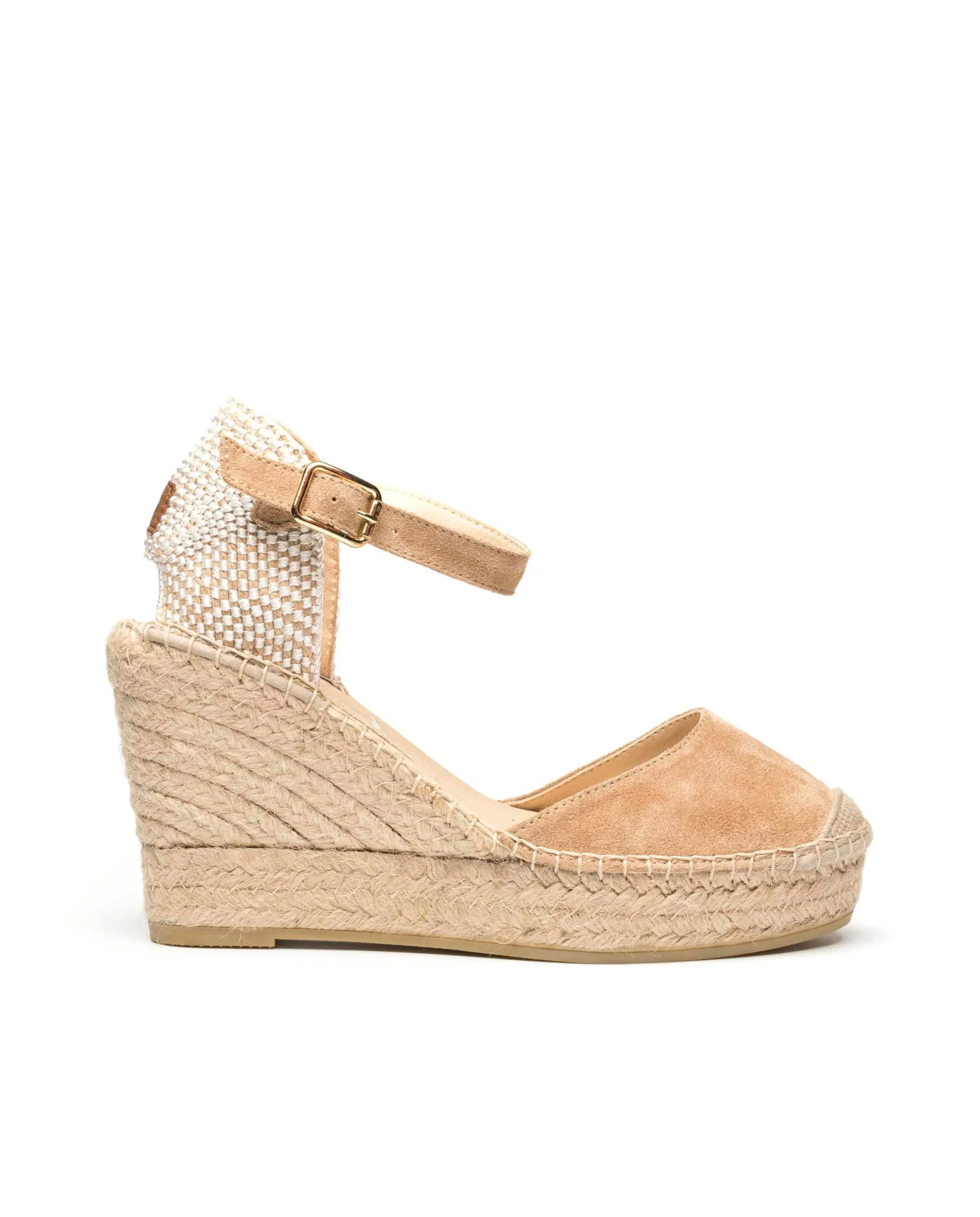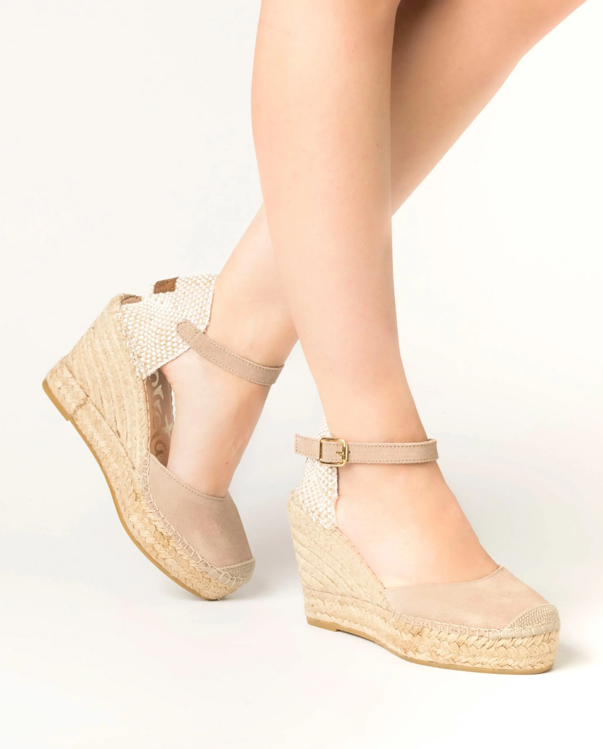 Alpargata de cuña de yute natural de 9,5 cm en serraje color cuerda. Plantilla de microfibra transpirable y antibacteriana.