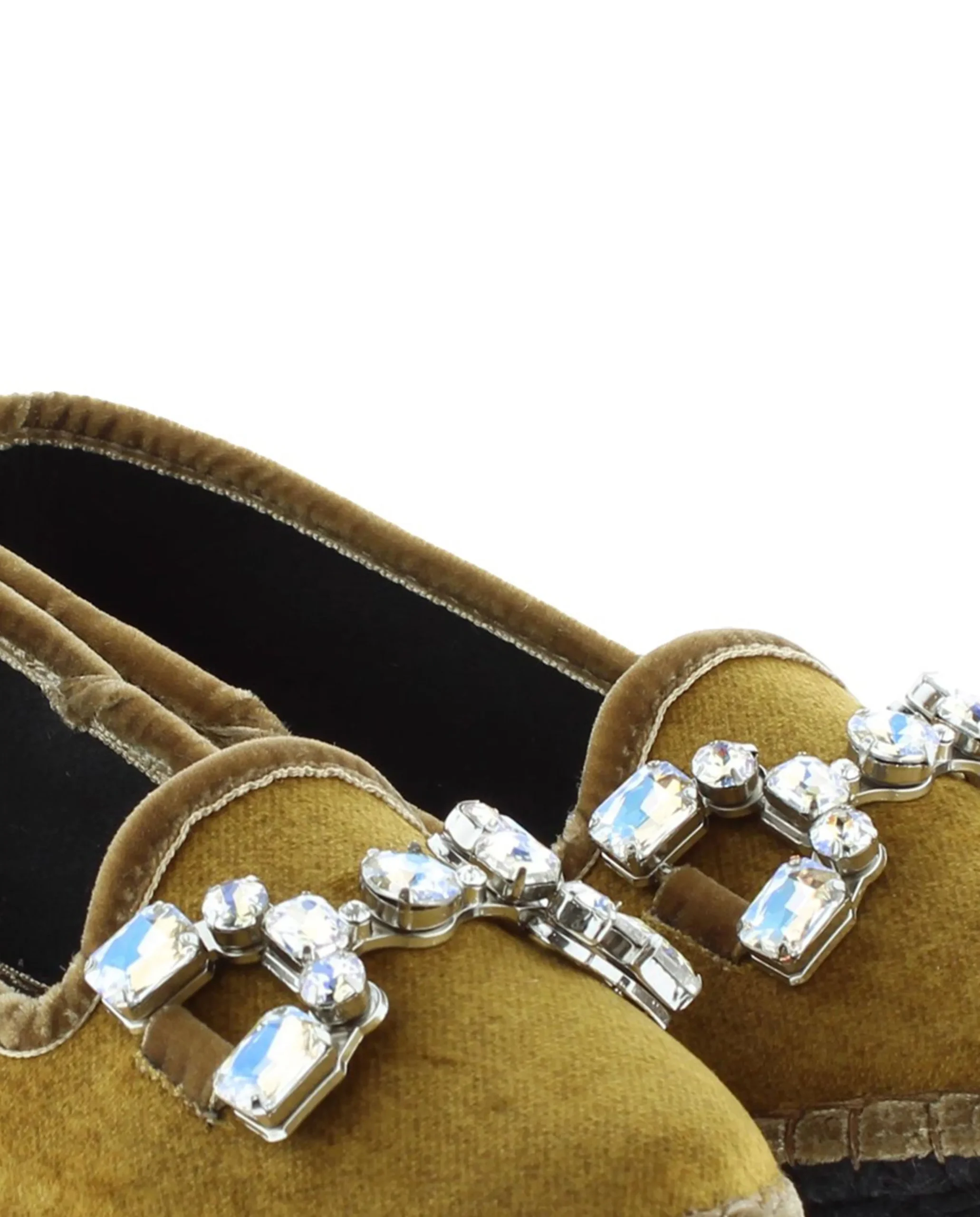 Slipper con suela de yute natural de 2 cm en terciopelo color mostaza. Plantilla de microfibra transpirable y antibacteriana.