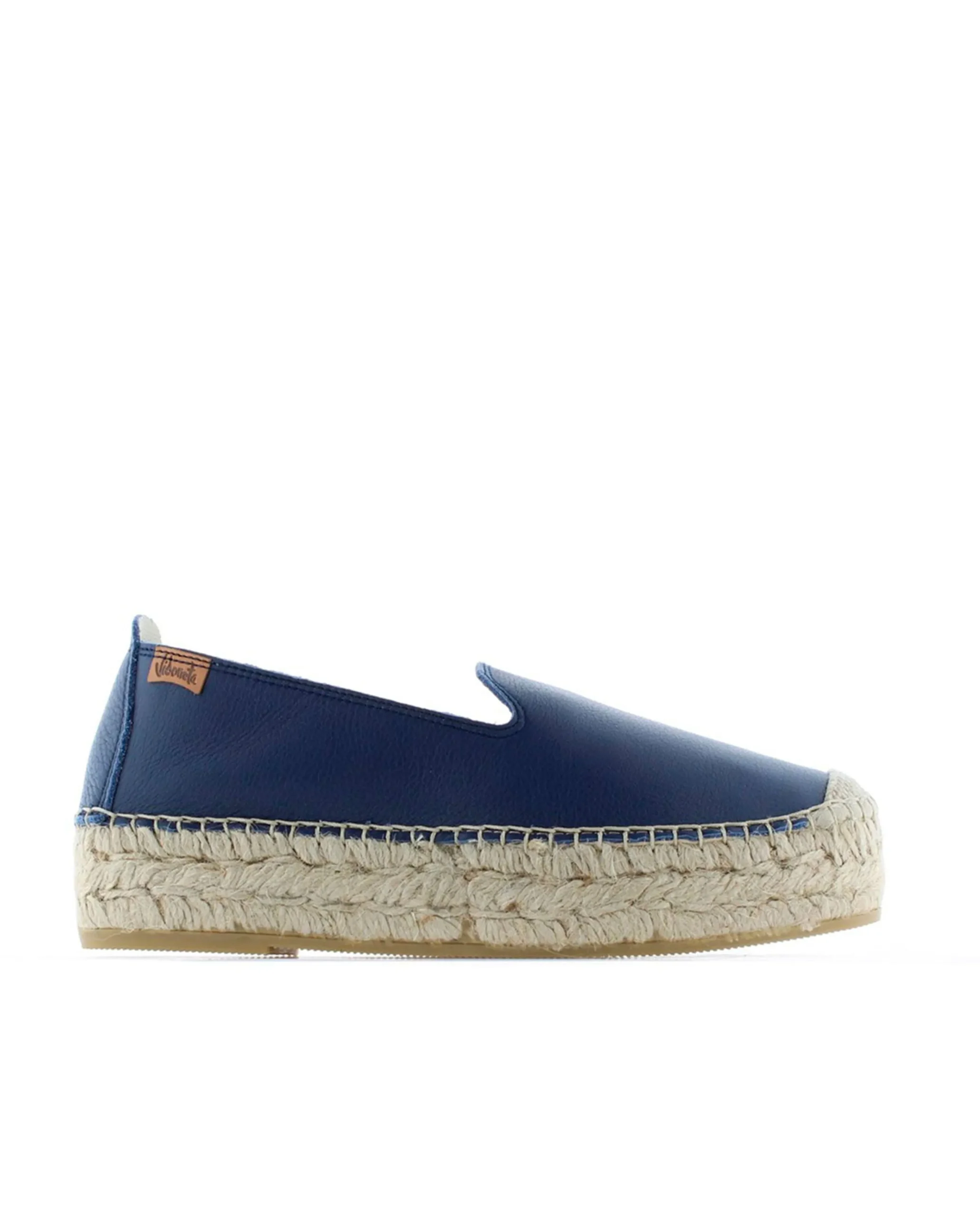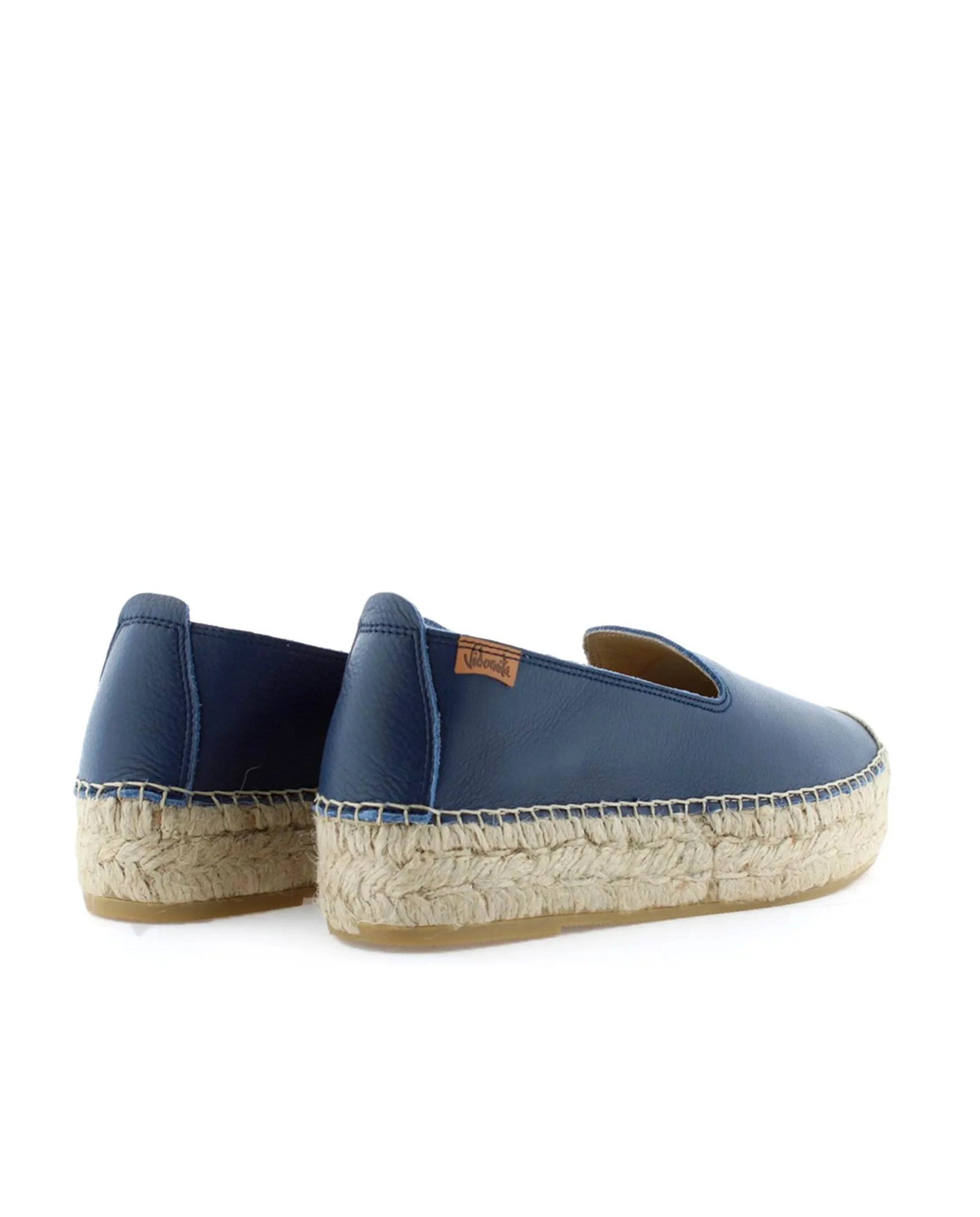 Slipper de plataforma de yute natural de 3 cm en napa color marino. Plantilla de microfibra transpirable y antibacteriana.