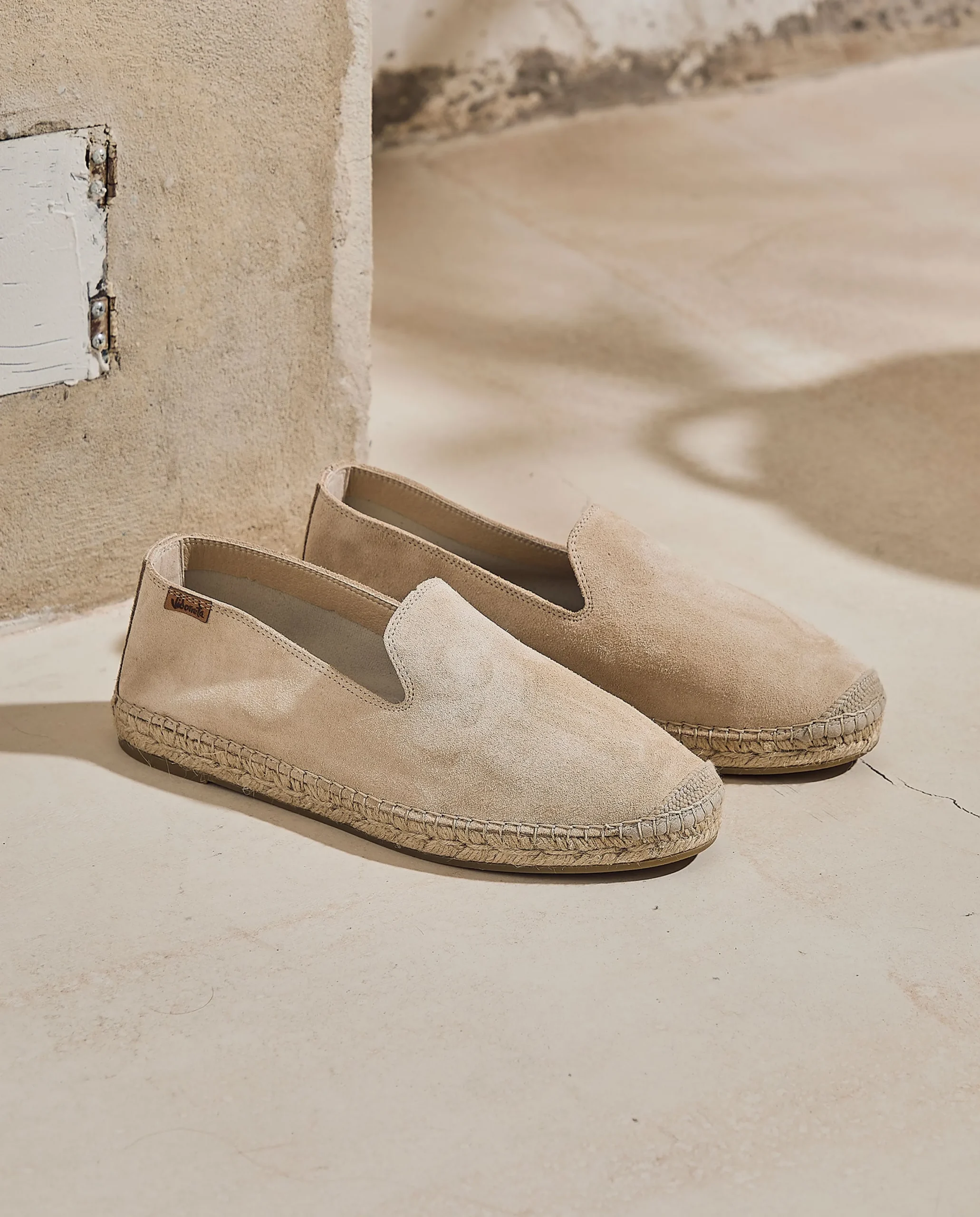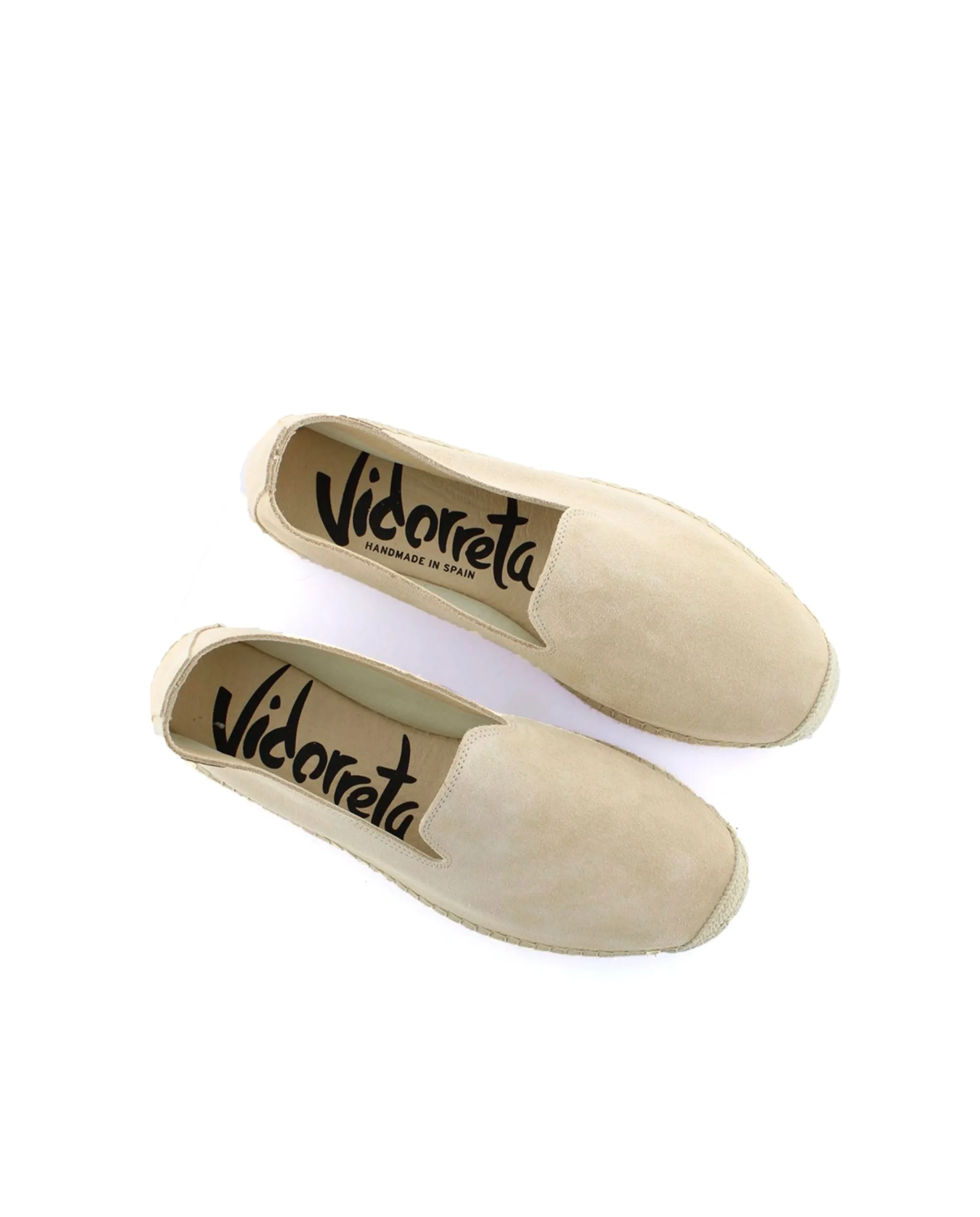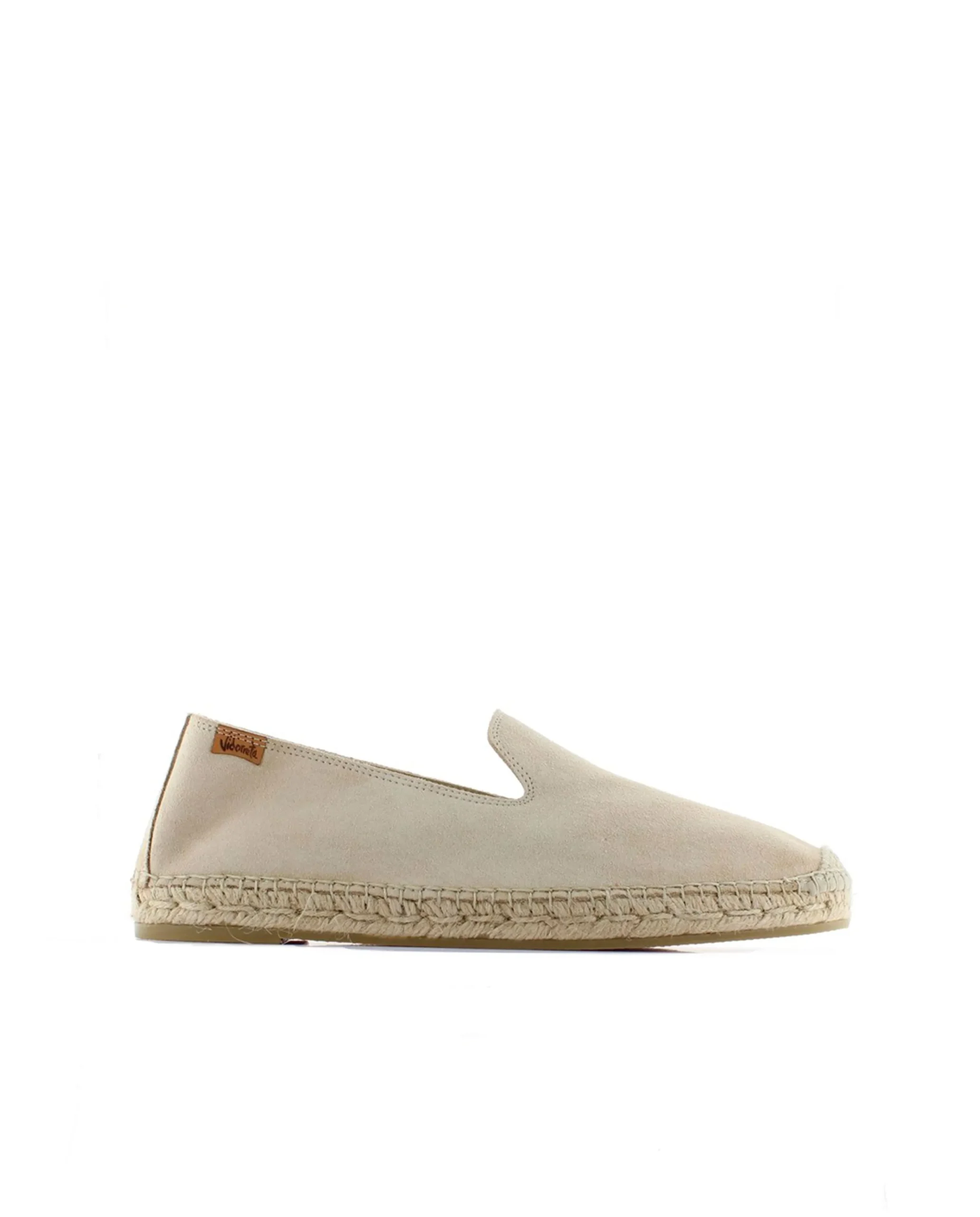 Slipper con piso de yute natural de 2 cm en serraje color arena. Plantilla de microfibra transpirable y antibacteriana.