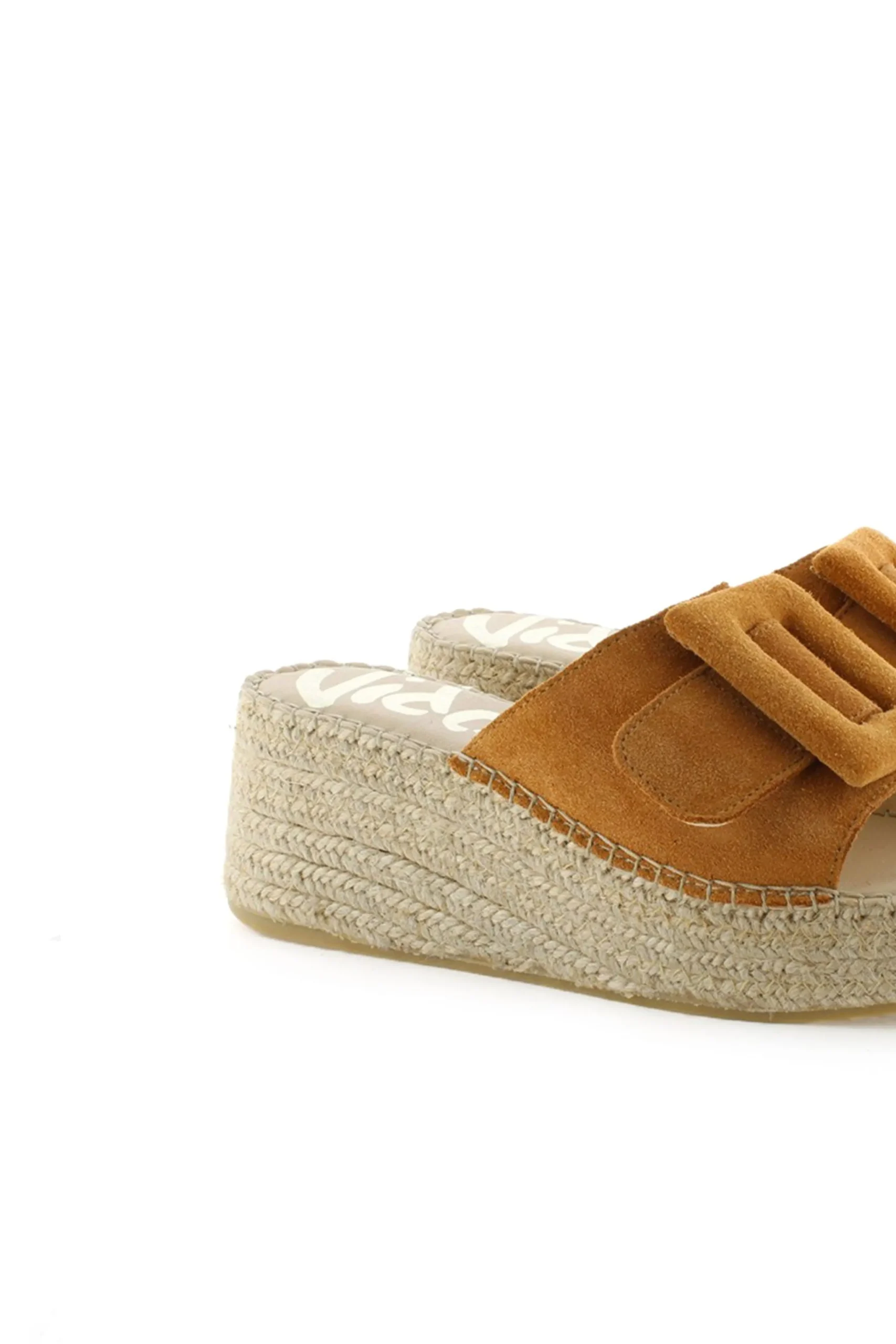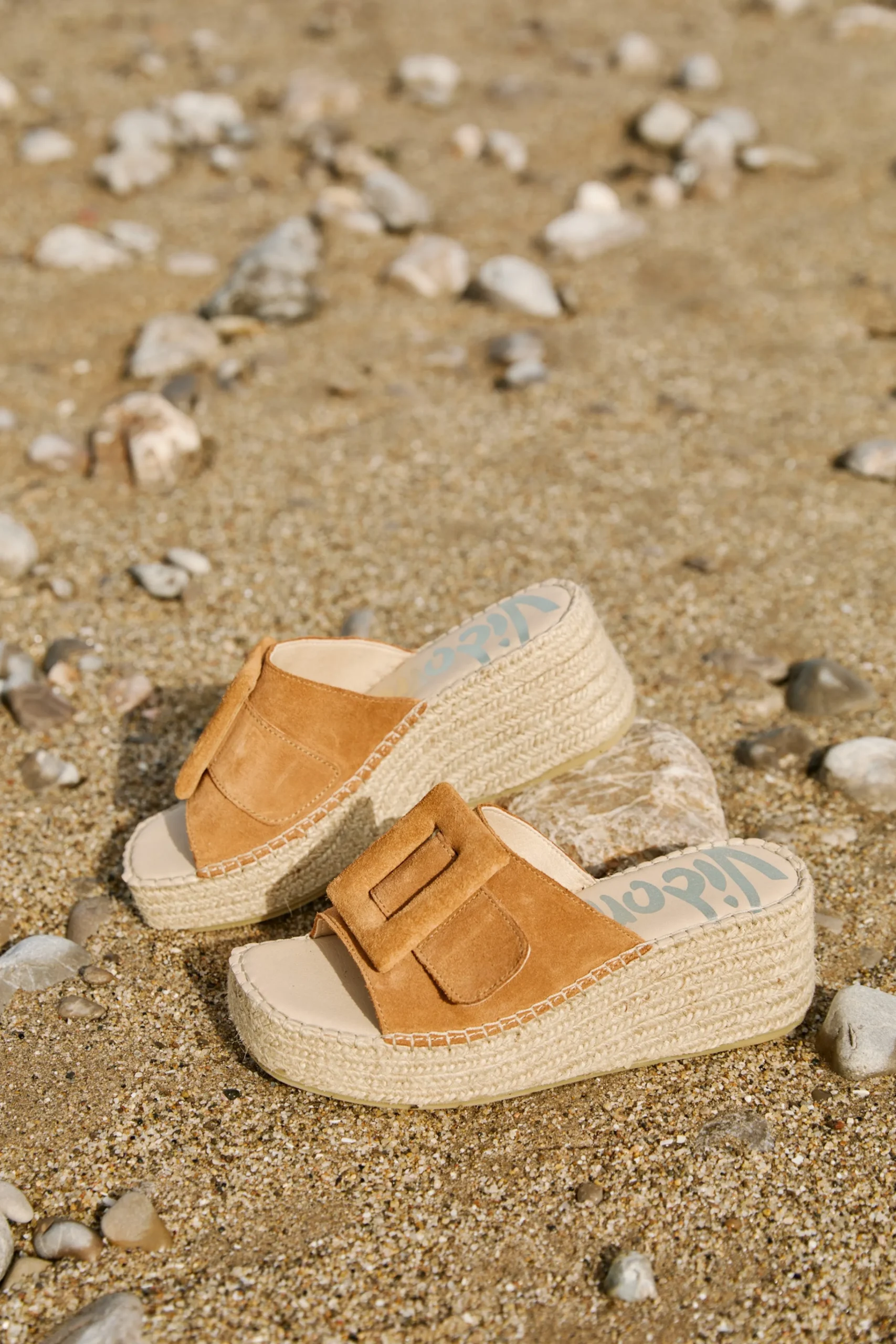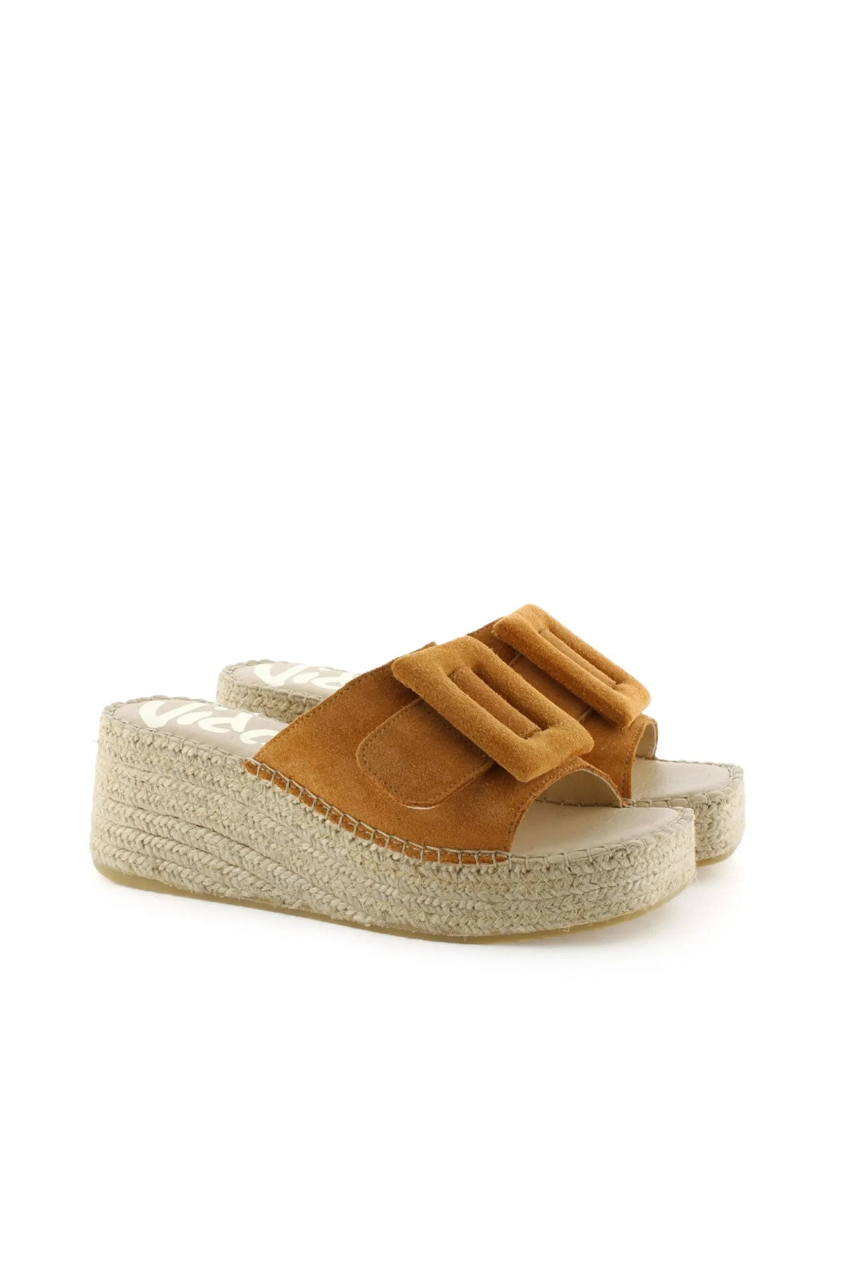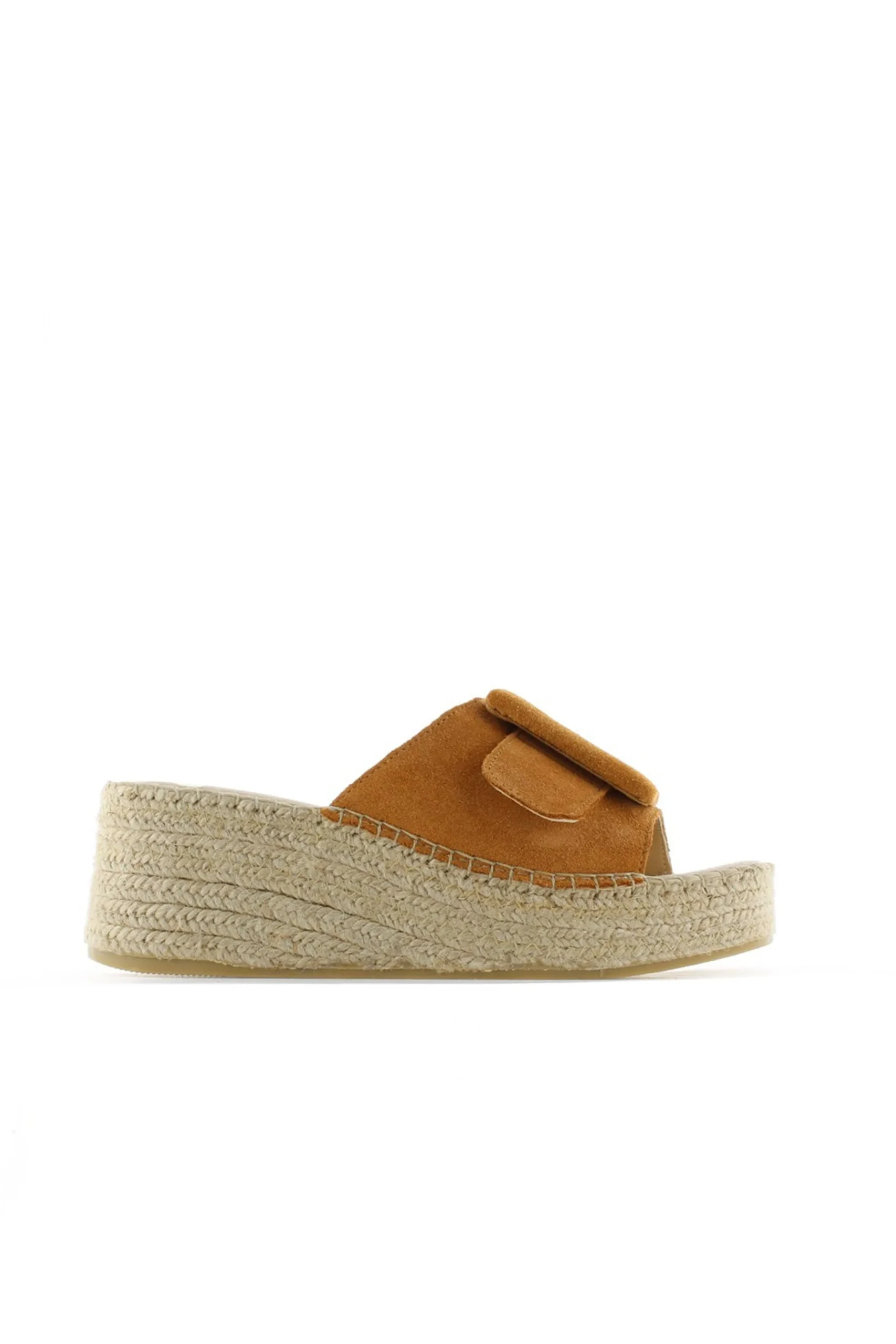 Zueco de cuña de yute natural de 6 cm en serraje color cuero. Plantilla de microfibra transpirable y antibacteriana.